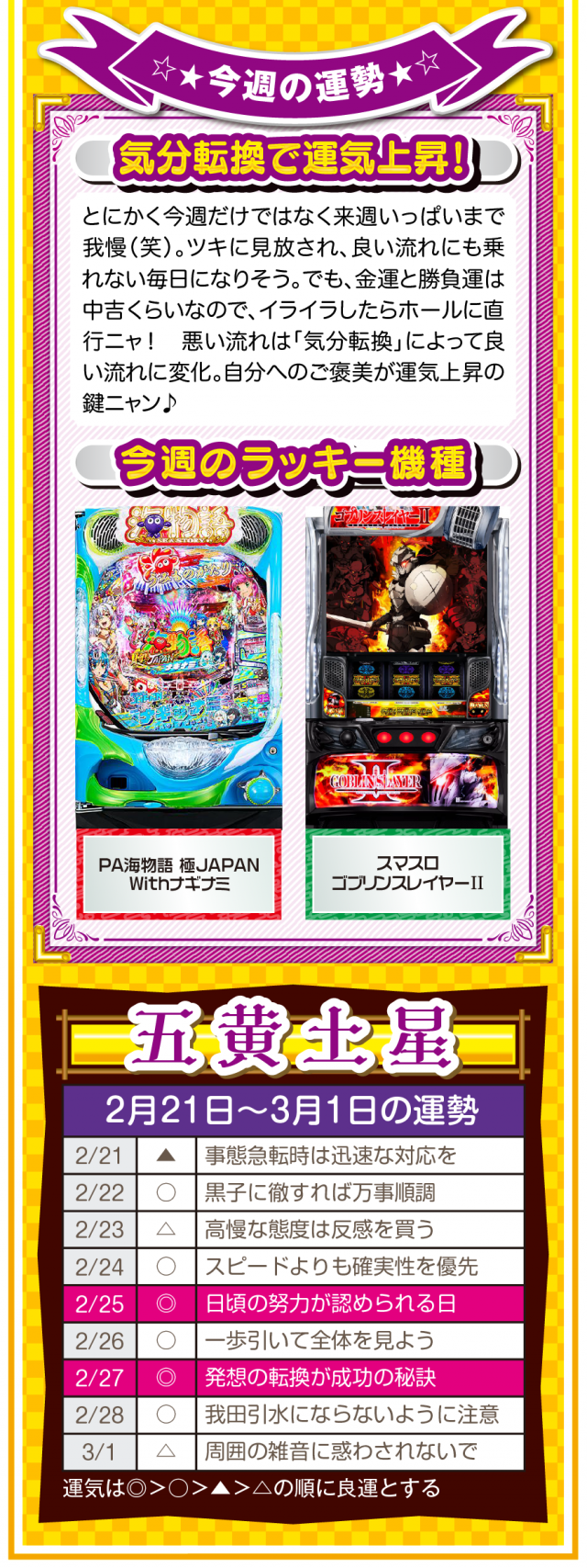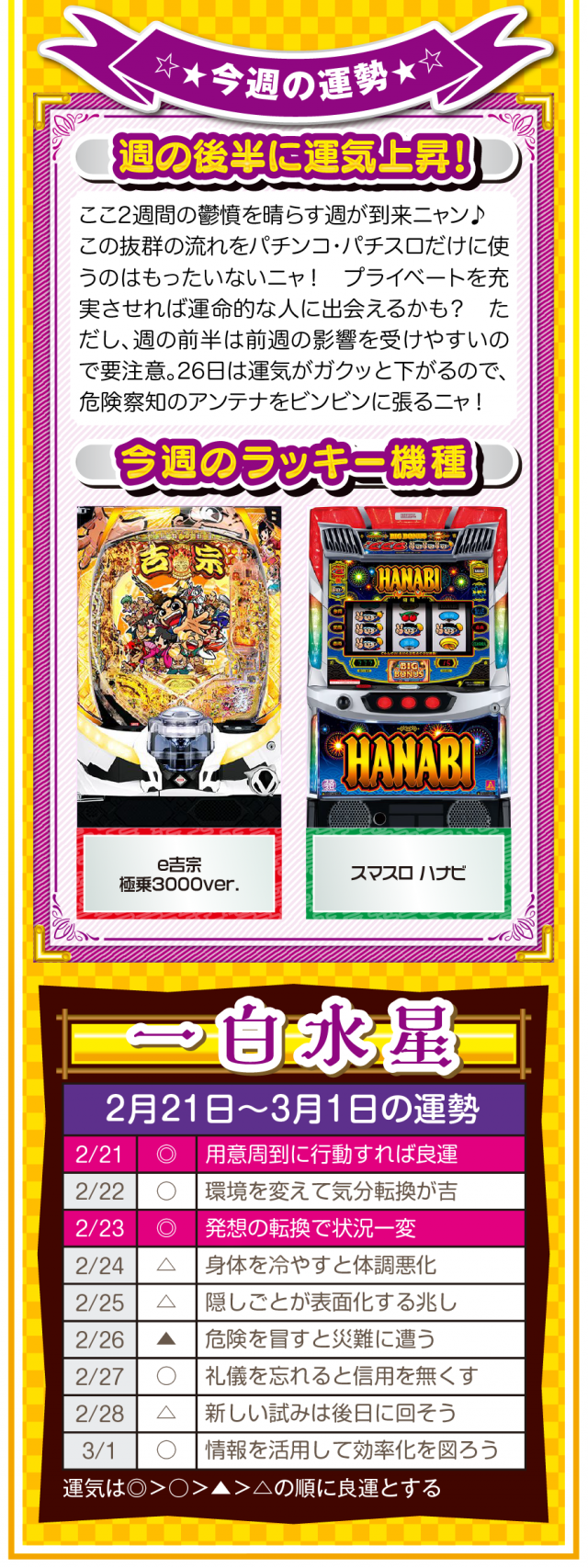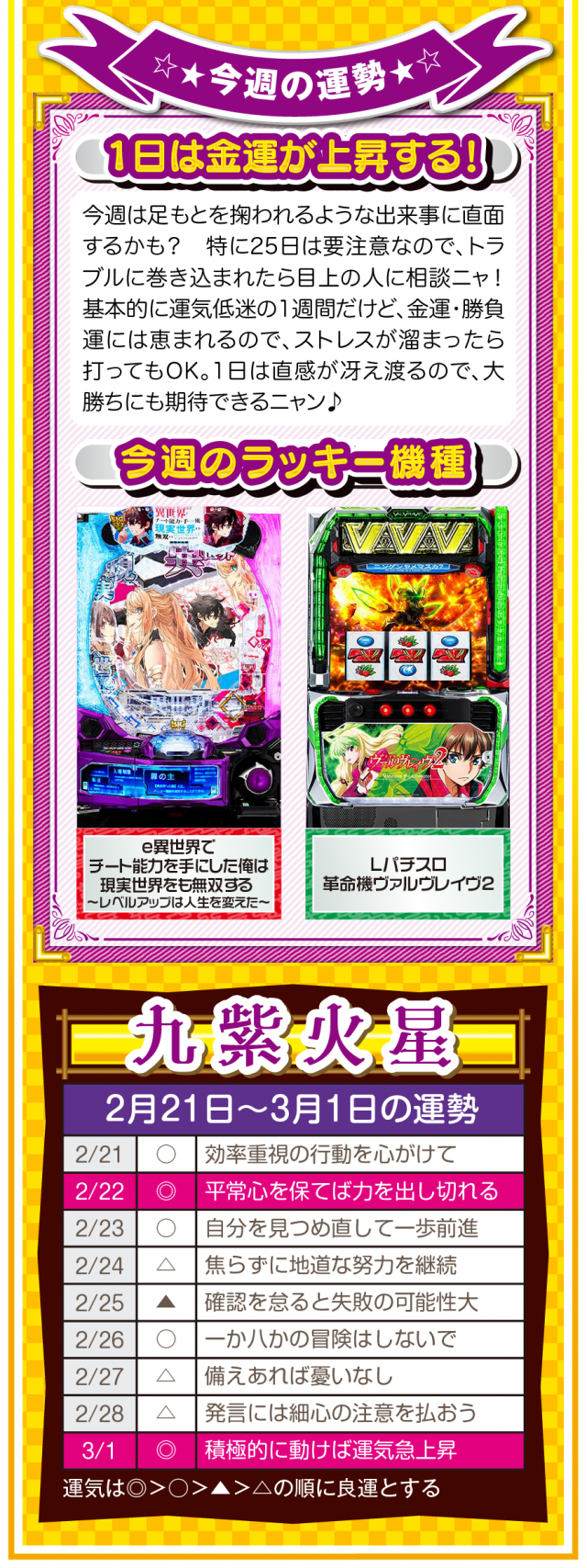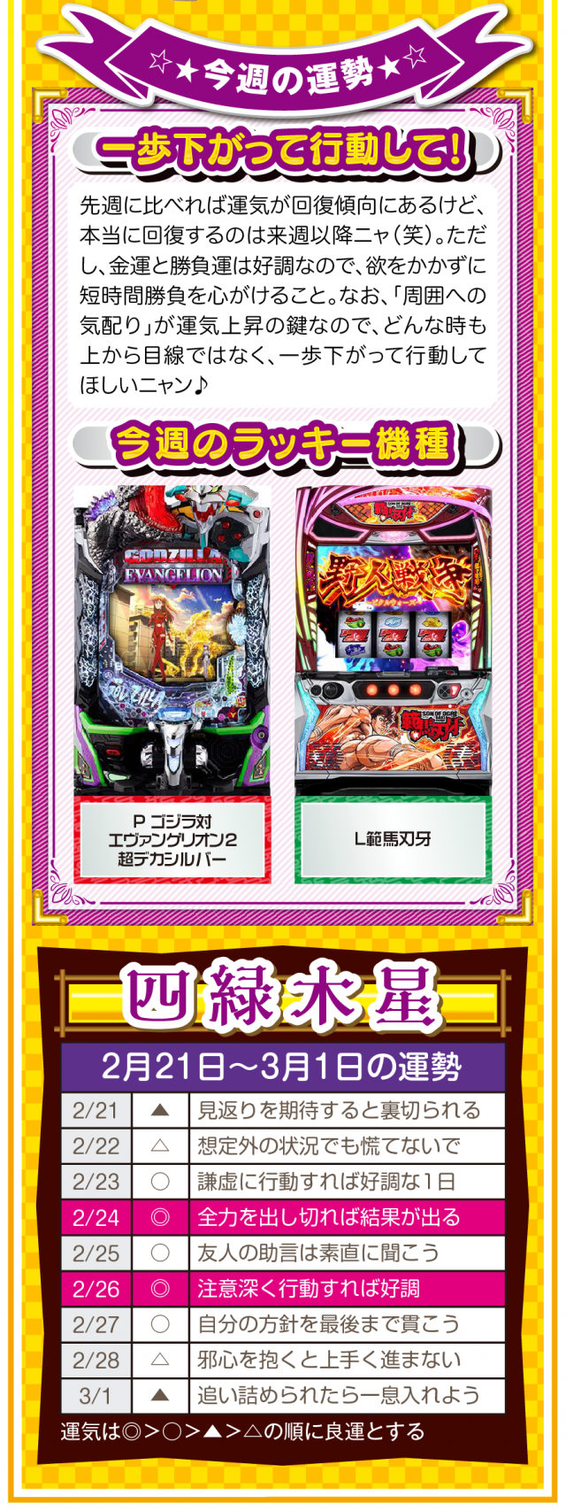 何事も腹八分目を意識すれば、運とかツキの流れを察知する「余裕」も生まれることを覚えておいてほしいニャン♪ というわけで早速、2月23日から3月1日の1週間を鑑定ニャ(ほどほどの距離感で恋愛が出来ないフォー・チュンチュンが、オマケとして2月21日と22日の運勢も鑑定したニャ♡)!
