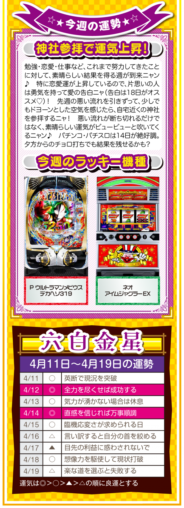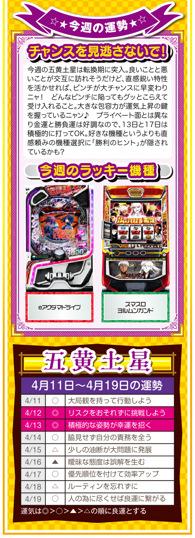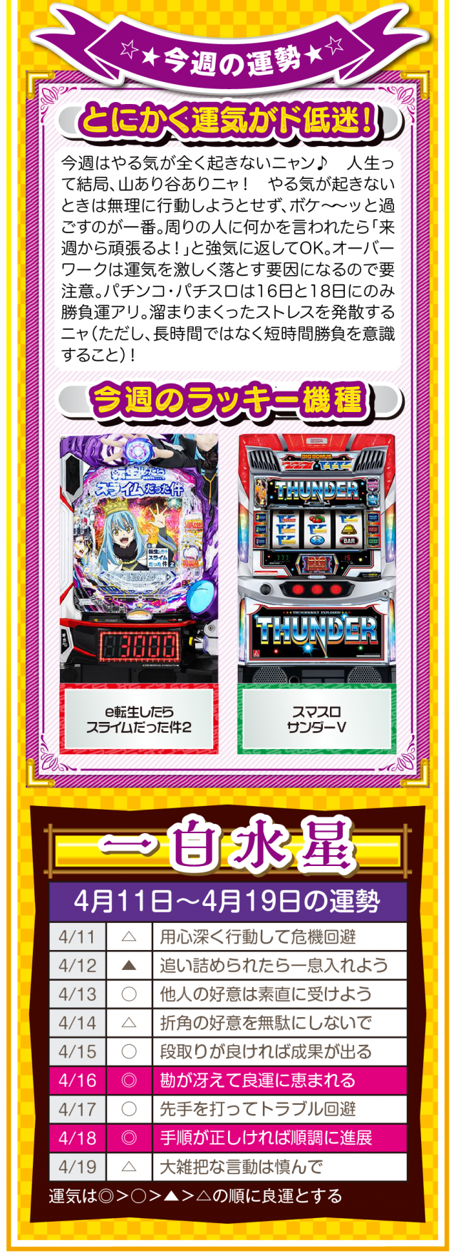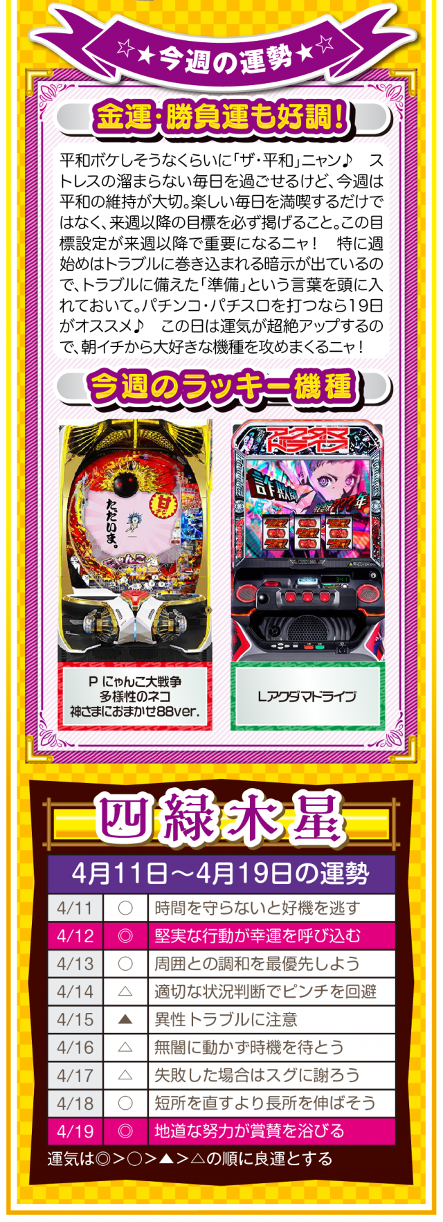 「自分を許す」とは「自分を変える」こと。自分を許せば、他者からも許される。許す、譲る世界線が、あなた自身を成長させ、明るい明日を築くことを覚えておいてほしいニャン♪ というわけで早速、4月13日から19日の1週間を鑑定ニャ(未だ独身であることだけは絶対に許せないフォー・チュンチュンが、オマケとして4月11日と12日の運勢も鑑定したニャン♡)!