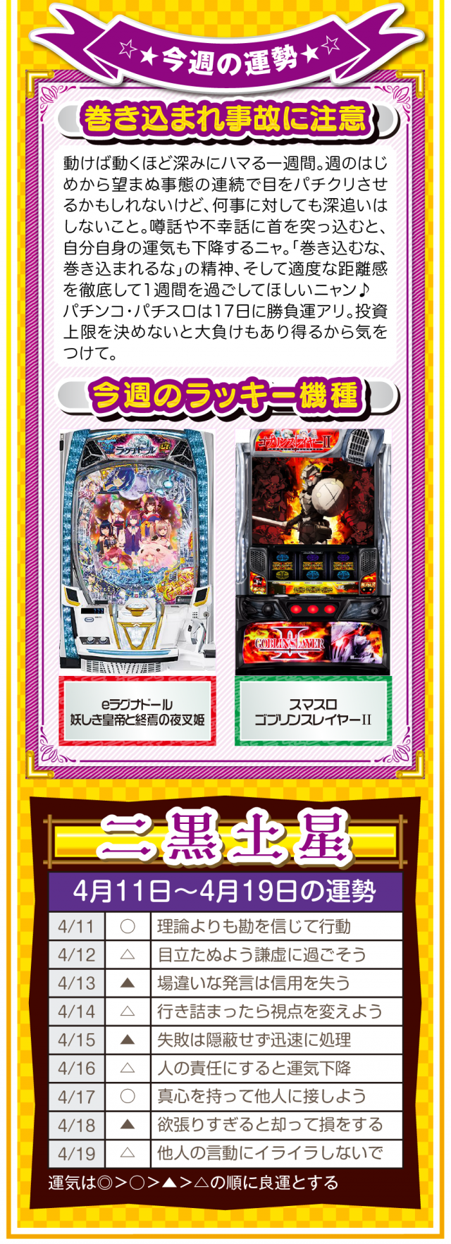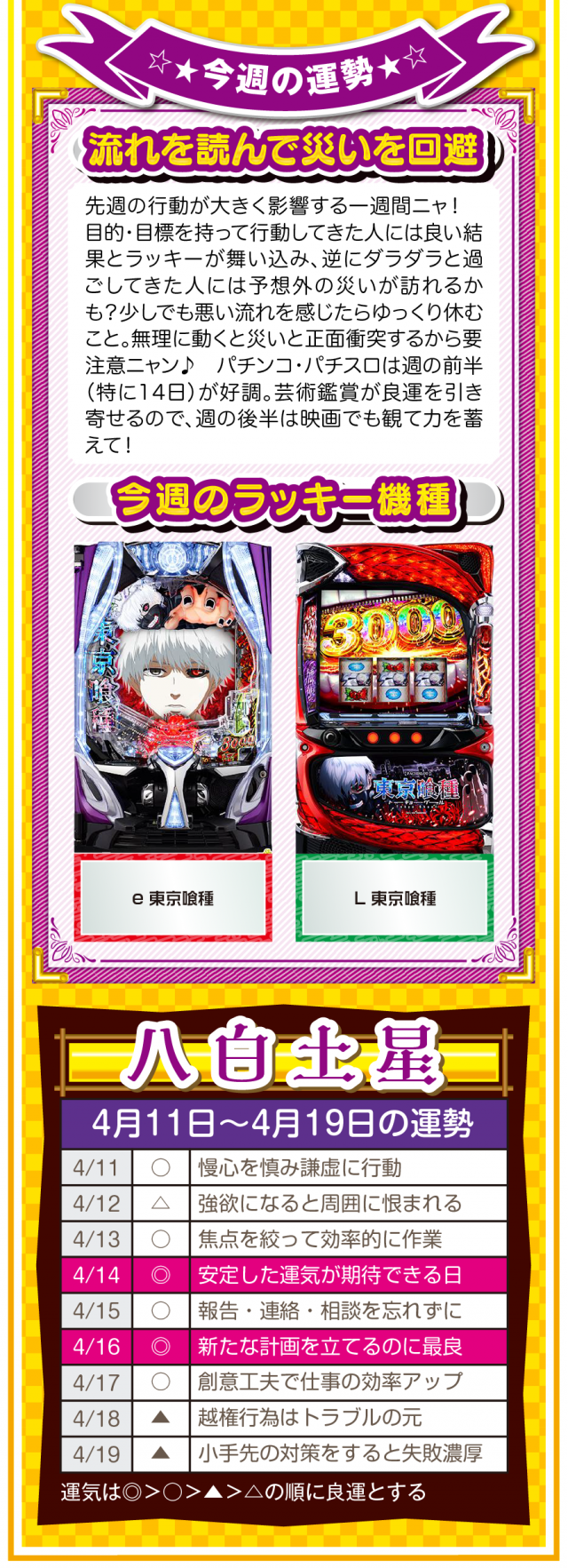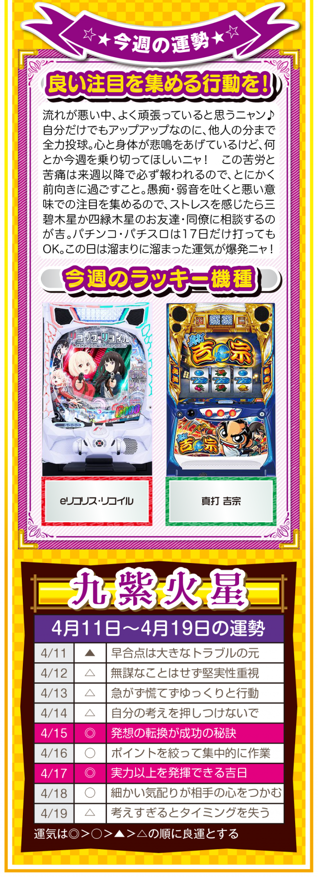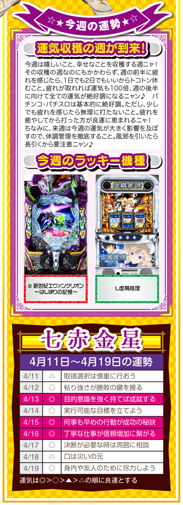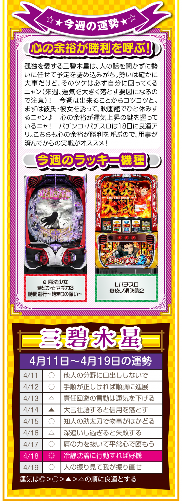 「自分を許す」とは「自分を変える」こと。自分を許せば、他者からも許される。許す、譲る世界線が、あなた自身を成長させ、明るい明日を築くことを覚えておいてほしいニャン♪ というわけで早速、4月13日から19日の1週間を鑑定ニャ(未だ独身であることだけは絶対に許せないフォー・チュンチュンが、オマケとして4月11日と12日の運勢も鑑定したニャン♡)!