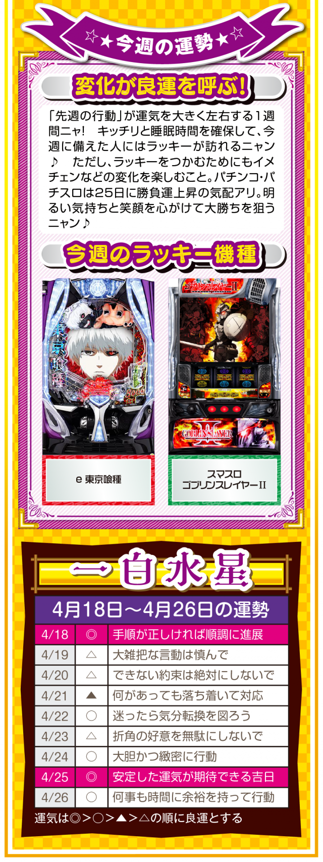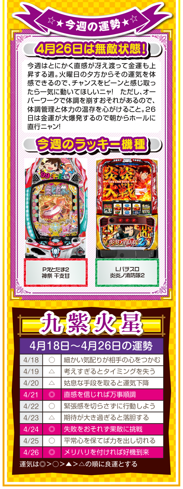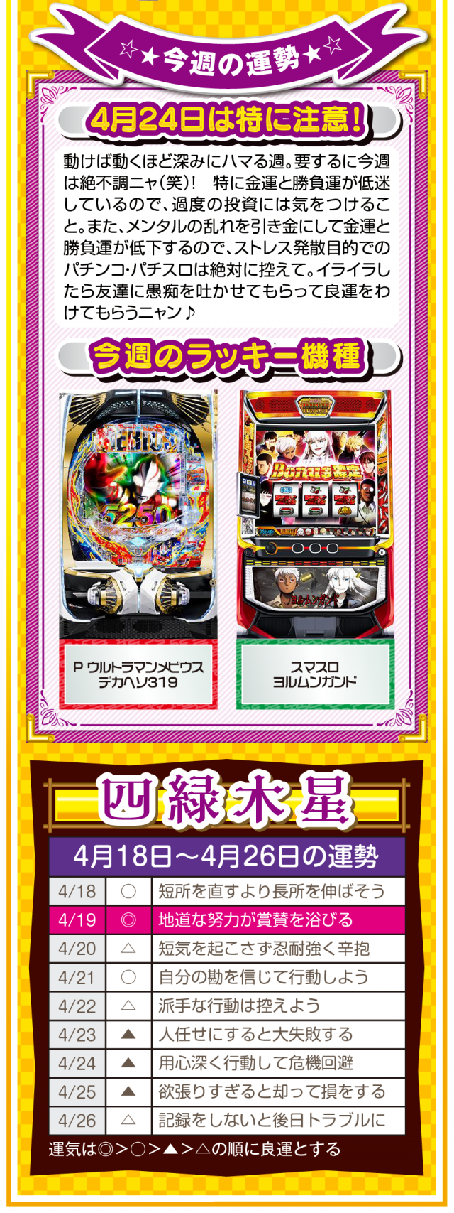 流れが来ないことに悲観せず、愚痴を吐かず、不満を述べる前に、日々の積み重ねを「見直す」ことを覚えておいてほしいニャン♪ というわけで早速、4月20日から26日の1週間を鑑定ニャ(桜花賞を華麗にハズして不満だらけのフォー・チュンチュンが、オマケとして4月18日と19日の運勢も鑑定したニャン♡)!