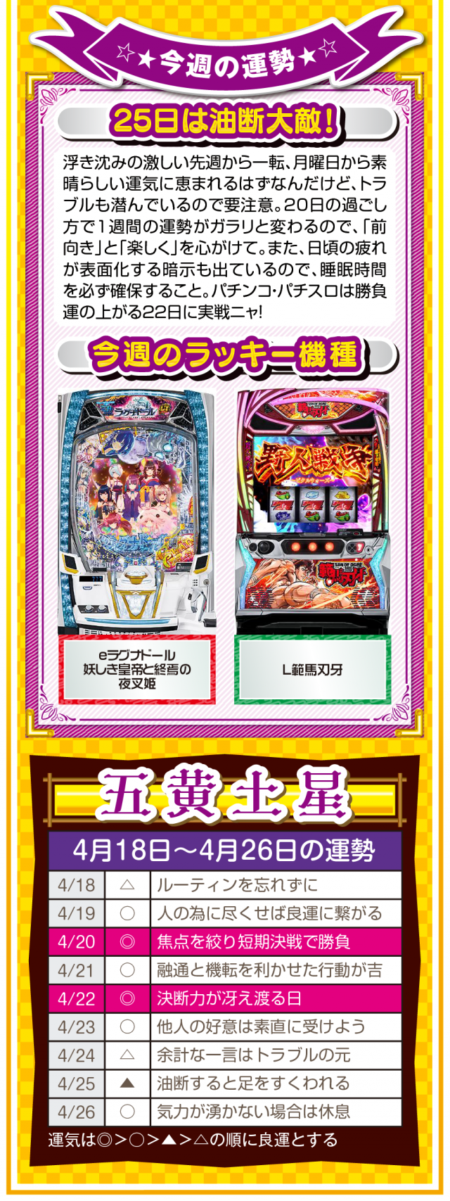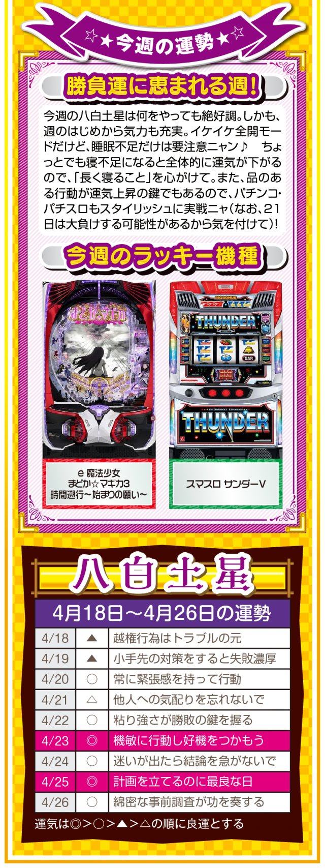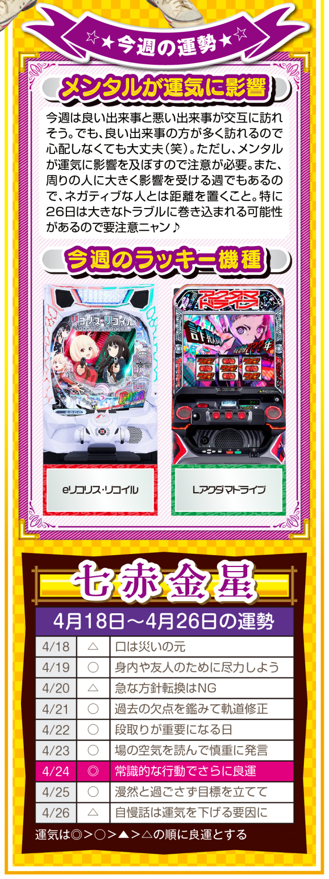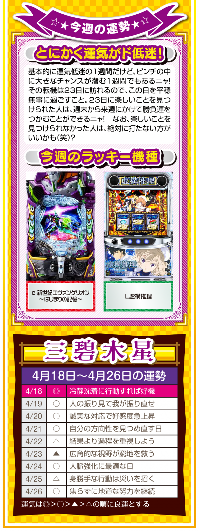 流れが来ないことに悲観せず、愚痴を吐かず、不満を述べる前に、日々の積み重ねを「見直す」ことを覚えておいてほしいニャン♪ というわけで早速、4月20日から26日の1週間を鑑定ニャ(桜花賞を華麗にハズして不満だらけのフォー・チュンチュンが、オマケとして4月18日と19日の運勢も鑑定したニャン♡)!