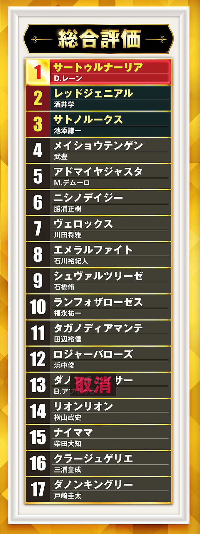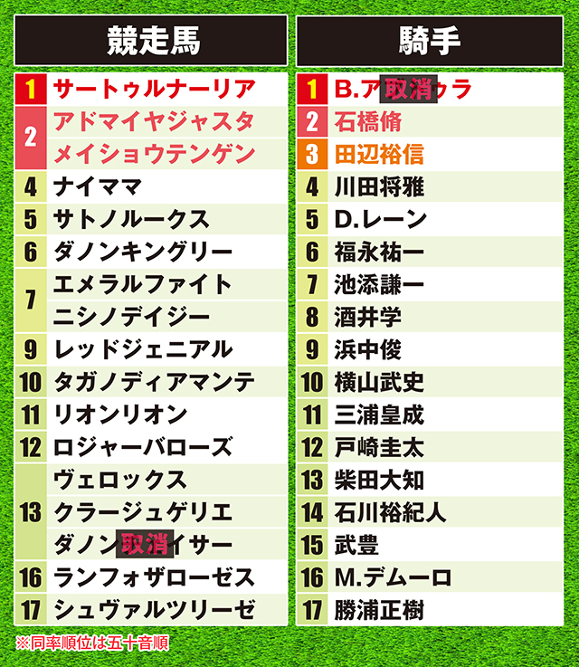 あ、枠順決定前に占っているので、ダノンチェイサー(B.アブドゥラ騎手)がランキングに入っているニャ。そして、抽選枠だったヴィントとマイネルサーパスは対象外になっているけど、もしきた場合は……ごめんなのニャッ。