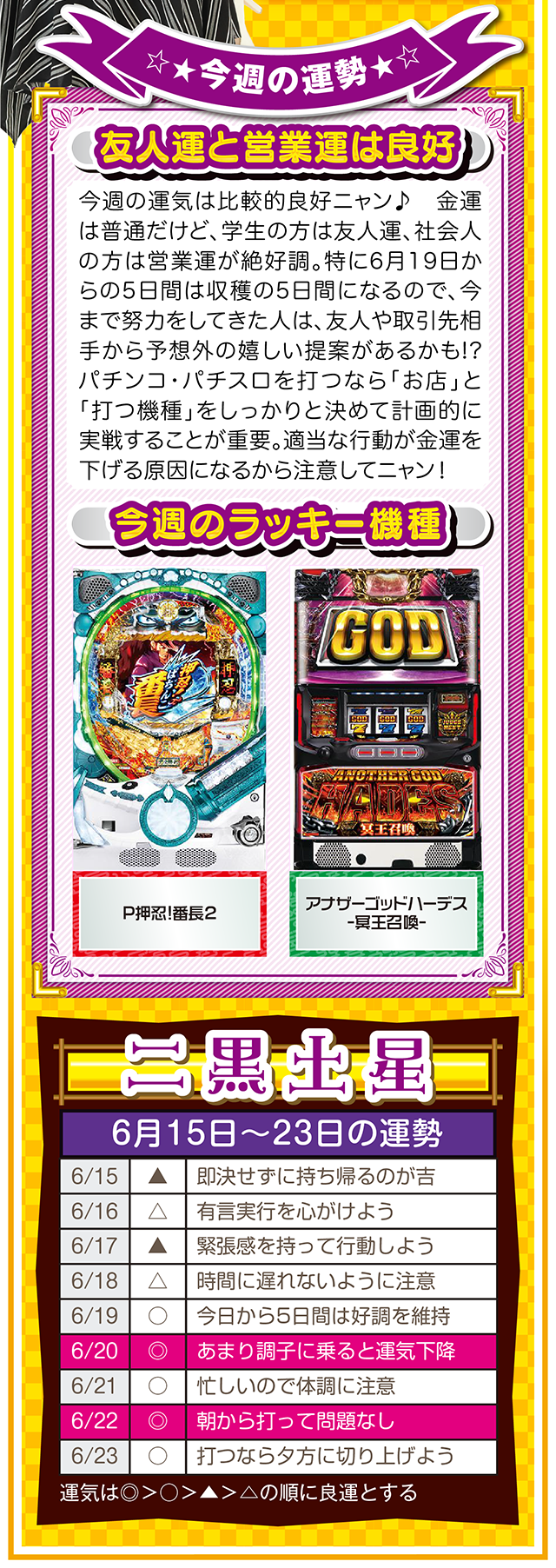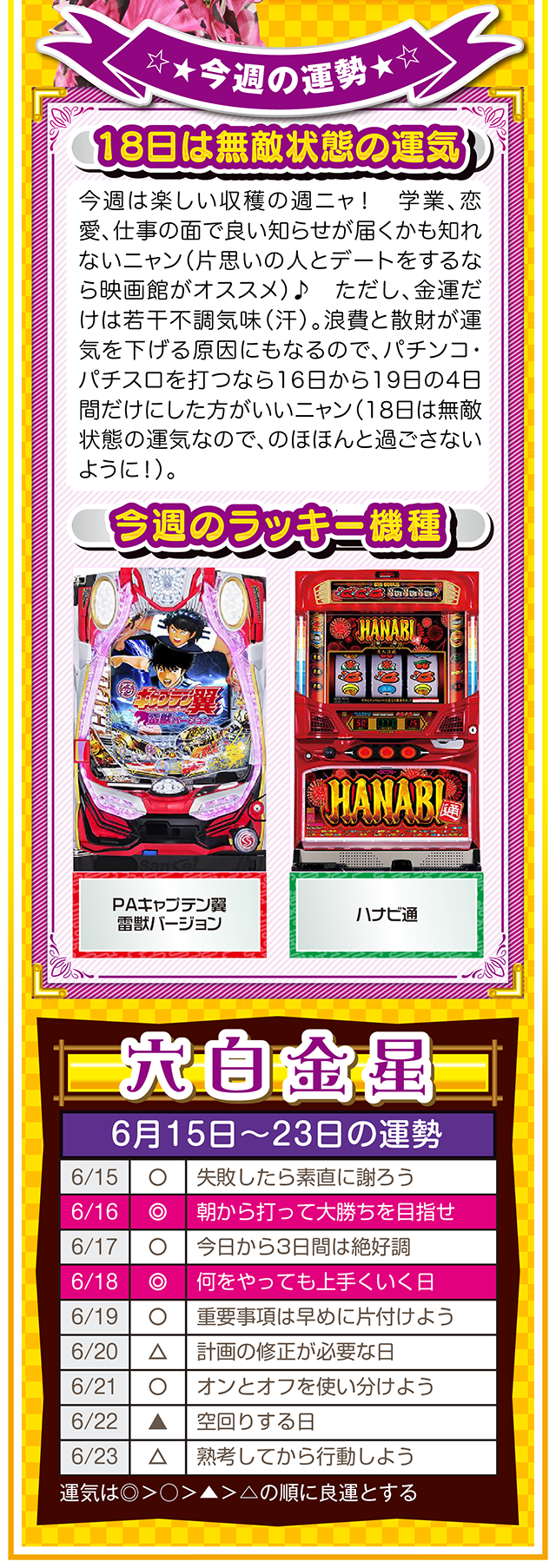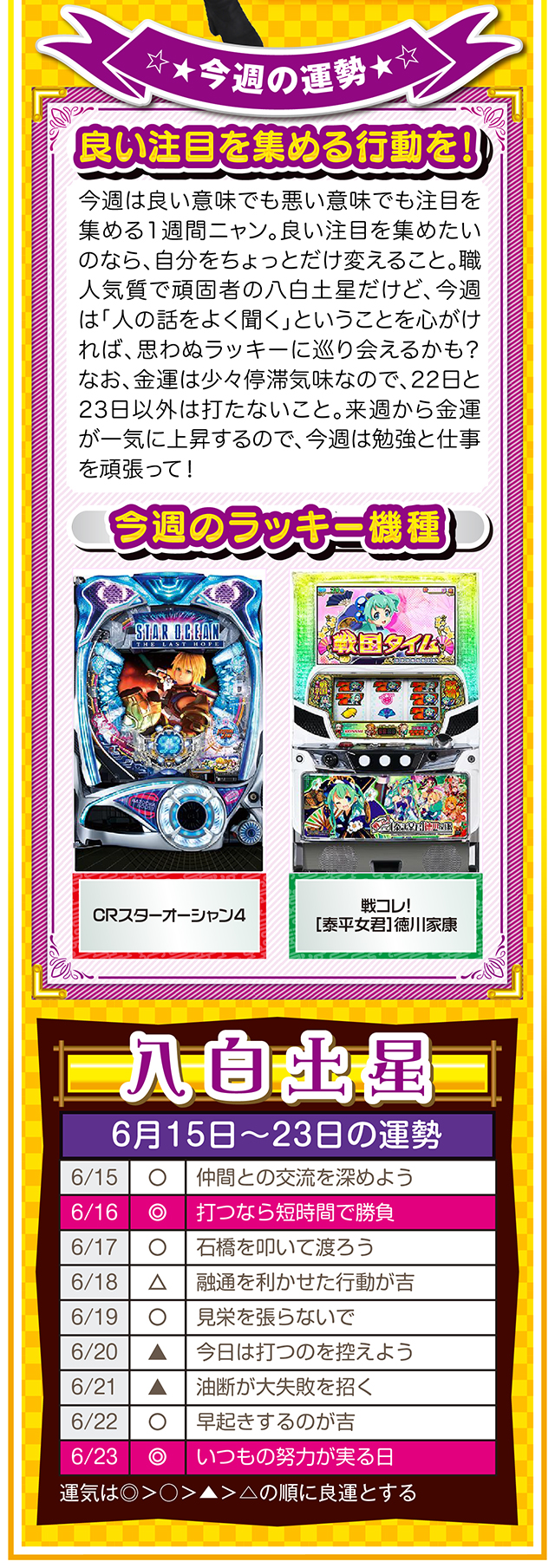 ![勉強と仕事を頑張ろう! <6月の吉方位> 南 <金運> 普通(★3) <ラッキーアイテム> 八角形の鏡 <運勢見出し&文章> 良い注目を集める行動を! 今週は良い意味でも悪い意味でも注目を集める1週間ニャン。良い注目を集めたいのなら、自分をちょっとだけ変えること。職人気質で頑固者の八白土星だけど、今週は「人の話を良く聞く」ということを心がければ、思わぬラッキーに巡り会えるかも? なお、金運は少々停滞気味なので、22日と23日以外は打たないこと。来週から金運が一気に上昇するので、今週は勉強と仕事を頑張って! <ラッキー機種> CRスターオーシャン4 戦コレ![泰平女君]徳川家康 6/15○仲間との交流を深めよう 6/16◎打つなら短時間で勝負 6/17○石橋を叩いて渡ろう 6/18△融通を利かせた行動が吉 6/19○見栄を張らないで 6/20▲今日は打つのを控えよう 6/21▲油断が大失敗を招く 6/22○早起きするのが吉 6/23◎いつもの努力が実る日](https://cdn.p-town.dmm.com/writer/92/19.06.17-23/8_6.15-6.23_1.png)