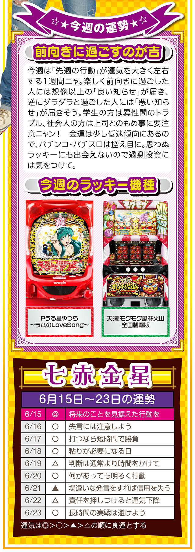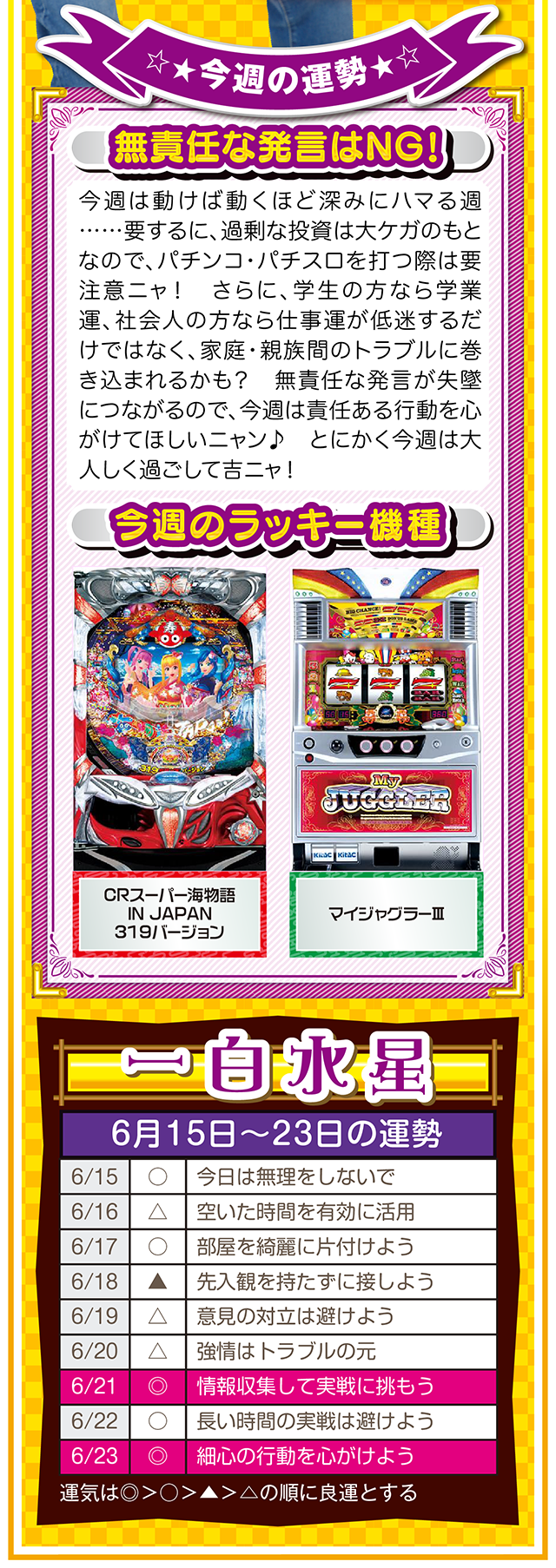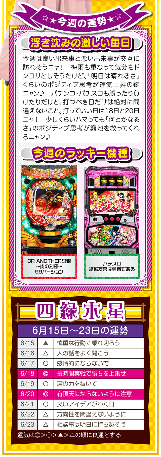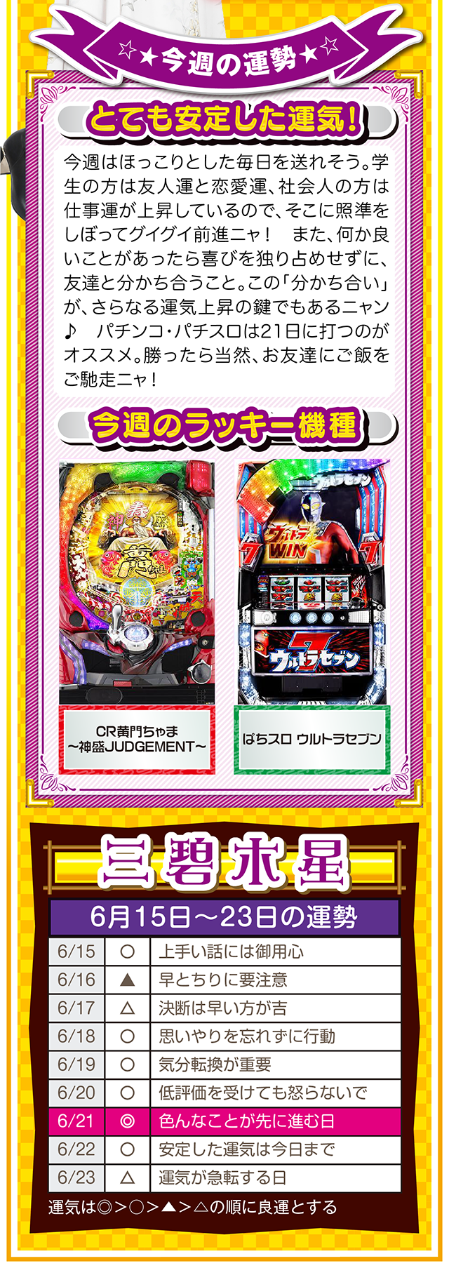 ![勉強と仕事を頑張ろう! <6月の吉方位> 南 <金運> 普通(★3) <ラッキーアイテム> 八角形の鏡 <運勢見出し&文章> 良い注目を集める行動を! 今週は良い意味でも悪い意味でも注目を集める1週間ニャン。良い注目を集めたいのなら、自分をちょっとだけ変えること。職人気質で頑固者の八白土星だけど、今週は「人の話を良く聞く」ということを心がければ、思わぬラッキーに巡り会えるかも? なお、金運は少々停滞気味なので、22日と23日以外は打たないこと。来週から金運が一気に上昇するので、今週は勉強と仕事を頑張って! <ラッキー機種> CRスターオーシャン4 戦コレ![泰平女君]徳川家康 6/15○仲間との交流を深めよう 6/16◎打つなら短時間で勝負 6/17○石橋を叩いて渡ろう 6/18△融通を利かせた行動が吉 6/19○見栄を張らないで 6/20▲今日は打つのを控えよう 6/21▲油断が大失敗を招く 6/22○早起きするのが吉 6/23◎いつもの努力が実る日](https://cdn.p-town.dmm.com/writer/92/19.06.17-23/8_6.15-6.23_1.png)