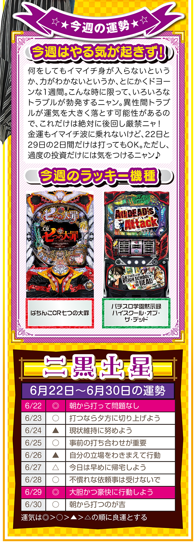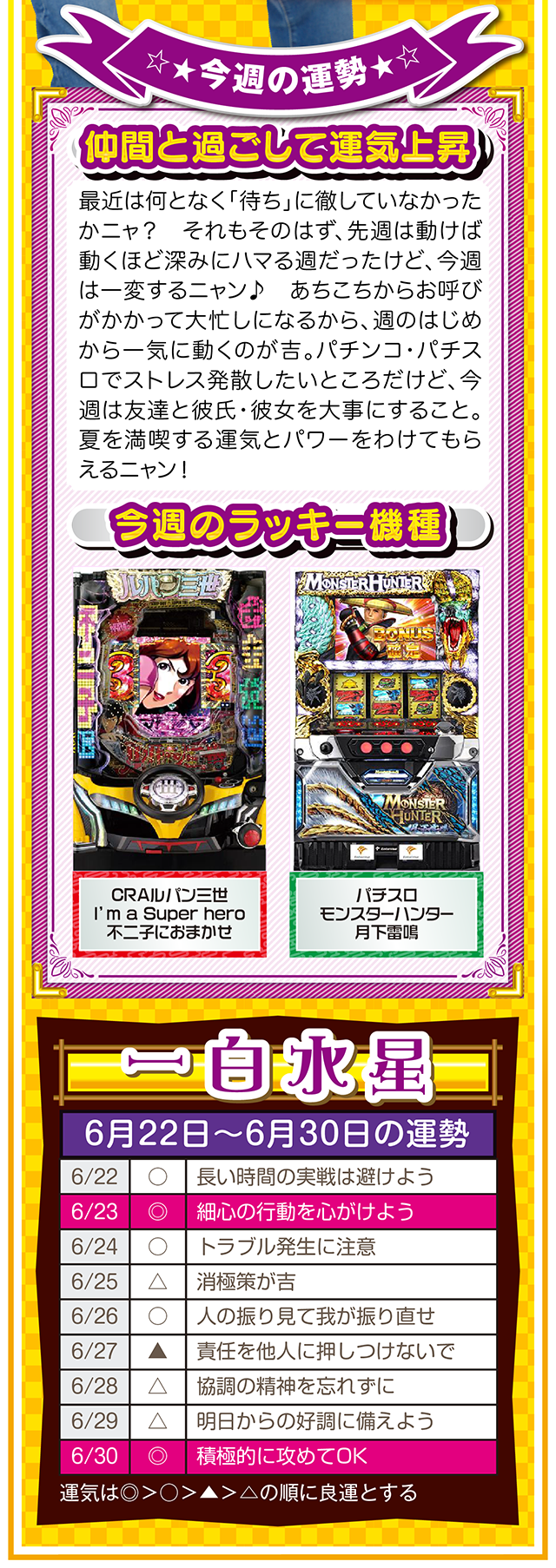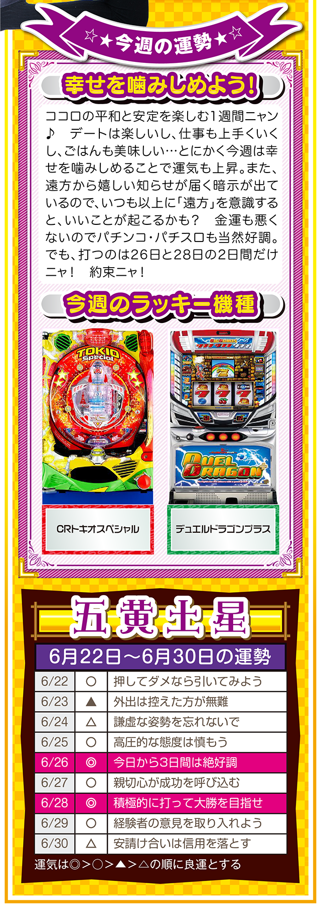 世の男性諸君、妬み、怨み、僻みの女性には要注意ニャ……というわけで早速、6月24日から30日の1週間を鑑定ニャ(ラッキーを五感で感じつつ、オマケとして6月22日と23日の運勢も鑑定したニャン♡)!