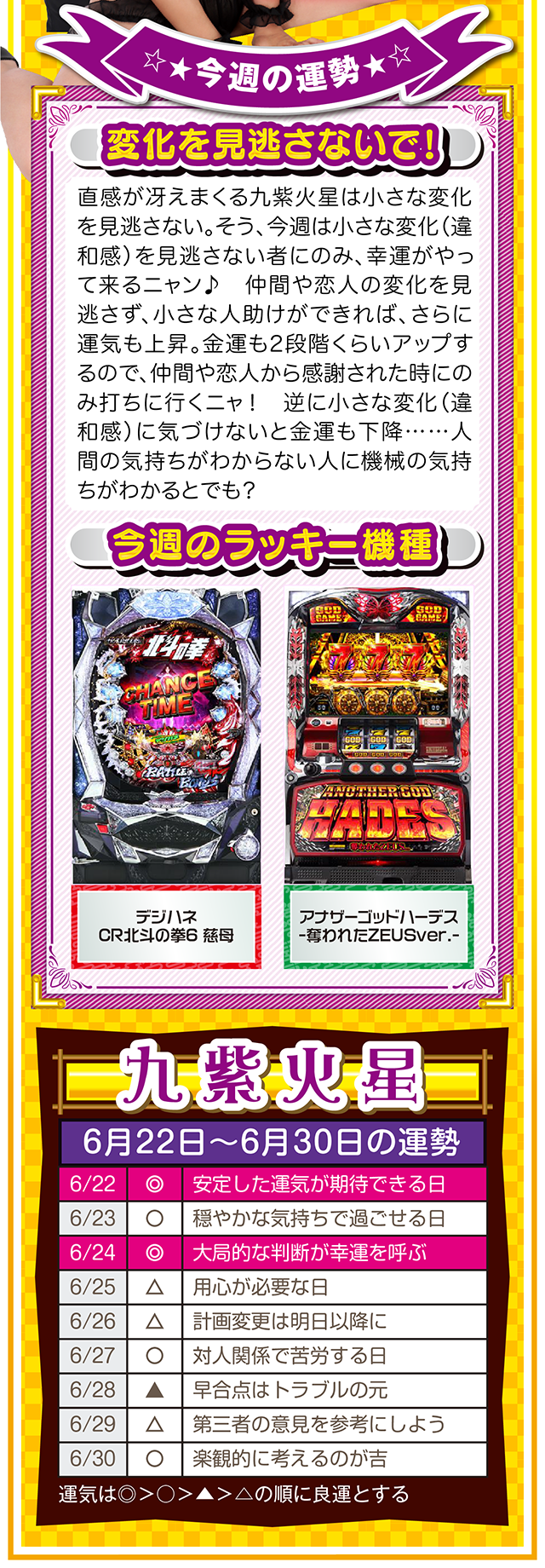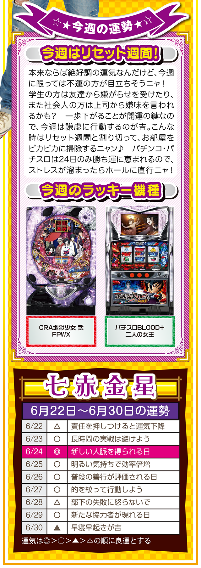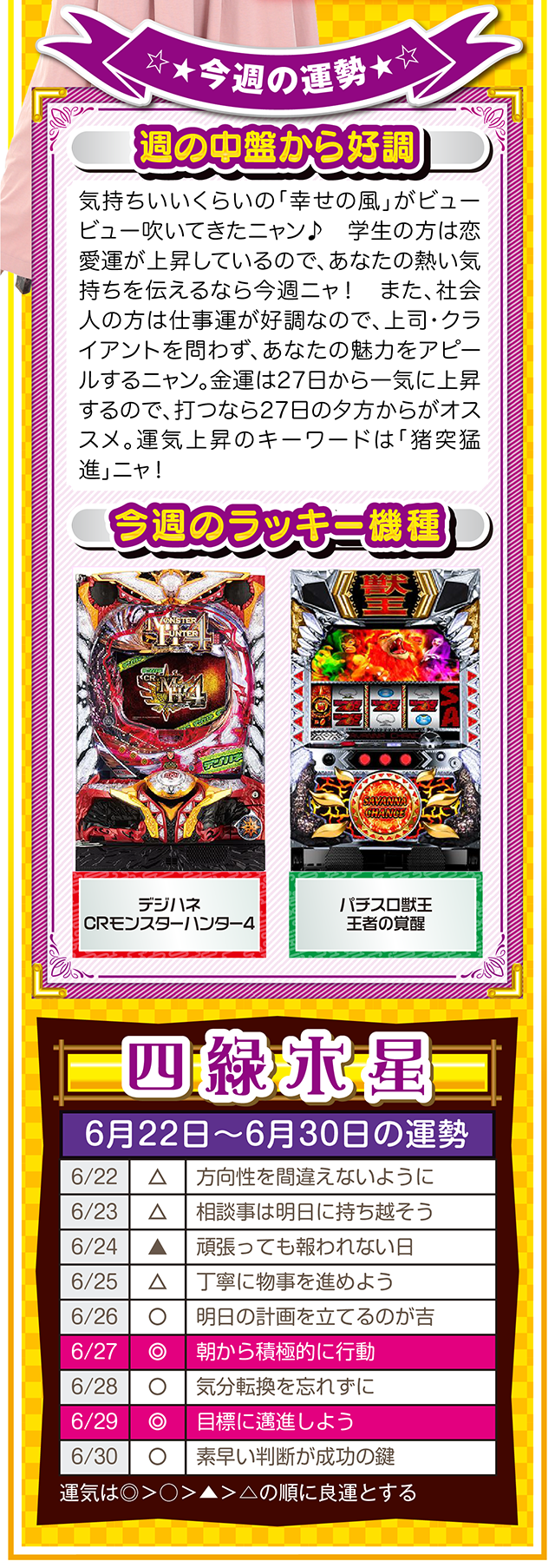 世の男性諸君、妬み、怨み、僻みの女性には要注意ニャ……というわけで早速、6月24日から30日の1週間を鑑定ニャ(ラッキーを五感で感じつつ、オマケとして6月22日と23日の運勢も鑑定したニャン♡)!