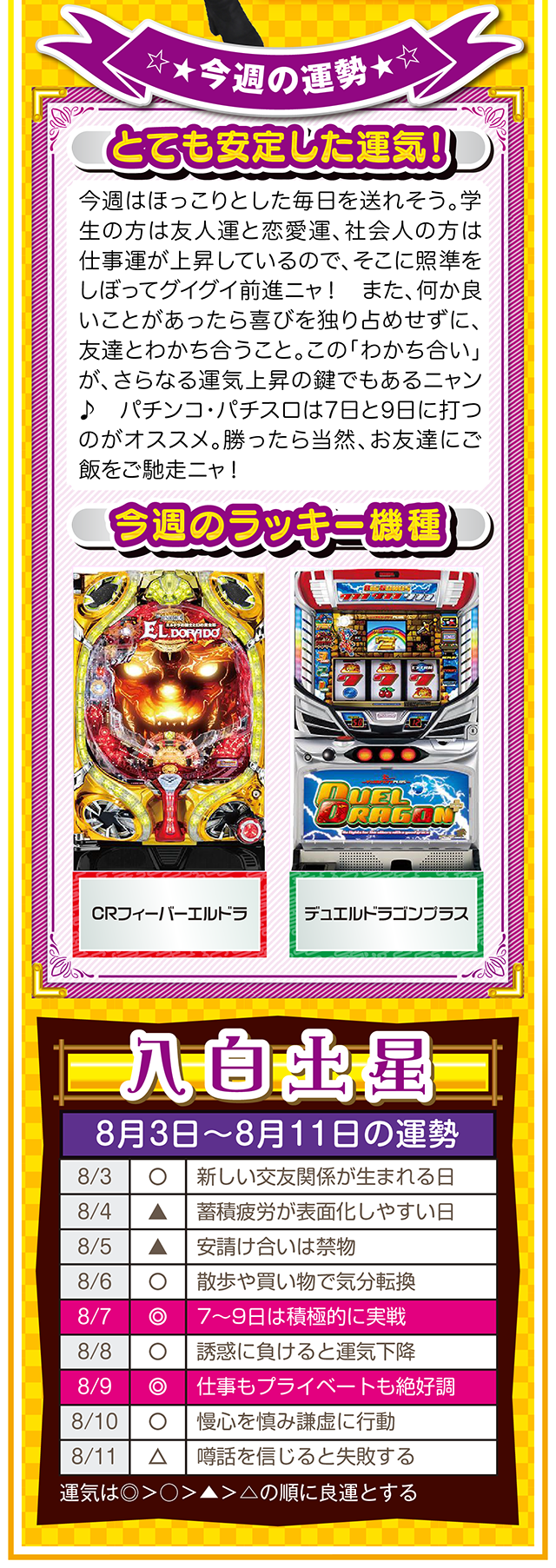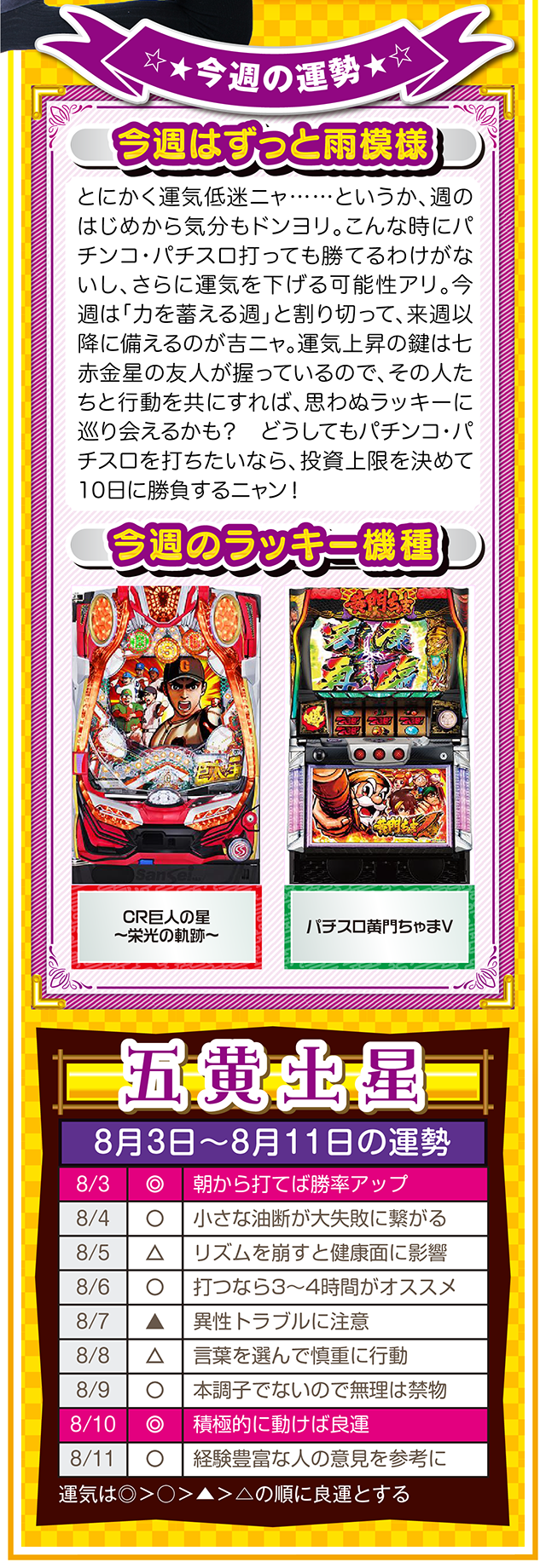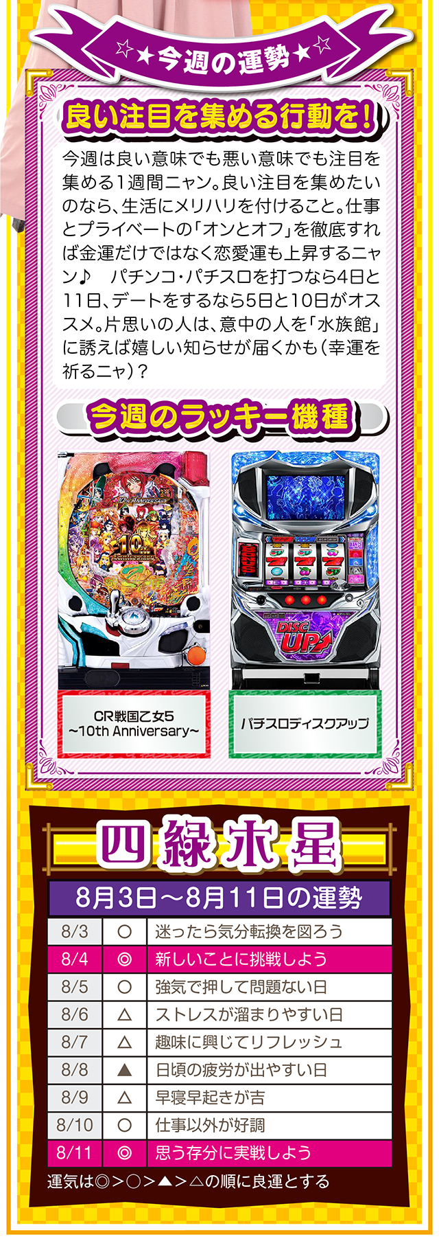 苦手なこと、短所などを克服していく「姿勢」が可能性を広げ、その可能性が「運とツキ」を呼び込む機会を増やしてくれることを覚えてほしいニャン……というわけで早速、8月5日から11日の1週間を鑑定ニャ(超苦手なセロリを口に頬張りつつ、オマケとして8月3日と4日の運勢も鑑定したニャン♡)!