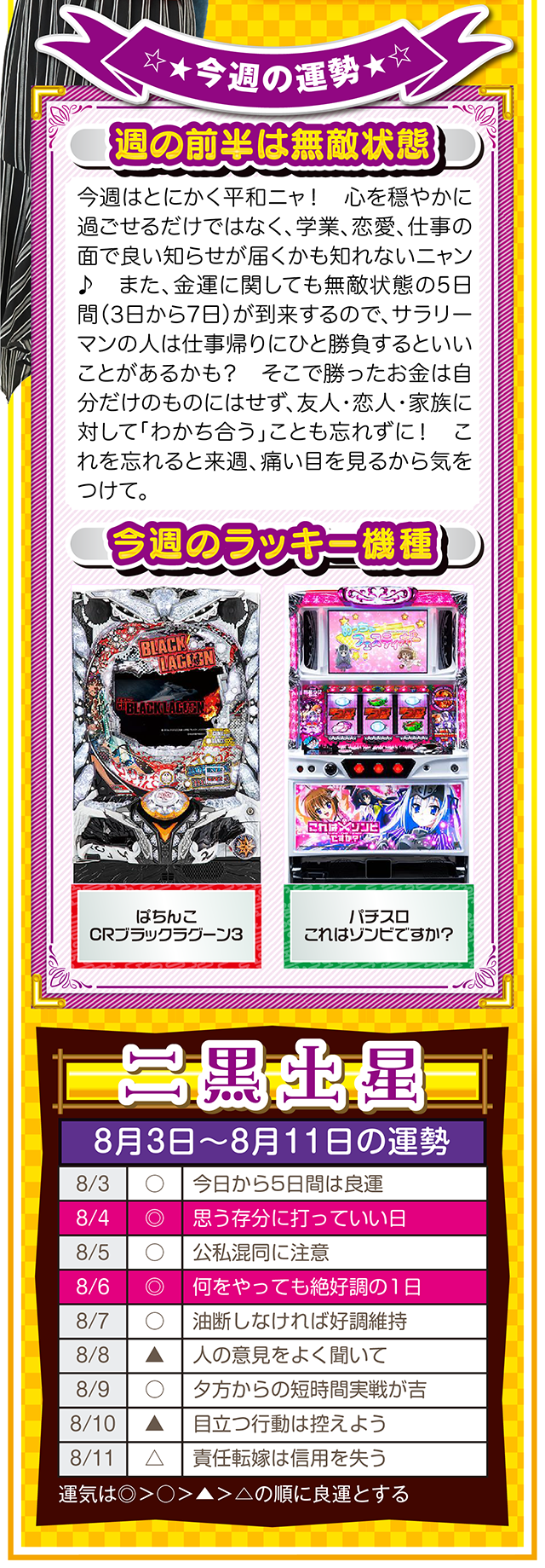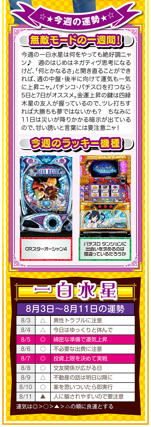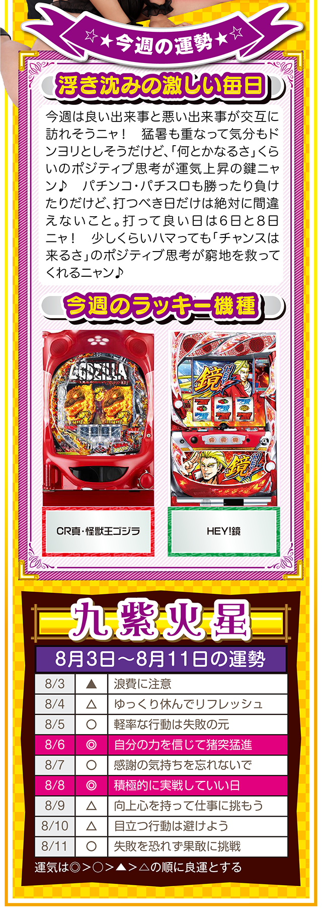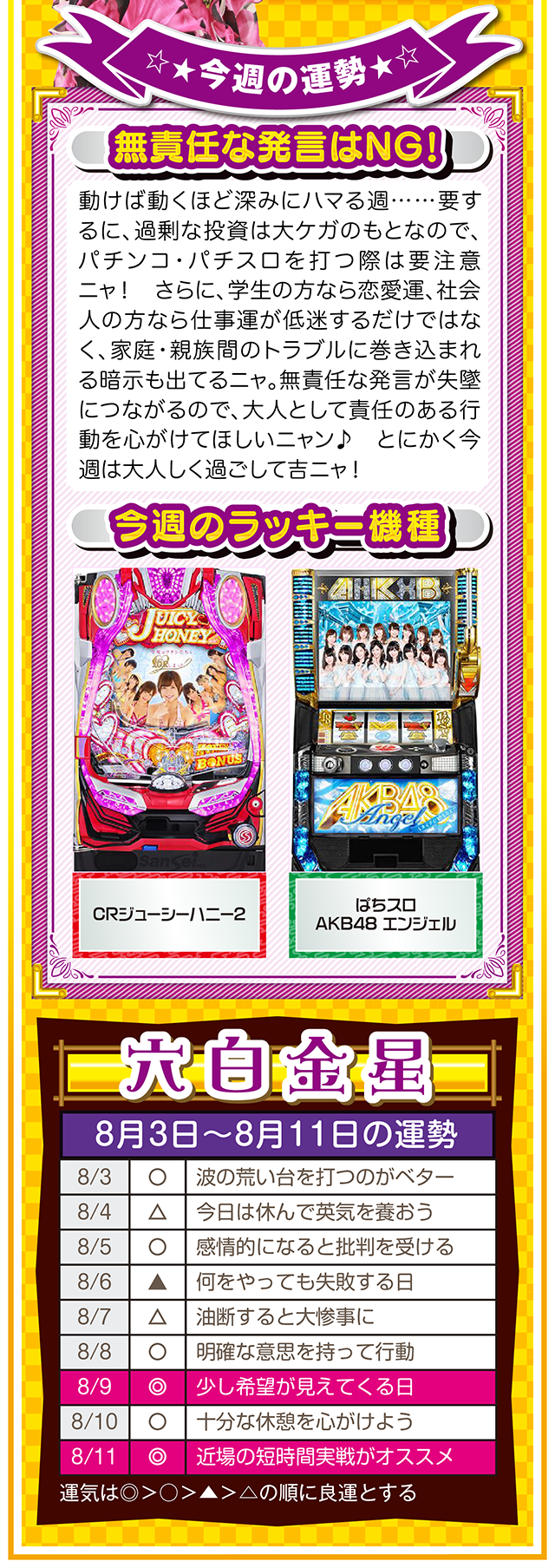 苦手なこと、短所などを克服していく「姿勢」が可能性を広げ、その可能性が「運とツキ」を呼び込む機会を増やしてくれることを覚えてほしいニャン……というわけで早速、8月5日から11日の1週間を鑑定ニャ(超苦手なセロリを口に頬張りつつ、オマケとして8月3日と4日の運勢も鑑定したニャン♡)!