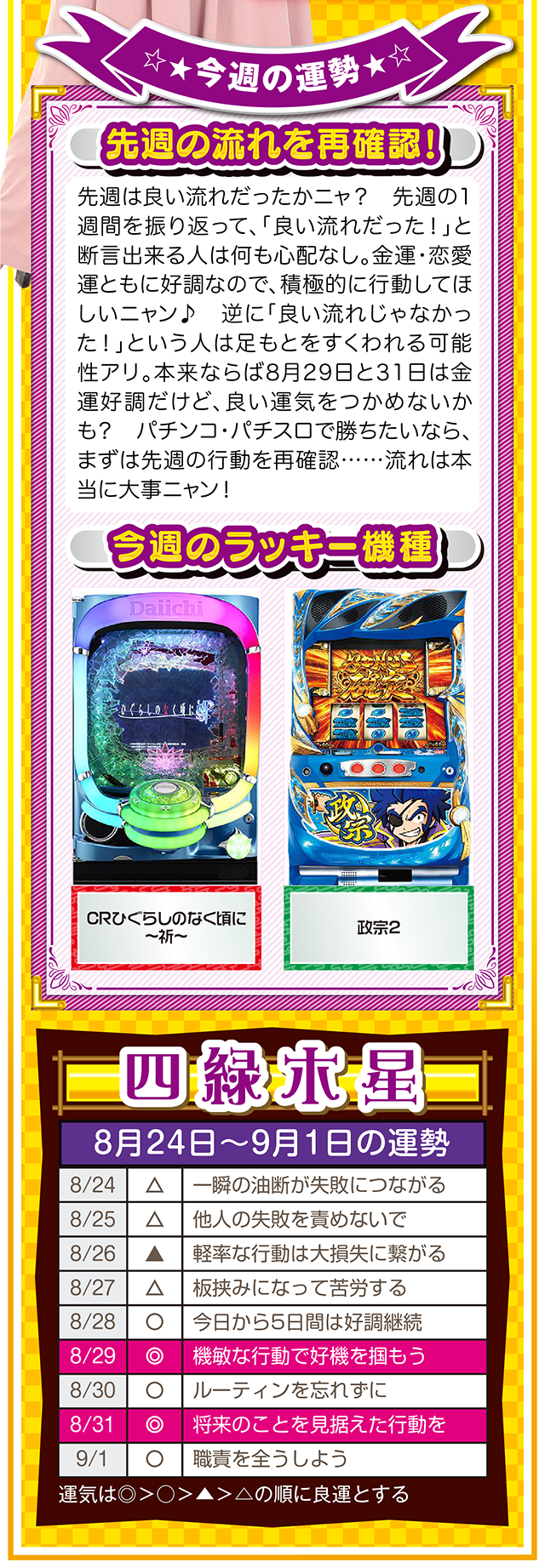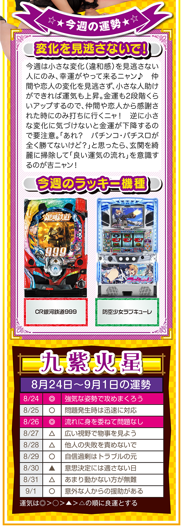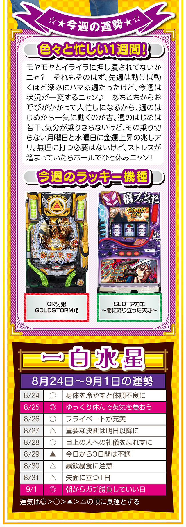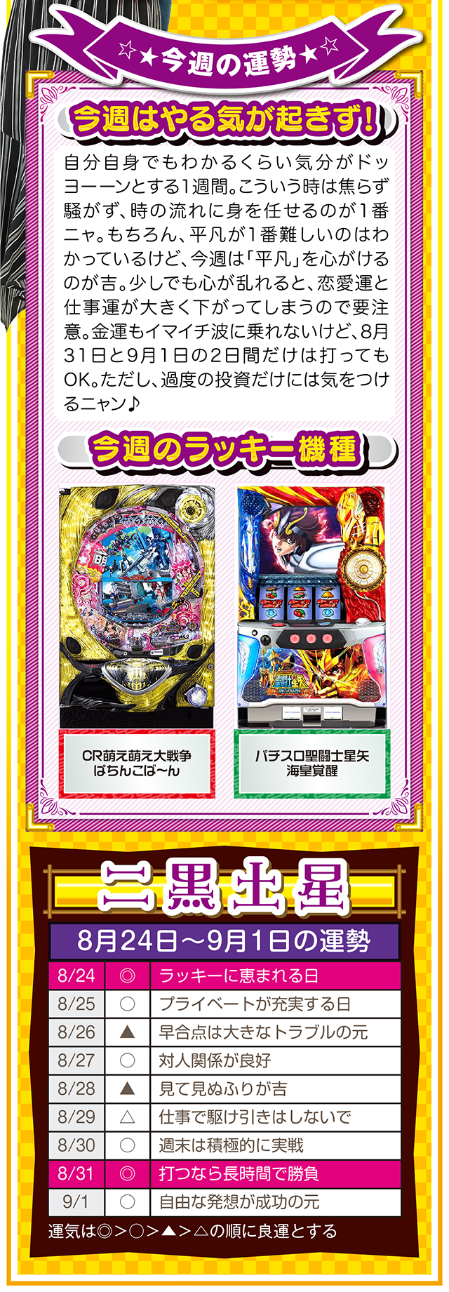 食べたくないものを食べる、触れたくないものと触れると「良い運気は遠ざかる」ということを覚えておいてほしいニャン……というわけで早速、8月26日から9月1日の1週間を鑑定ニャ(婚活パーティーに惨敗してカロリーを気にせずプッチンプリンを3個ヤケ食いした後に、オマケとして8月24日と25日の運勢も鑑定したニャン♡)!