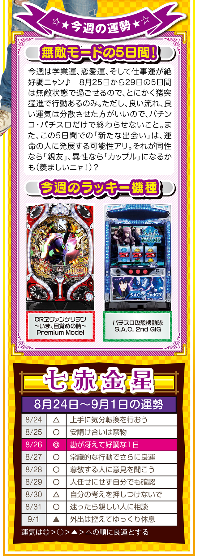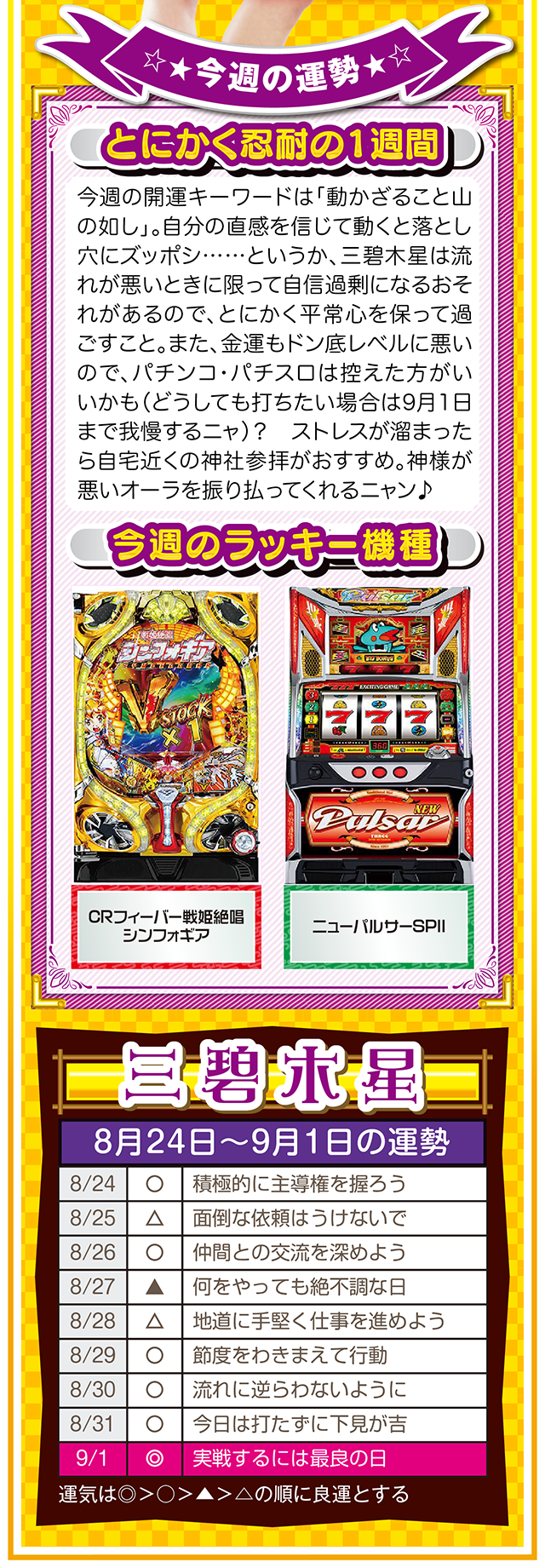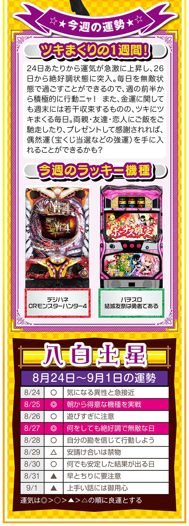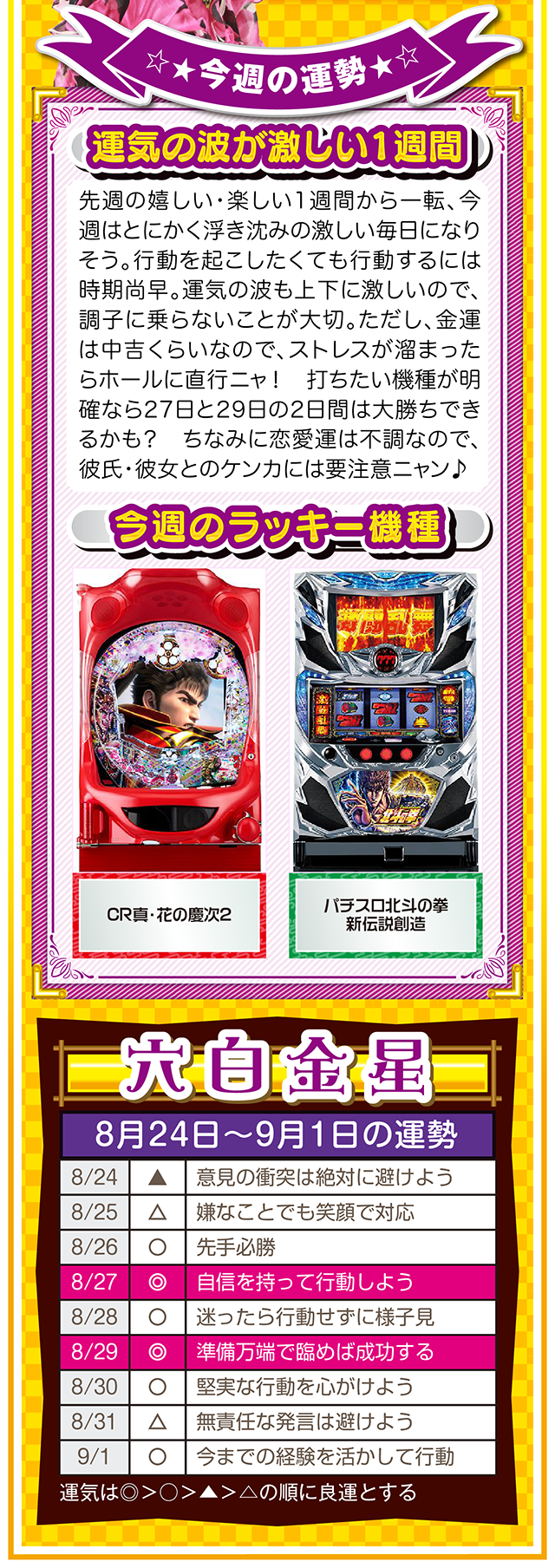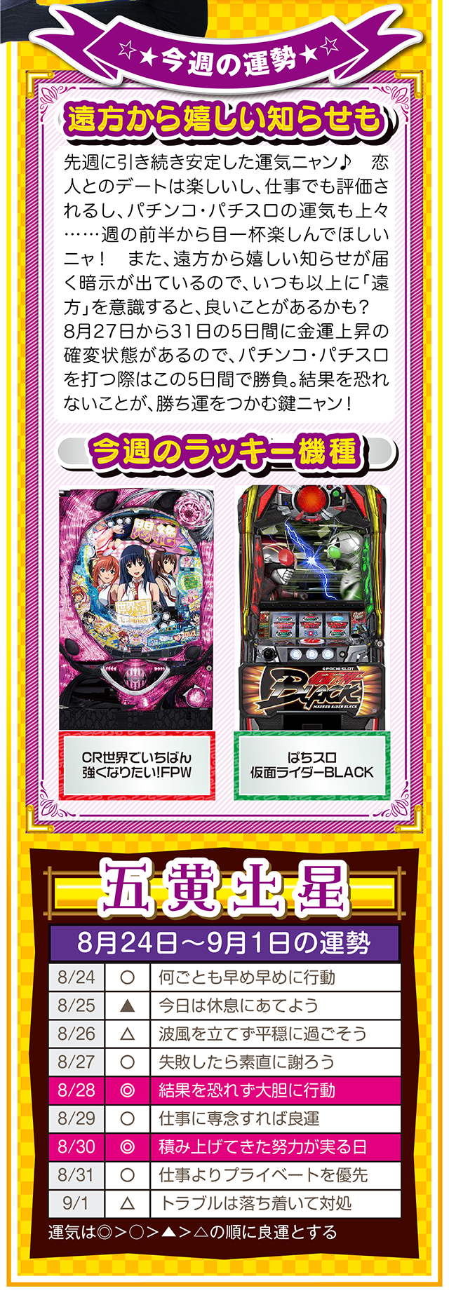 食べたくないものを食べる、触れたくないものと触れると「良い運気は遠ざかる」ということを覚えておいてほしいニャン……というわけで早速、8月26日から9月1日の1週間を鑑定ニャ(婚活パーティーに惨敗してカロリーを気にせずプッチンプリンを3個ヤケ食いした後に、オマケとして8月24日と25日の運勢も鑑定したニャン♡)!