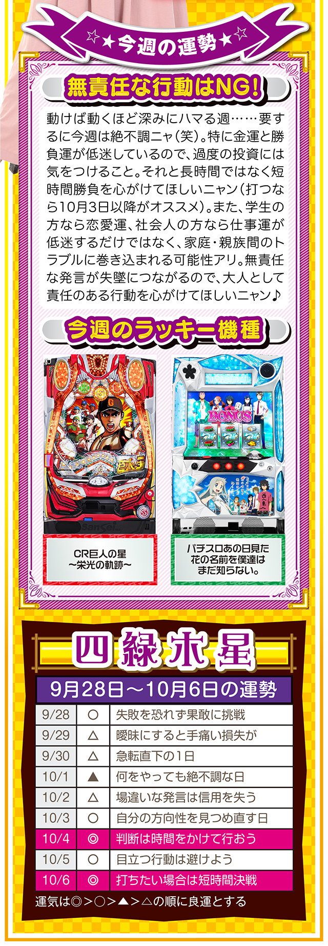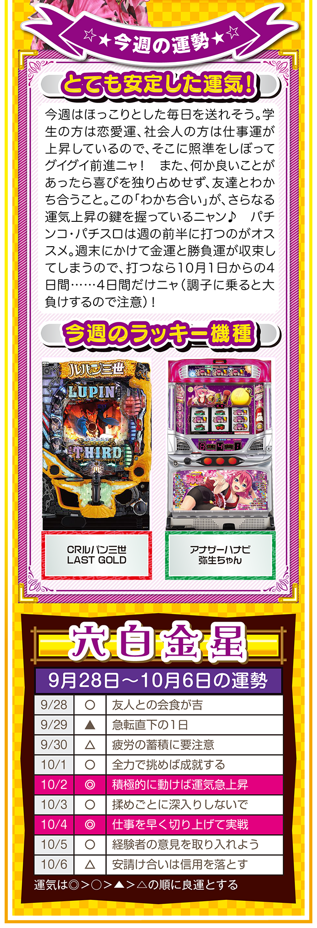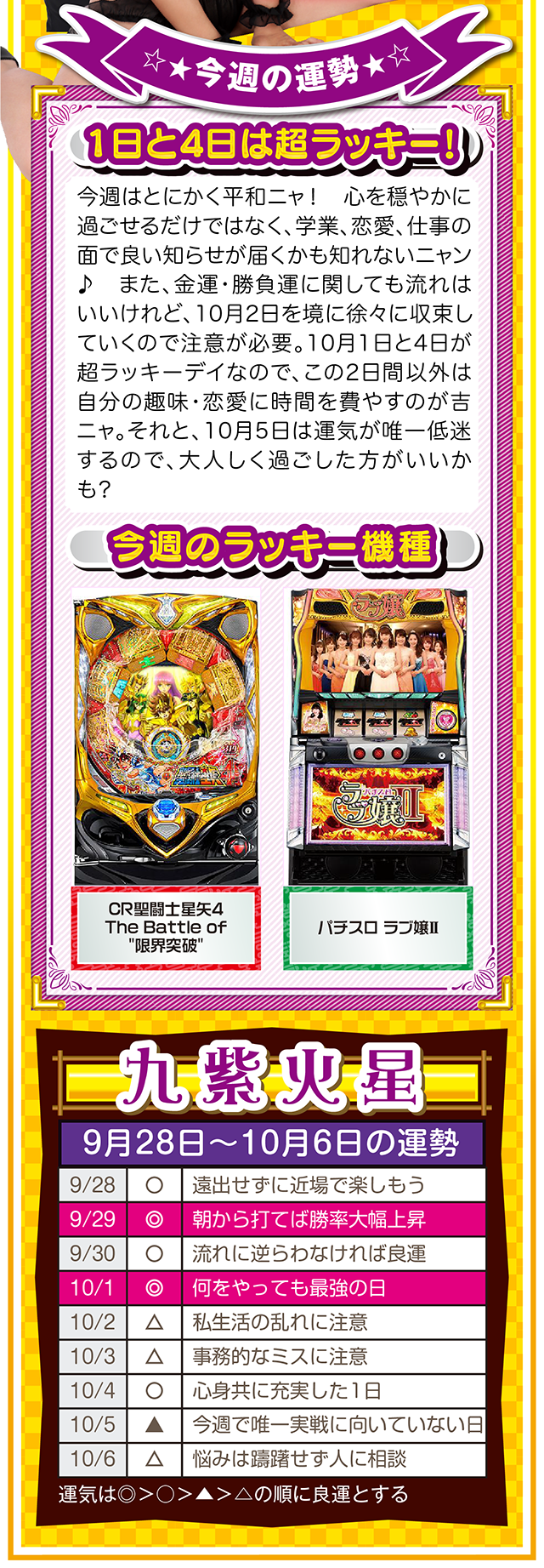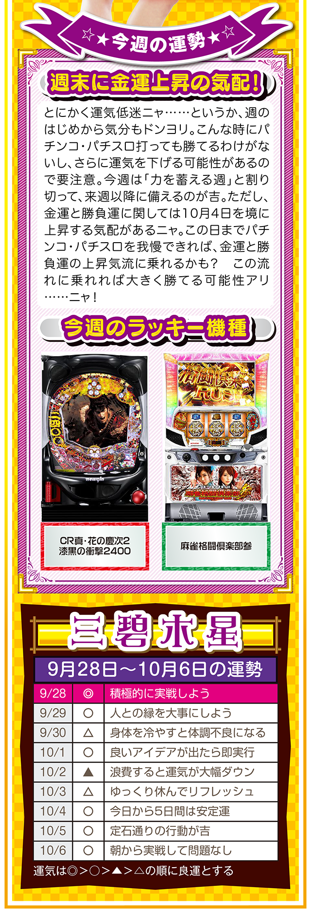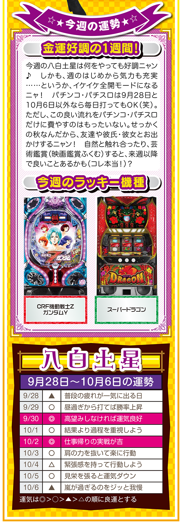 勝負強い人は、A番台がダメだったらB番台、B番台がダメならC番台と、どんな状況に置かれても対処できるような「準備」を常にしている、ということを覚えておいてほしいニャ……というわけで早速、9月30日から10月6日の1週間を鑑定ニャ(「そもそも婚活パーティーの準備って何よ?」と厚めの化粧をしながら、オマケとして9月28日と29日の運勢も本気鑑定したニャン♡)!