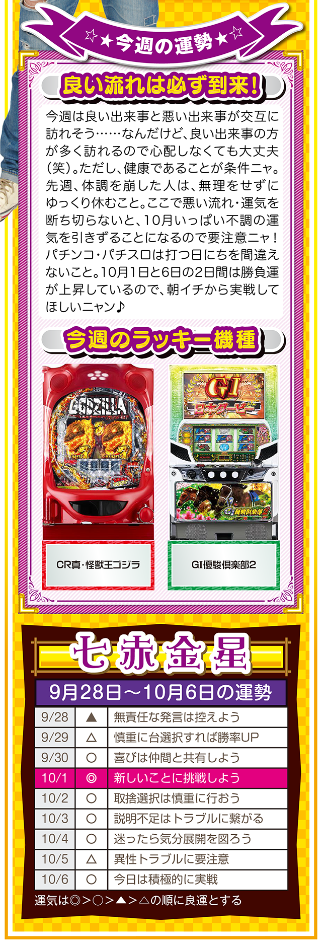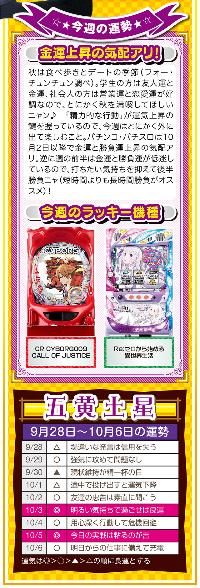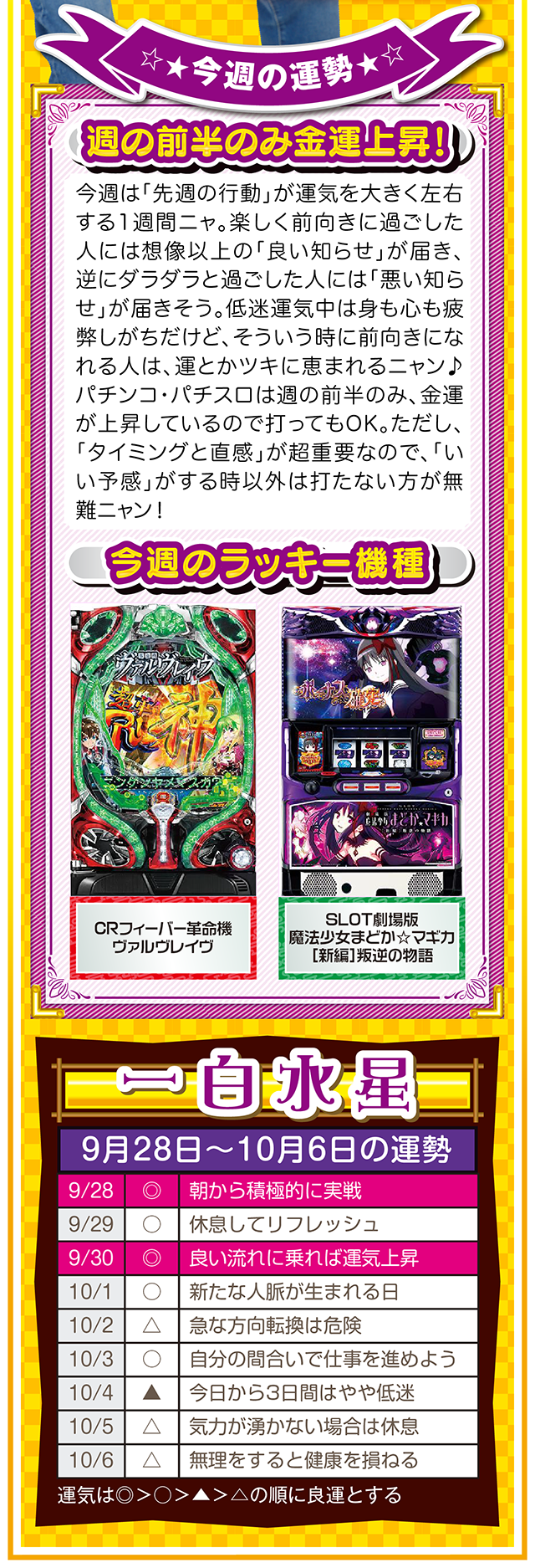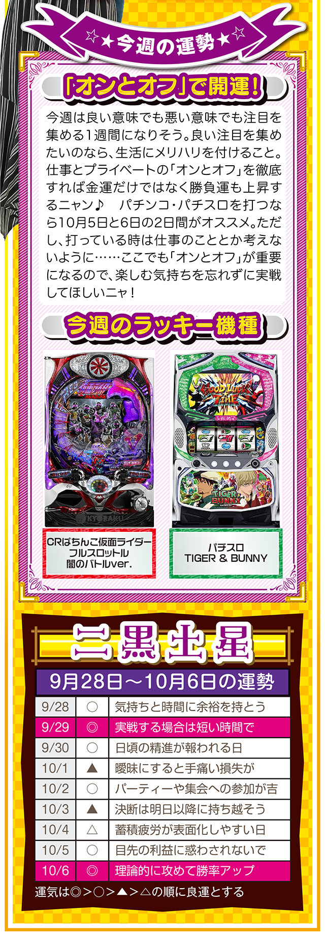 勝負強い人は、A番台がダメだったらB番台、B番台がダメならC番台と、どんな状況に置かれても対処できるような「準備」を常にしている、ということを覚えておいてほしいニャ……というわけで早速、9月30日から10月6日の1週間を鑑定ニャ(「そもそも婚活パーティーの準備って何よ?」と厚めの化粧をしながら、オマケとして9月28日と29日の運勢も本気鑑定したニャン♡)!