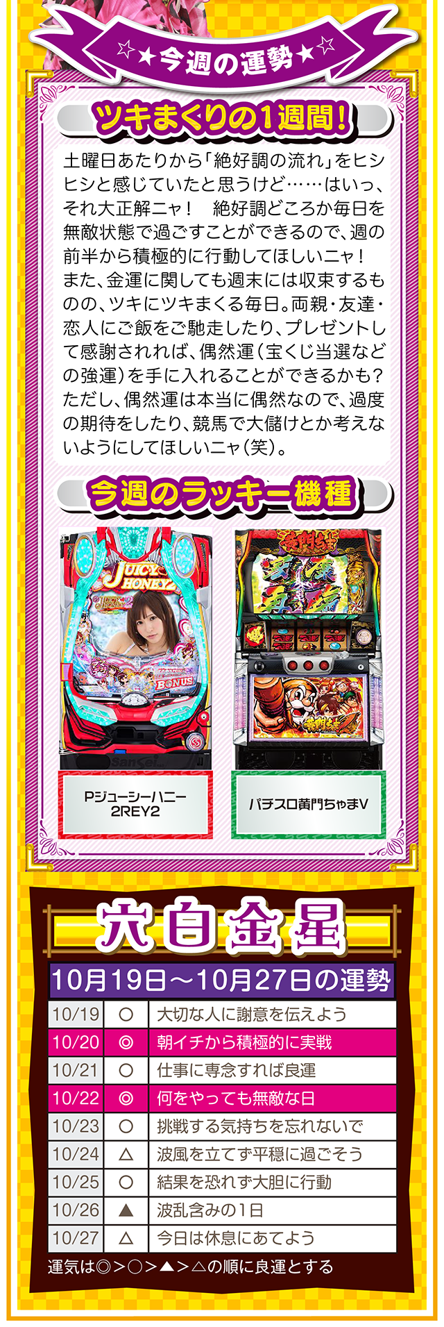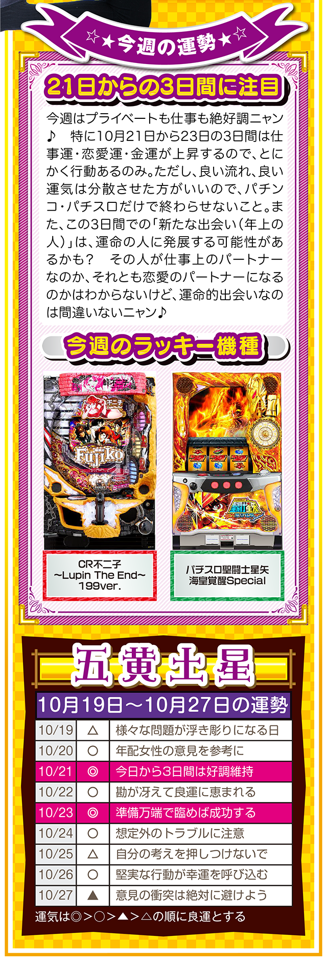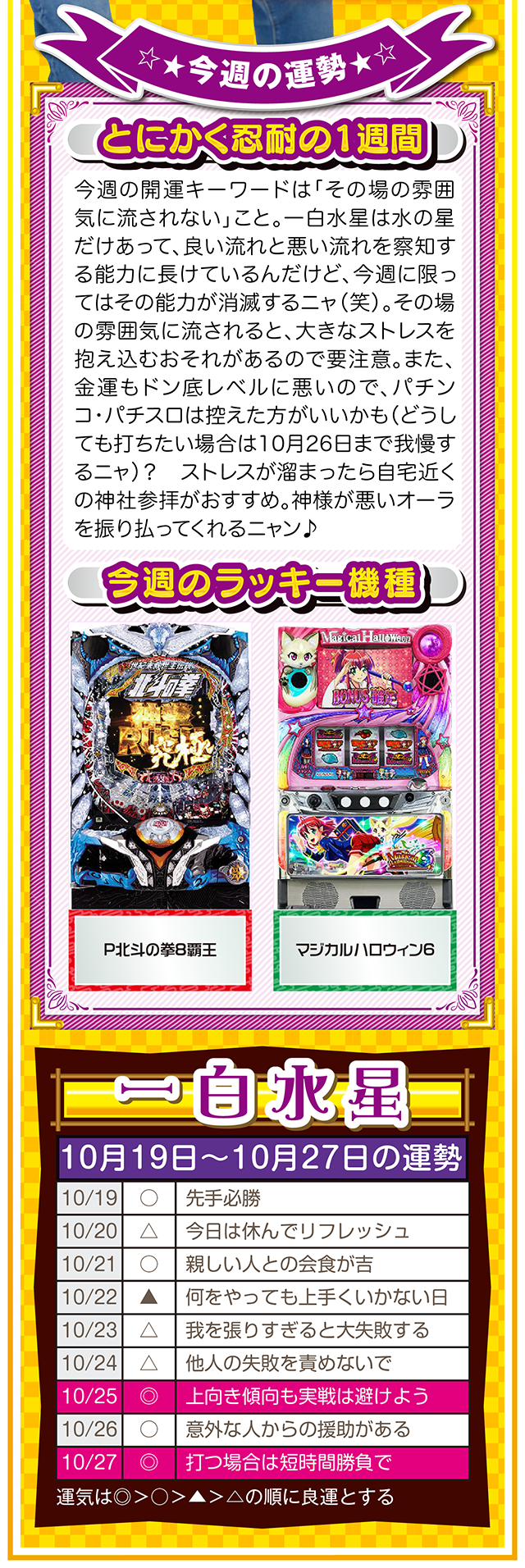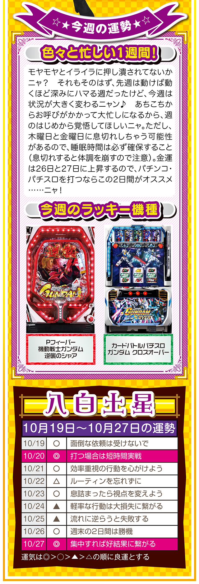 常に澄んだ状態になっていれば、運は自然と流れ込んでくる=結果として「仕事のデキる人」になれるニャン……というわけで早速、10月21日から27日の1週間を鑑定ニャ(「婚活に向けての準備・実行・後始末は万全なのに、なぜ?」と自問自答を繰り返しつつ、オマケとして10月19日と20日の運勢も鑑定したニャン♡)!