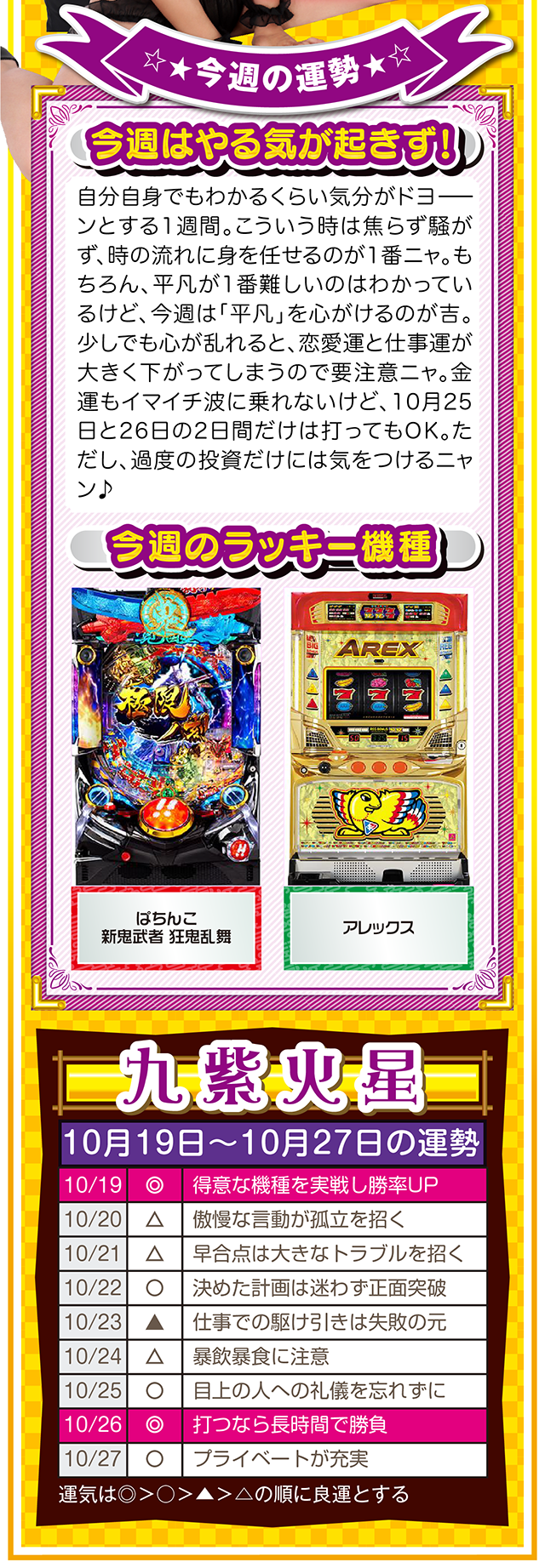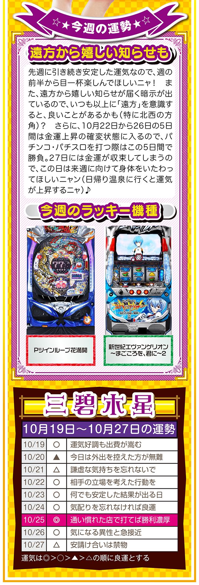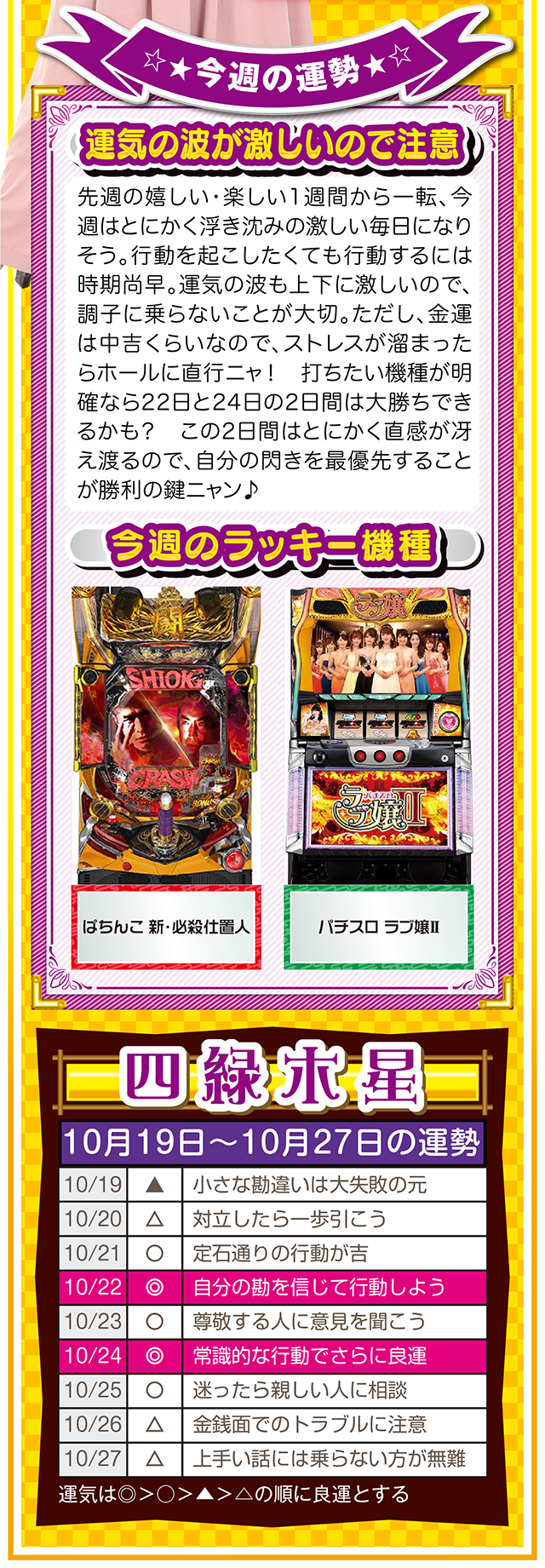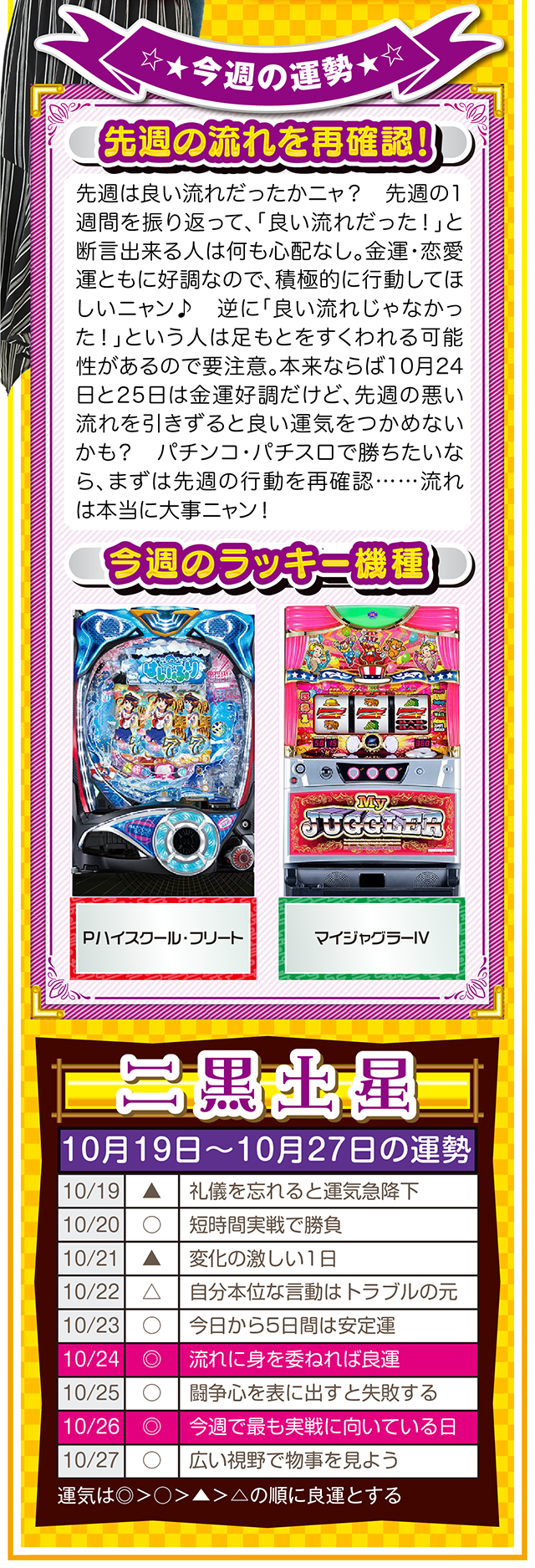 常に澄んだ状態になっていれば、運は自然と流れ込んでくる=結果として「仕事のデキる人」になれるニャン……というわけで早速、10月21日から27日の1週間を鑑定ニャ(「婚活に向けての準備・実行・後始末は万全なのに、なぜ?」と自問自答を繰り返しつつ、オマケとして10月19日と20日の運勢も鑑定したニャン♡)!