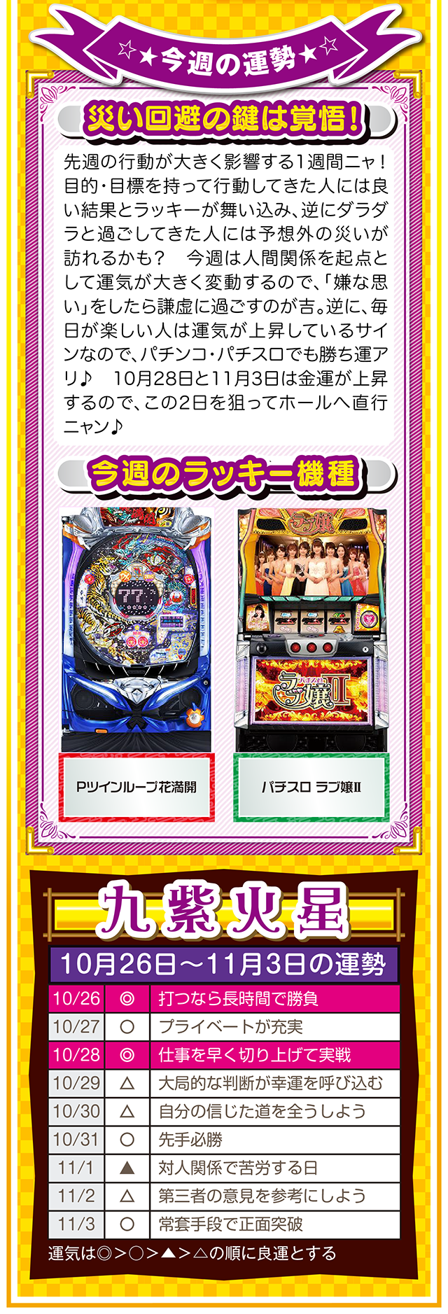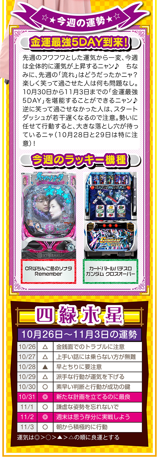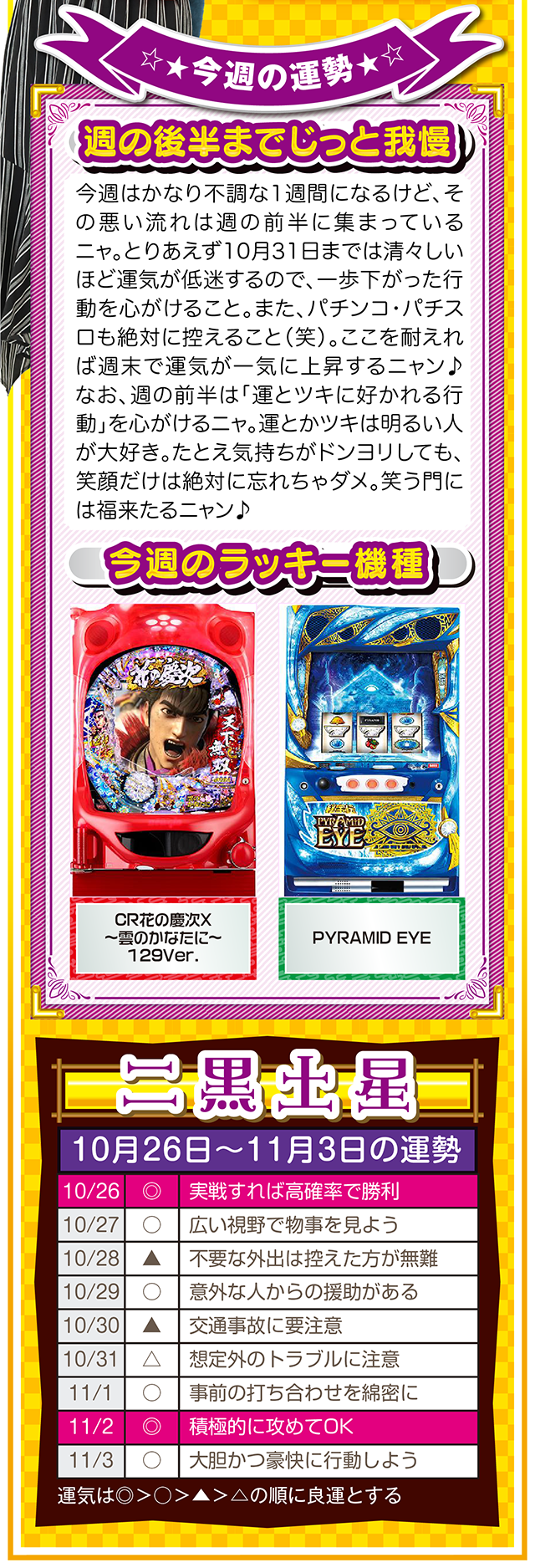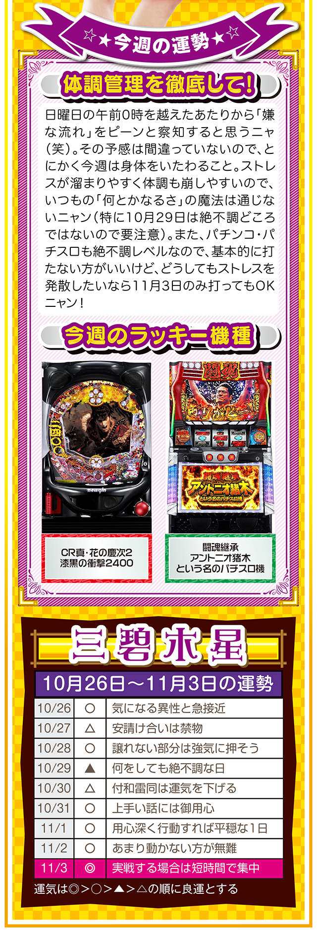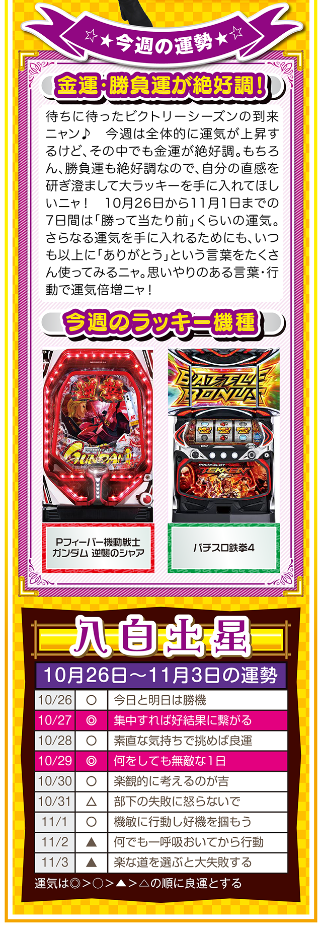 勝った数よりも負けた数、そして負けから学ぶ姿勢が「勝負運」を呼び込むことを覚えておいてほしいニャン……というわけで早速、10月28日から11月3日の1週間を鑑定ニャ(婚活パーティーでのガチ泥酔を「自分の弱点」と認識しつつ、オマケとして10月26日と27日の運勢も鑑定したニャン♡)!