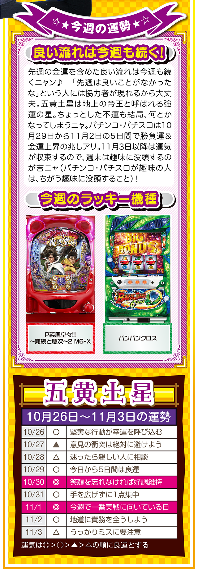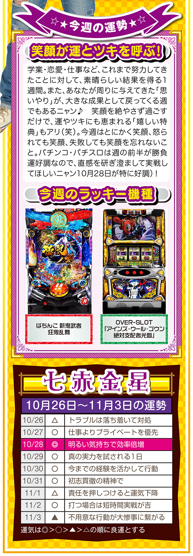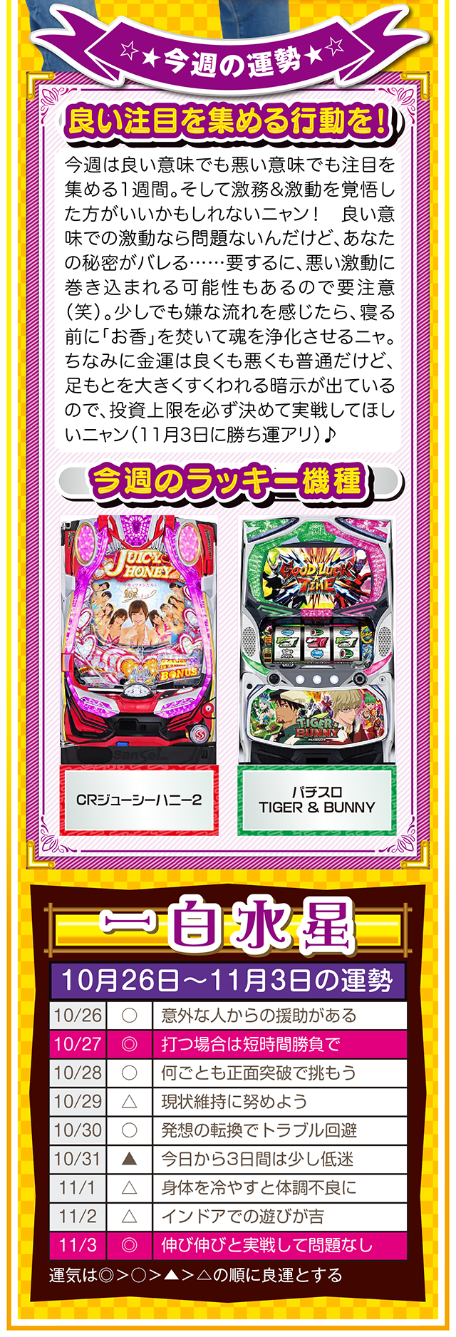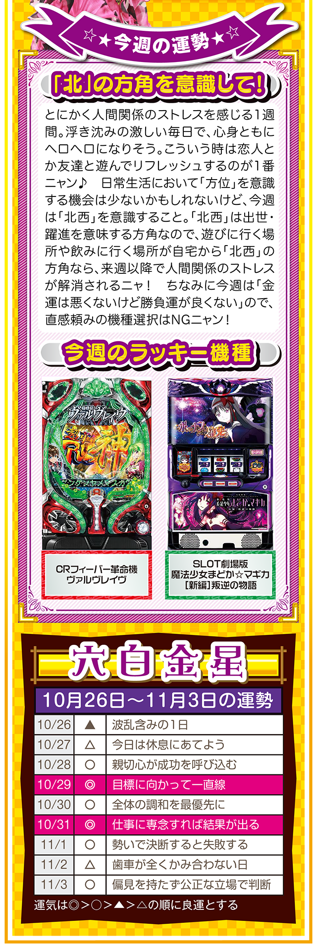 勝った数よりも負けた数、そして負けから学ぶ姿勢が「勝負運」を呼び込むことを覚えておいてほしいニャン……というわけで早速、10月28日から11月3日の1週間を鑑定ニャ(婚活パーティーでのガチ泥酔を「自分の弱点」と認識しつつ、オマケとして10月26日と27日の運勢も鑑定したニャン♡)!