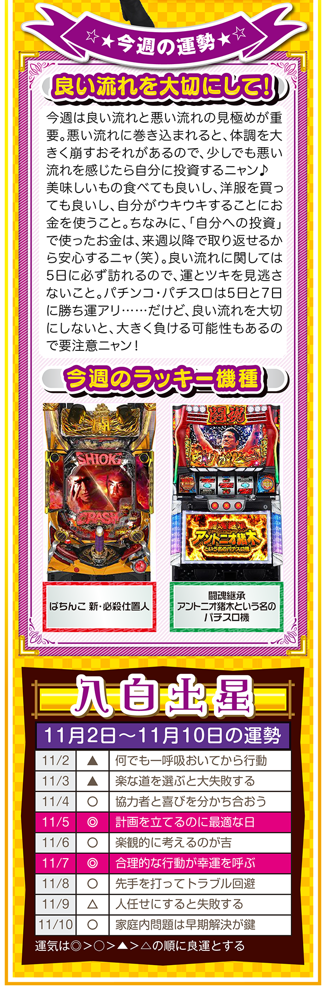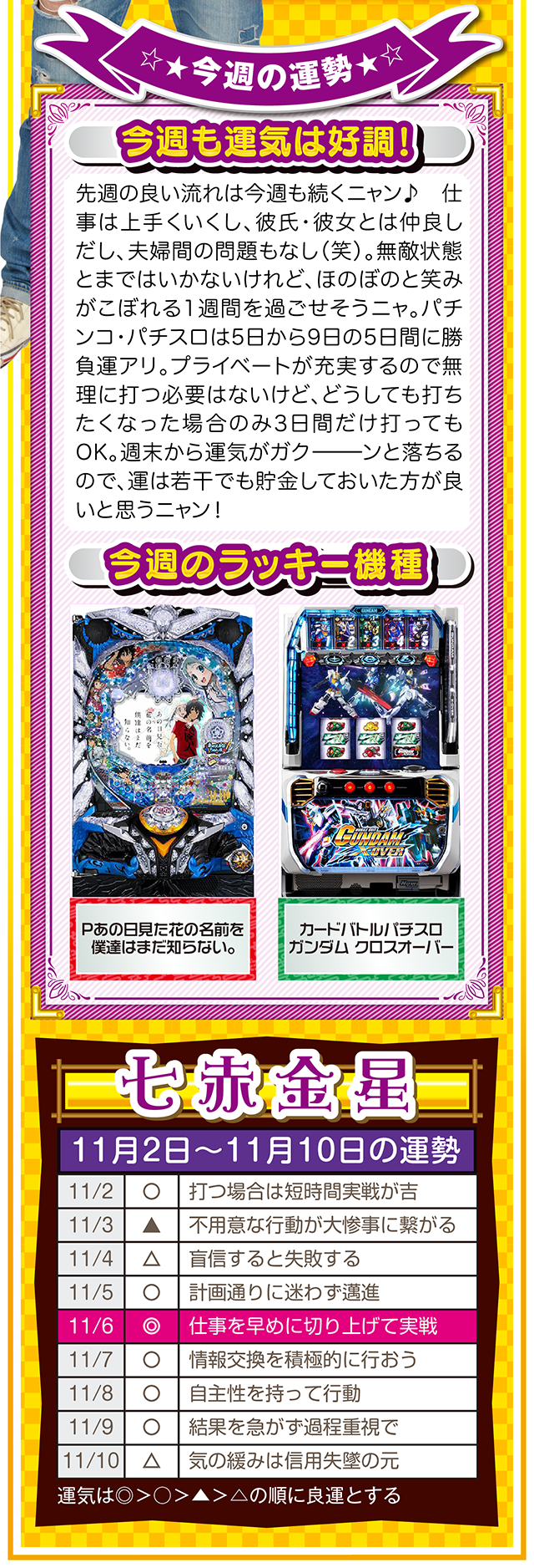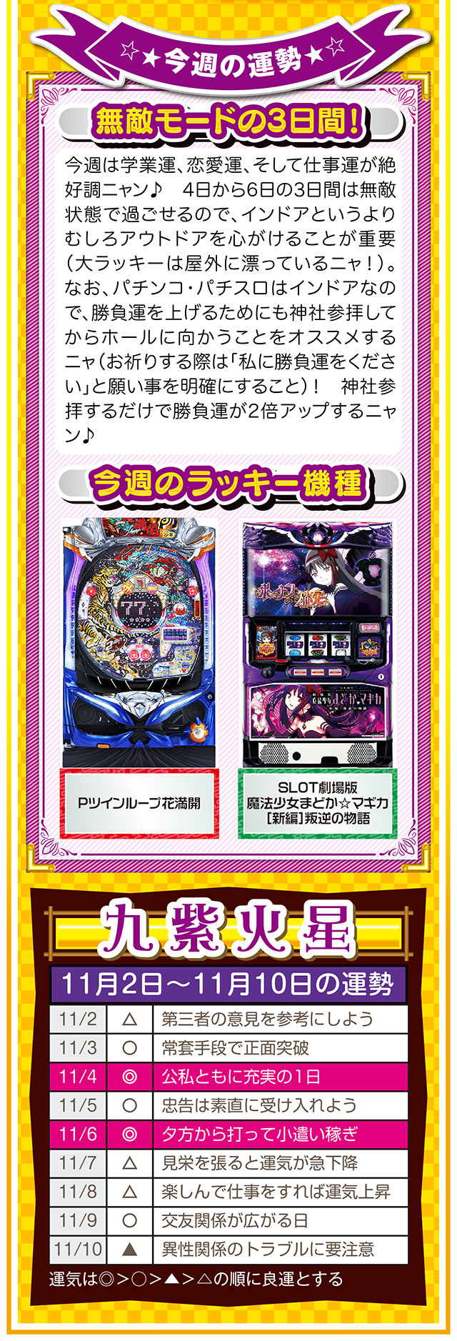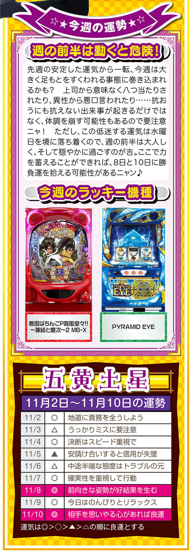 「千里の道も一歩から」という諺(ことわざ)のように、毎日の積み重ねが偉大な計画・夢の実現につながり、「運とかツキは身の丈を知る者にのみ訪れる」ということを覚えておいてほしいニャン……というわけで早速、11月4日から11月10日の1週間を鑑定ニャ(「可愛いお嫁さんという夢は身の丈にあってないのかニャ?」と自問自答を繰り返しつつ、オマケとして11月2日と3日の運勢も鑑定したニャン♡)!