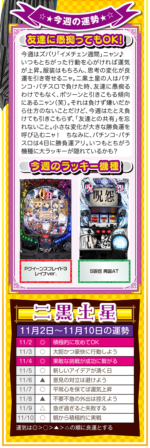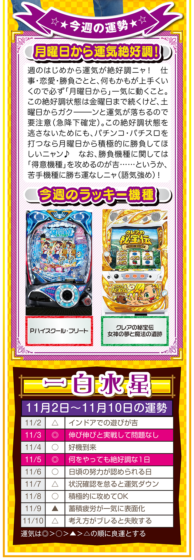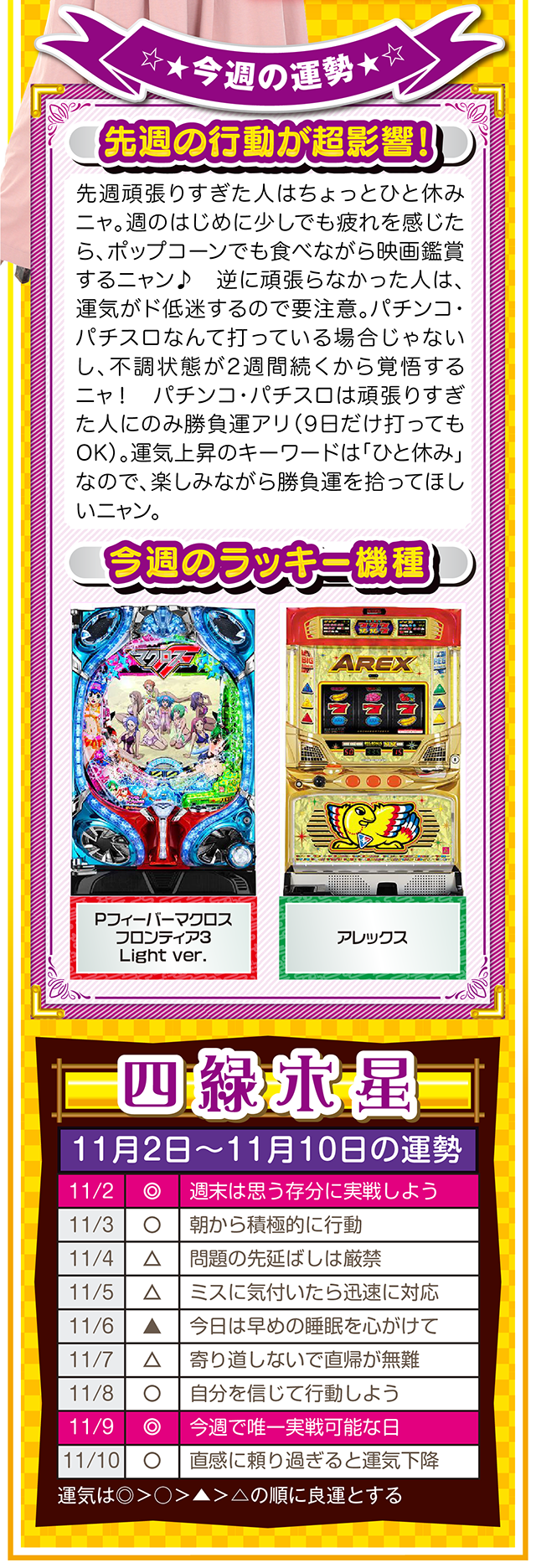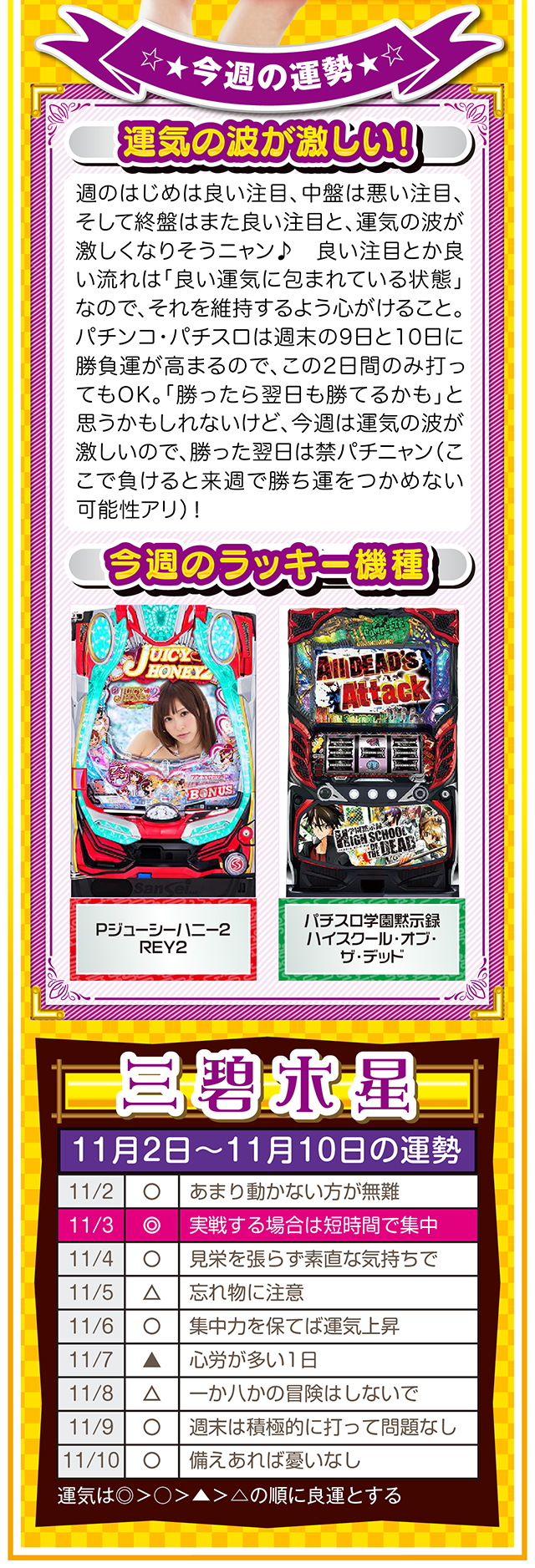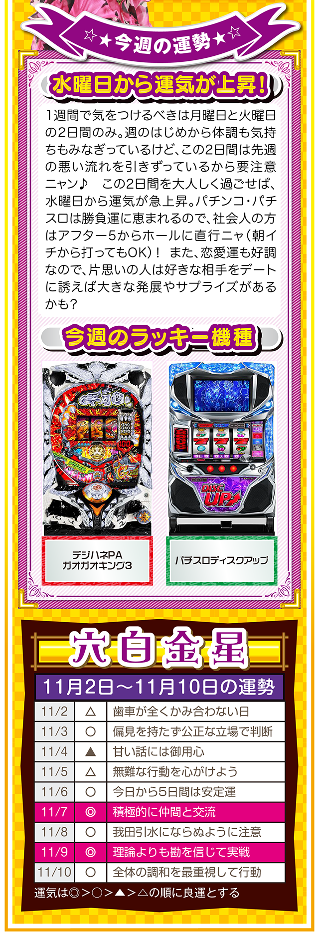 「千里の道も一歩から」という諺(ことわざ)のように、毎日の積み重ねが偉大な計画・夢の実現につながり、「運とかツキは身の丈を知る者にのみ訪れる」ということを覚えておいてほしいニャン……というわけで早速、11月4日から11月10日の1週間を鑑定ニャ(「可愛いお嫁さんという夢は身の丈にあってないのかニャ?」と自問自答を繰り返しつつ、オマケとして11月2日と3日の運勢も鑑定したニャン♡)!