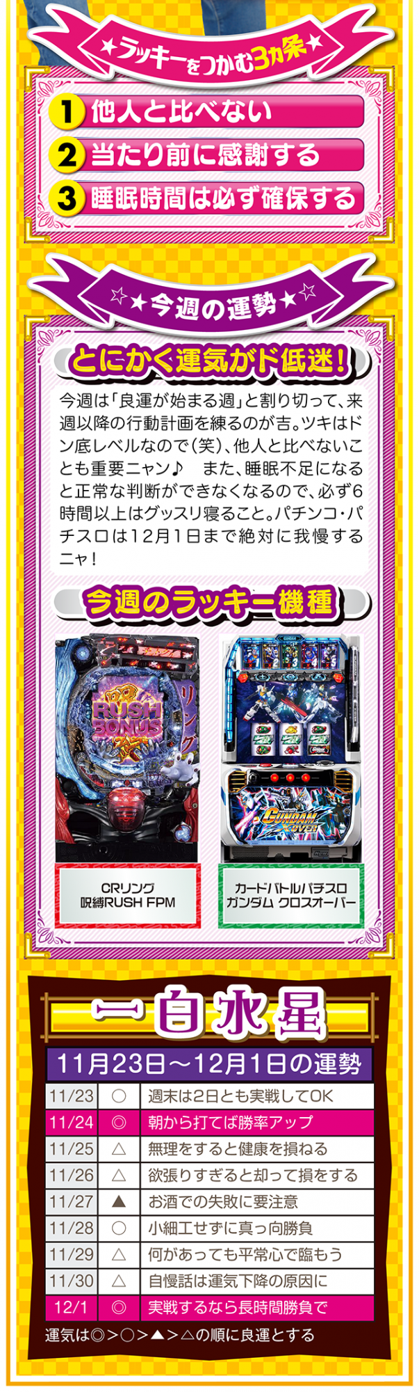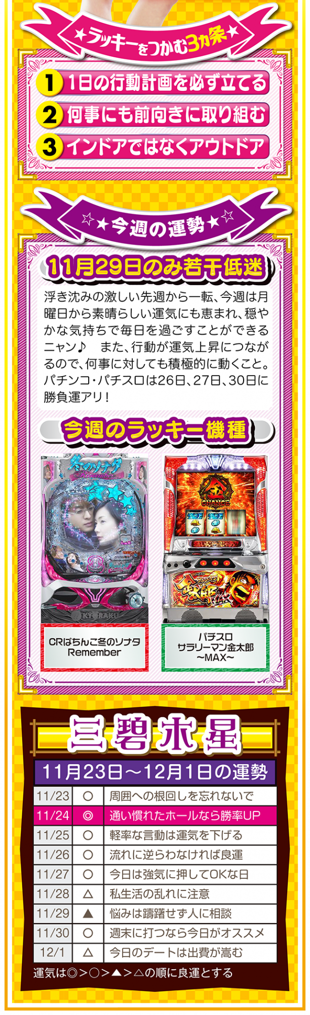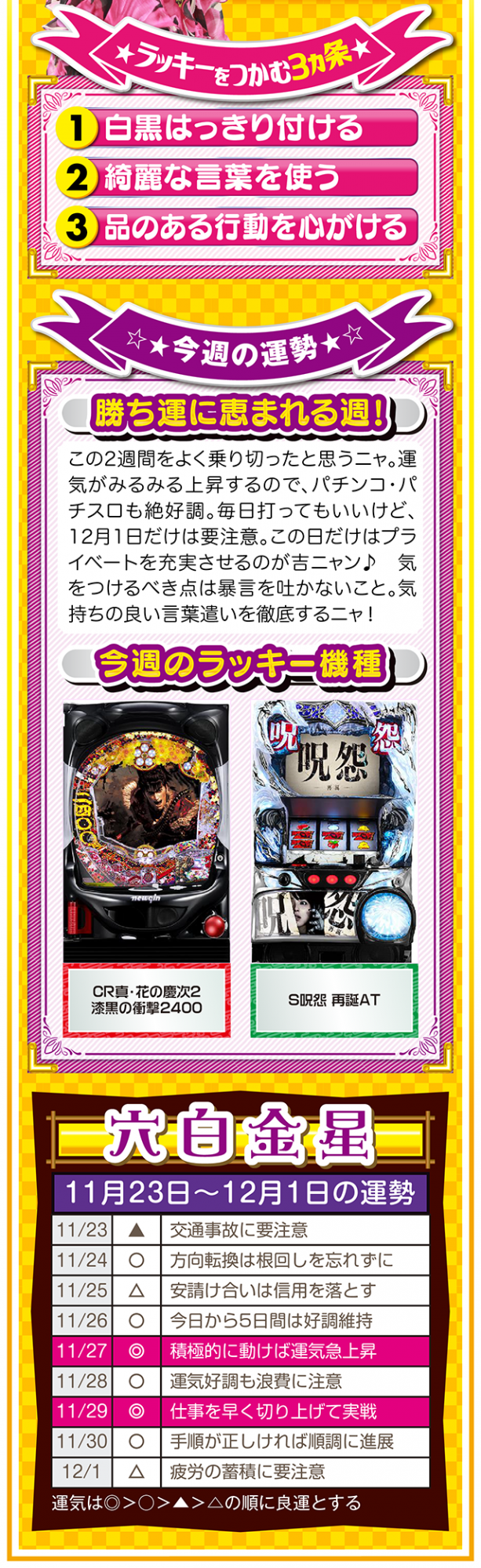ちなみに、今週から実践すれば運気アップにつながる「ラッキーをつかむ3ヵ条」を分かりやすくまとめているので、これらを実践して幸運を掴んで欲しいニャン!