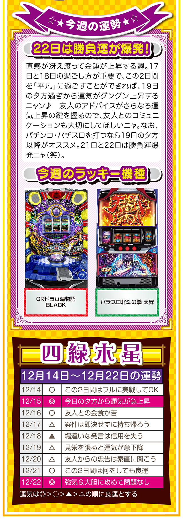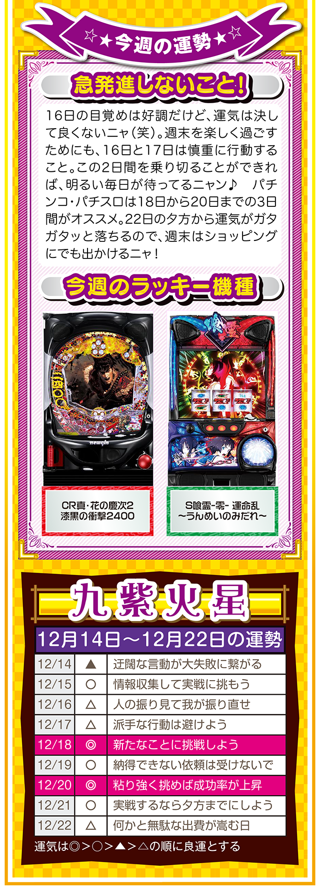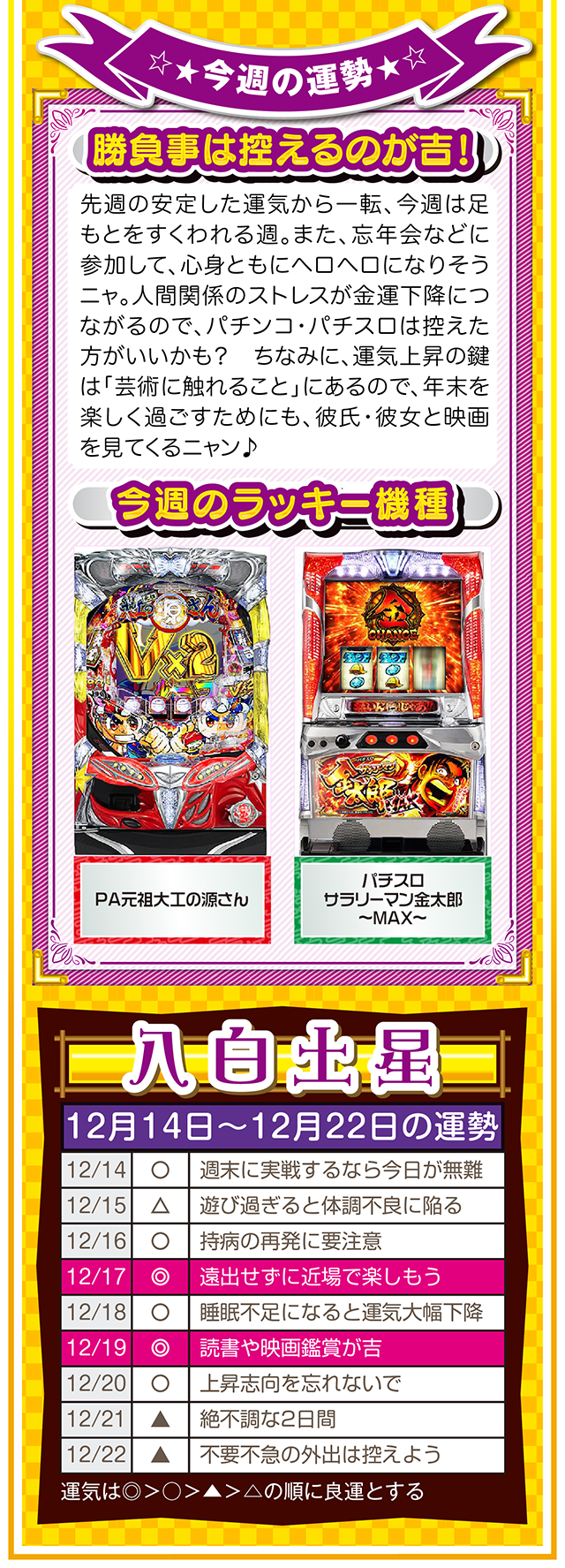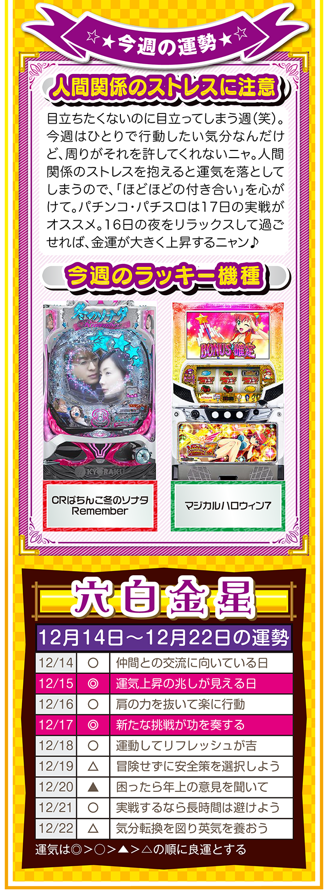 自分の星の性質を理解して、陰陽五行説の相性をベースに「恋愛」、「結婚」、「仕事」、「お金」について考えれば、人間関係のストレスが軽減されるニャン……というわけで早速、12月16日から22日の1週間を鑑定ニャ(「好きになるメンズはなぜ九紫火星ばかり?」と、大凶星に惹かれることを悩みつつ、オマケとして14日と15日の運勢も鑑定したニャン♡)!