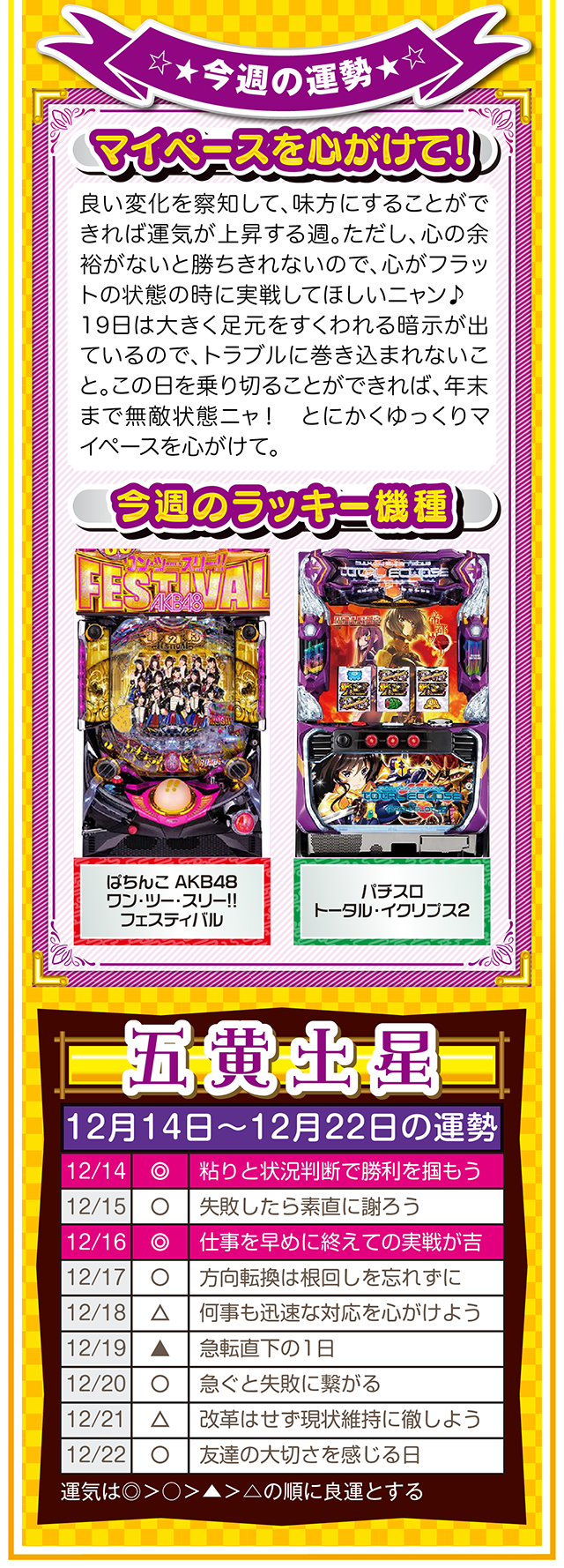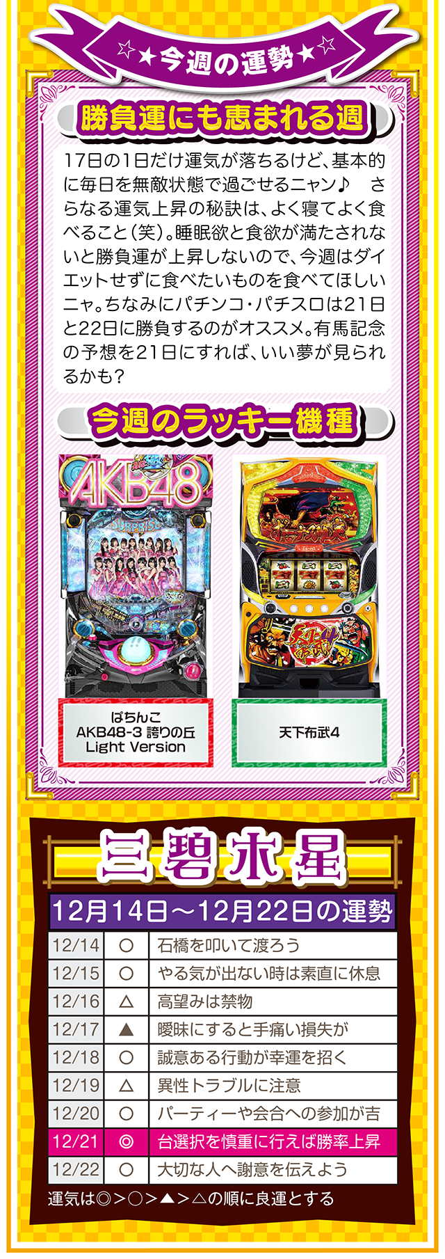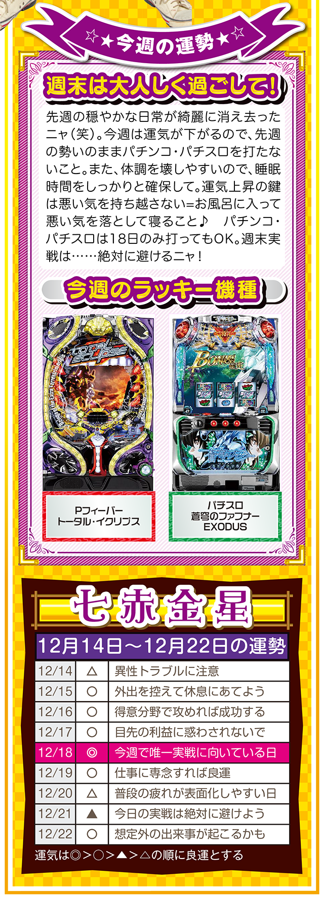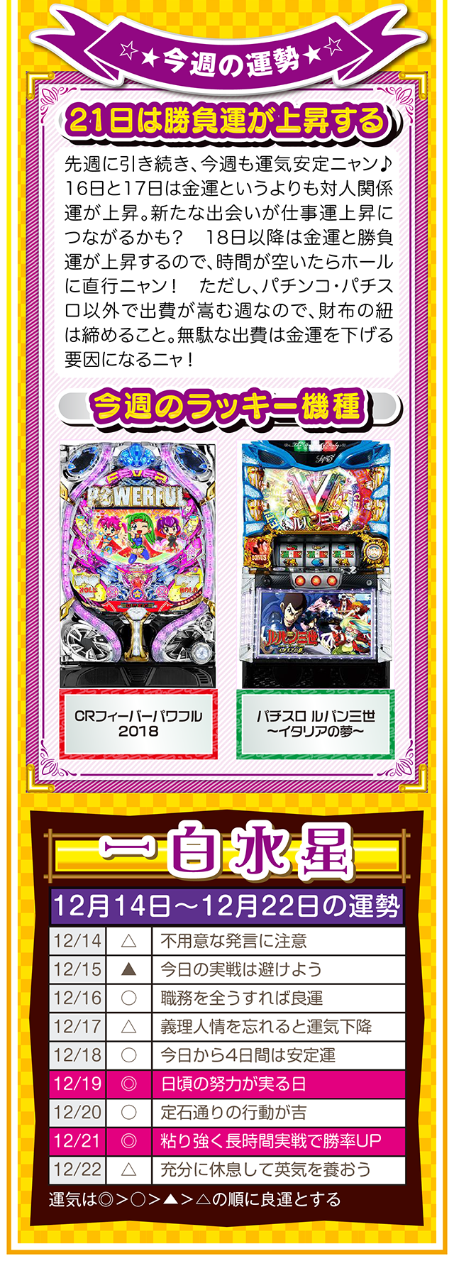 自分の星の性質を理解して、陰陽五行説の相性をベースに「恋愛」、「結婚」、「仕事」、「お金」について考えれば、人間関係のストレスが軽減されるニャン……というわけで早速、12月16日から22日の1週間を鑑定ニャ(「好きになるメンズはなぜ九紫火星ばかり?」と、大凶星に惹かれることを悩みつつ、オマケとして14日と15日の運勢も鑑定したニャン♡)!