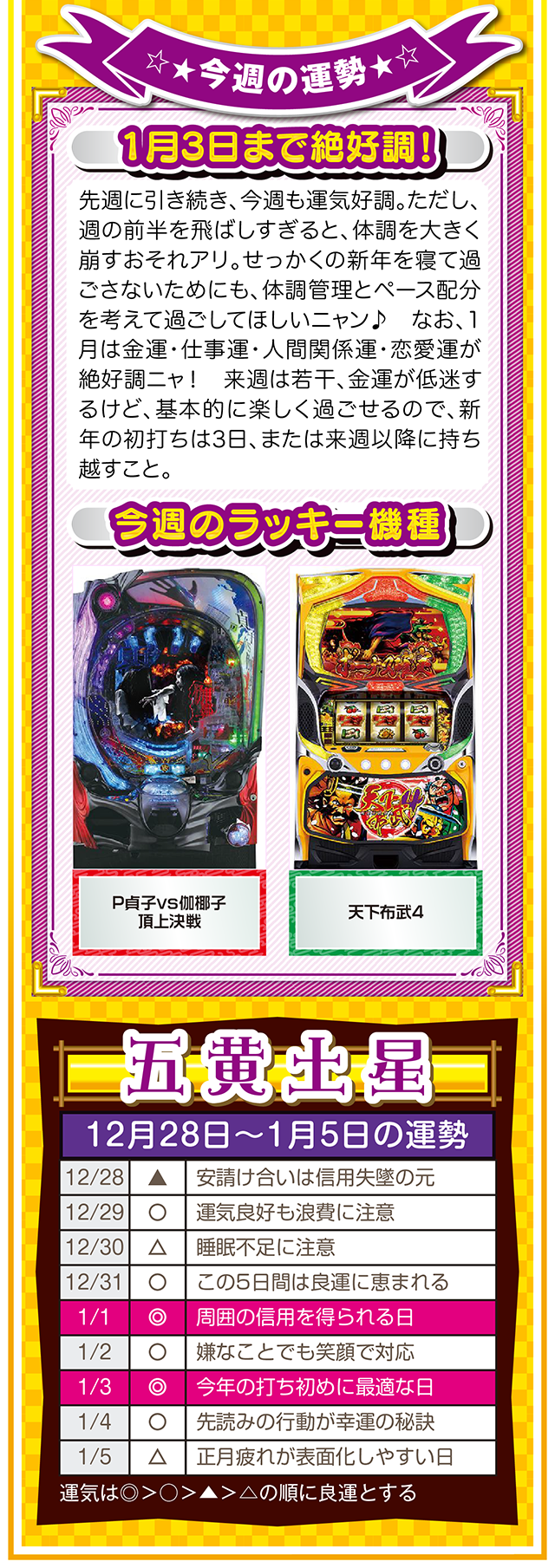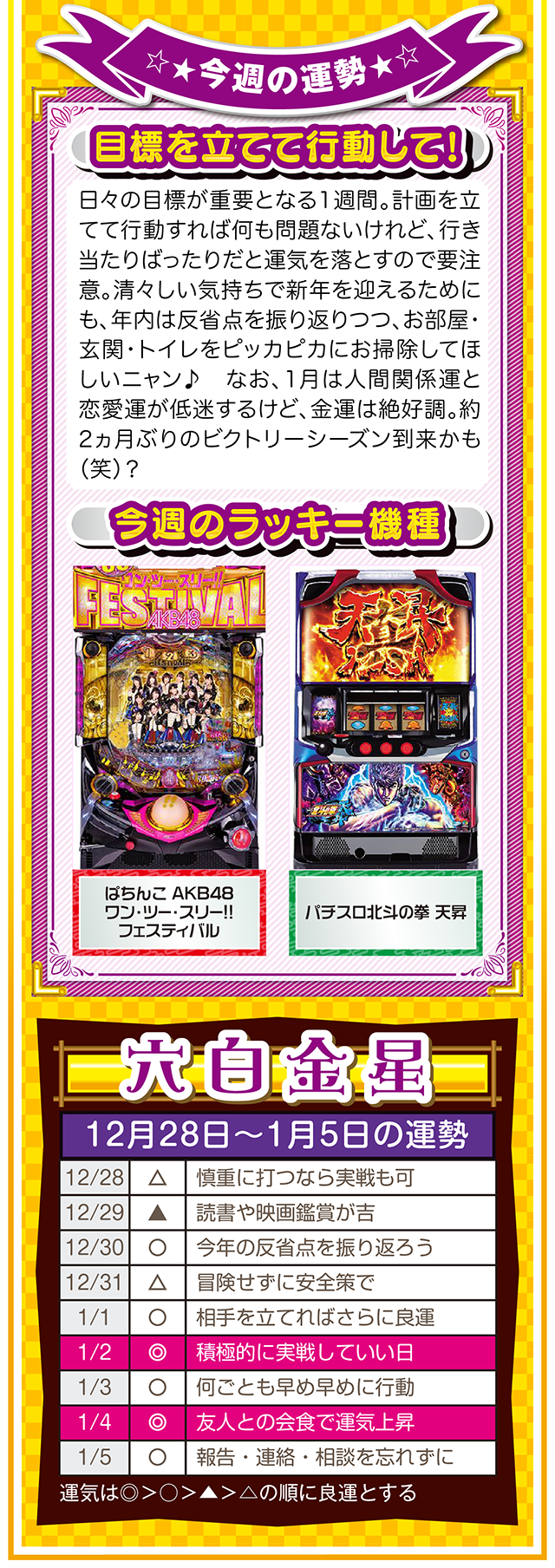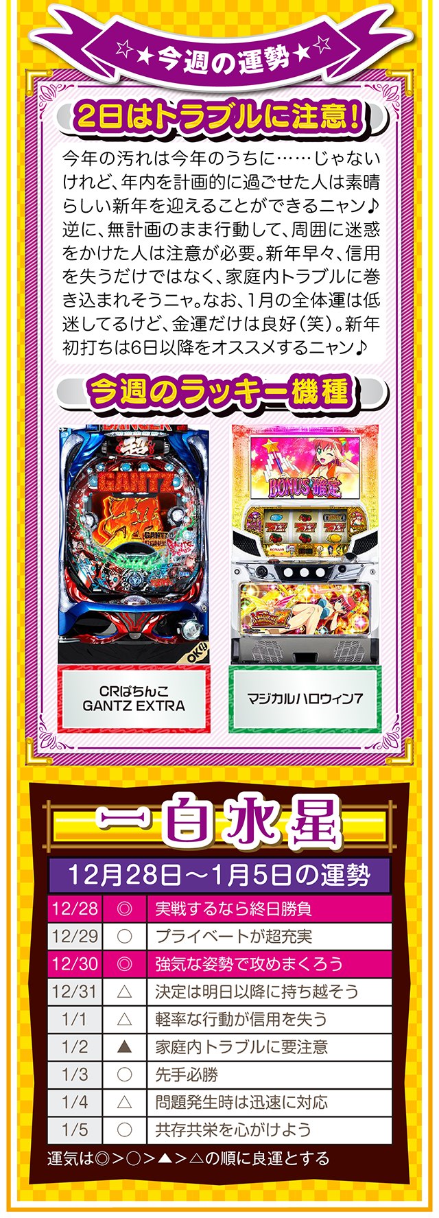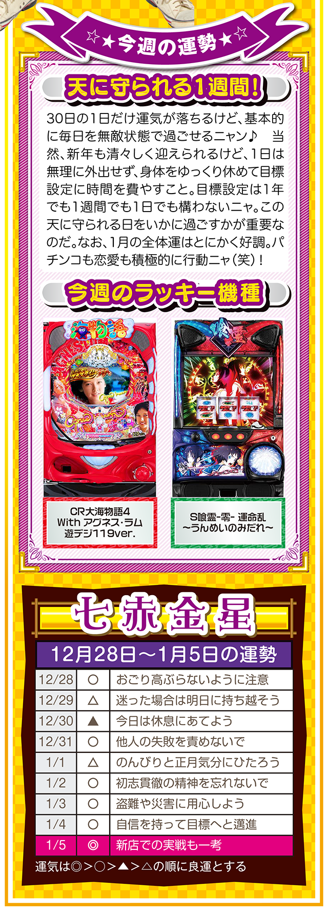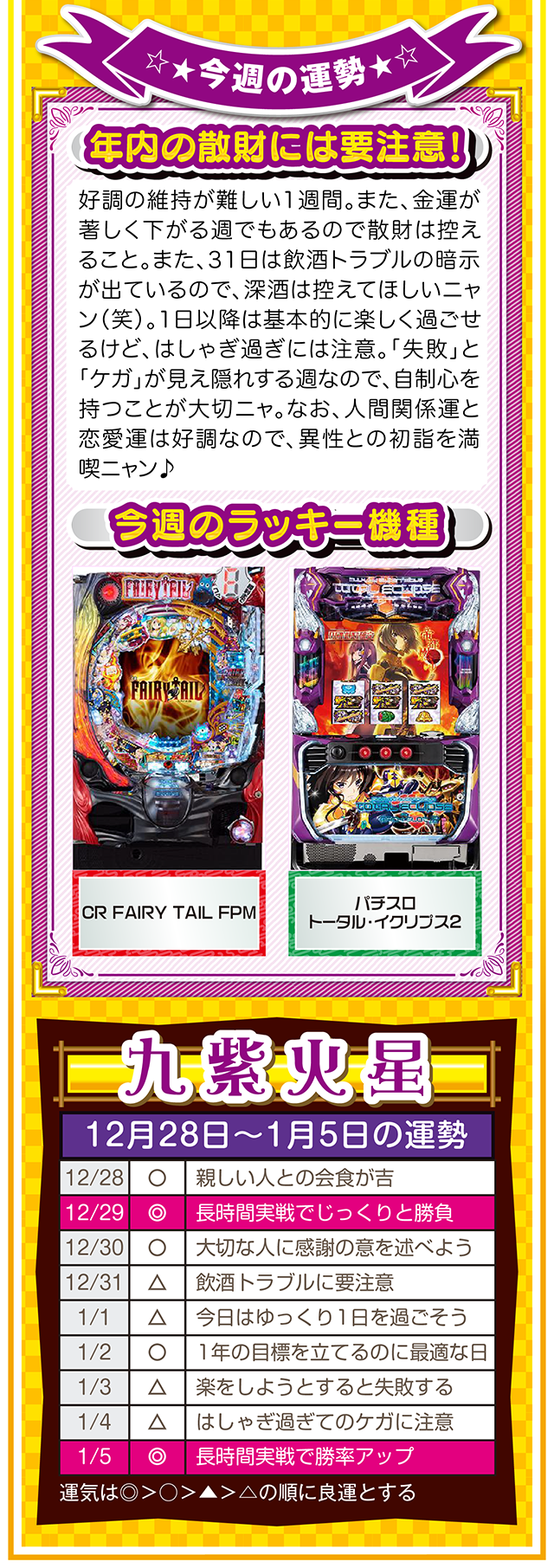 来年も開運する術はもちろん、勝負運アップの術をお伝えするので、これからもよろしくお願いしますニャン……というわけで早速、12月30日から1月5日の1週間を鑑定ニャ(婚活パーティーの記憶を脳内から抹消しつつ、オマケとして28日と29日の運勢も鑑定したニャン♡)!