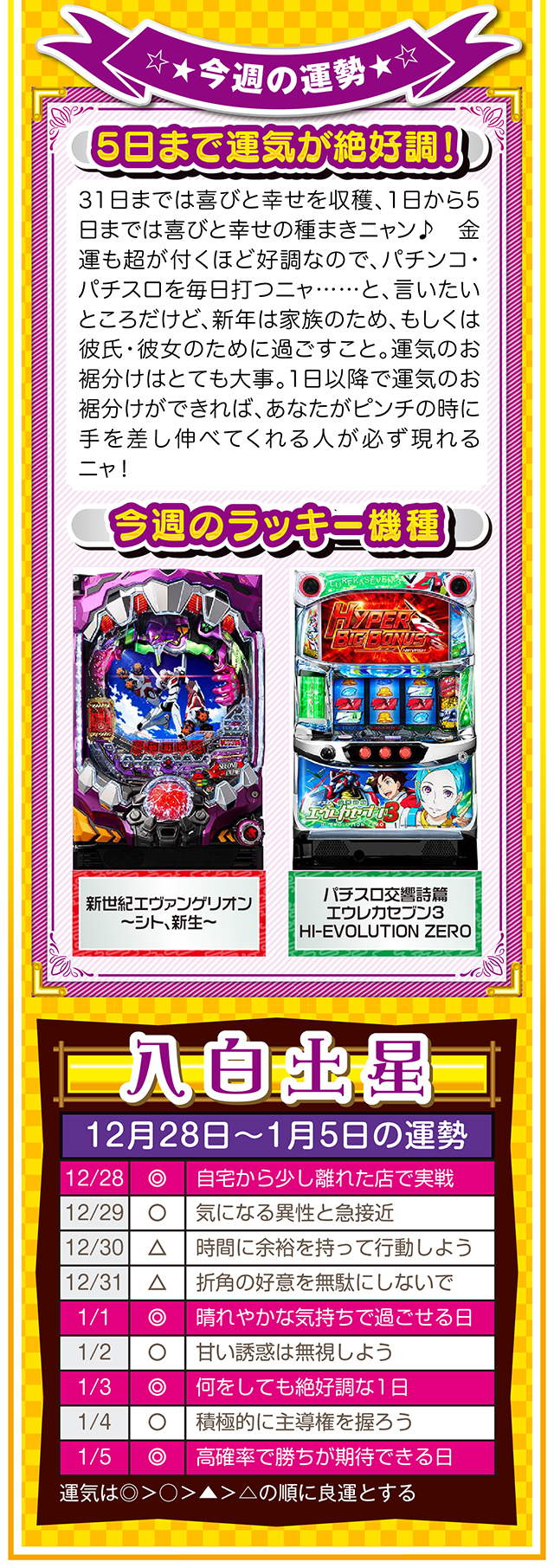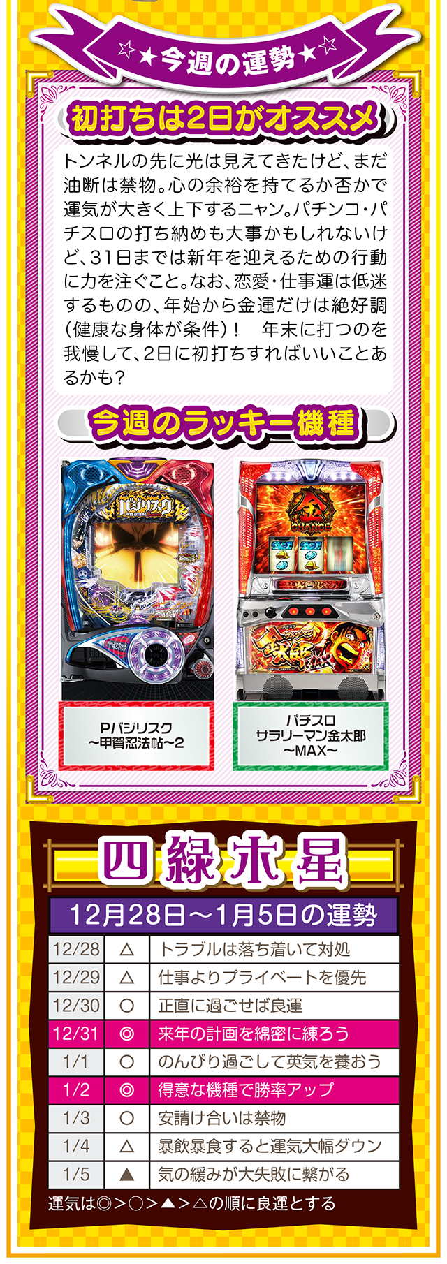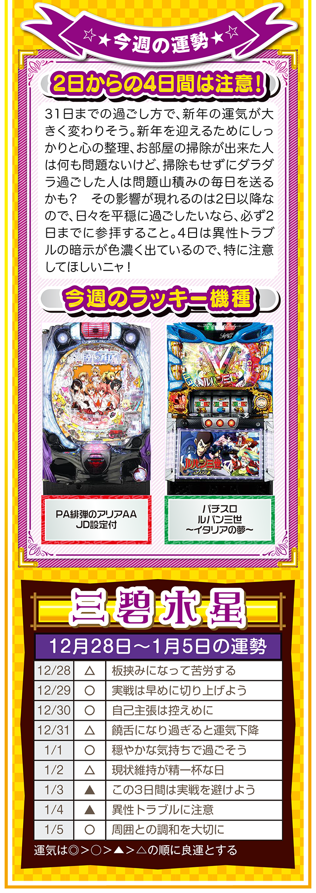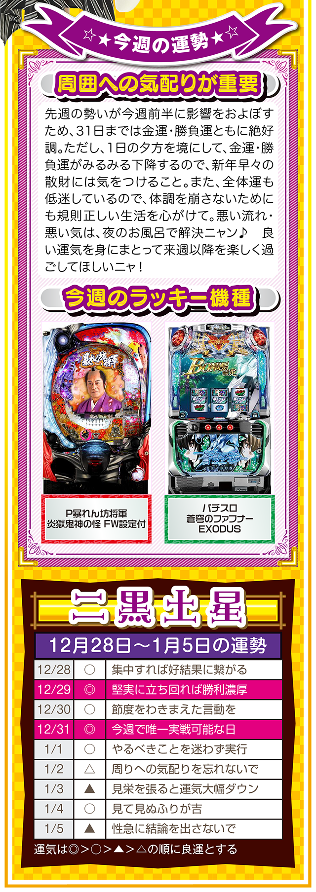 日本には「大掃除」という素晴らしい風習があるので、30日と31日はパチンコ・パチスロをほどほどにして(笑)、取捨選択を念頭に過ごしてほしいニャン♪