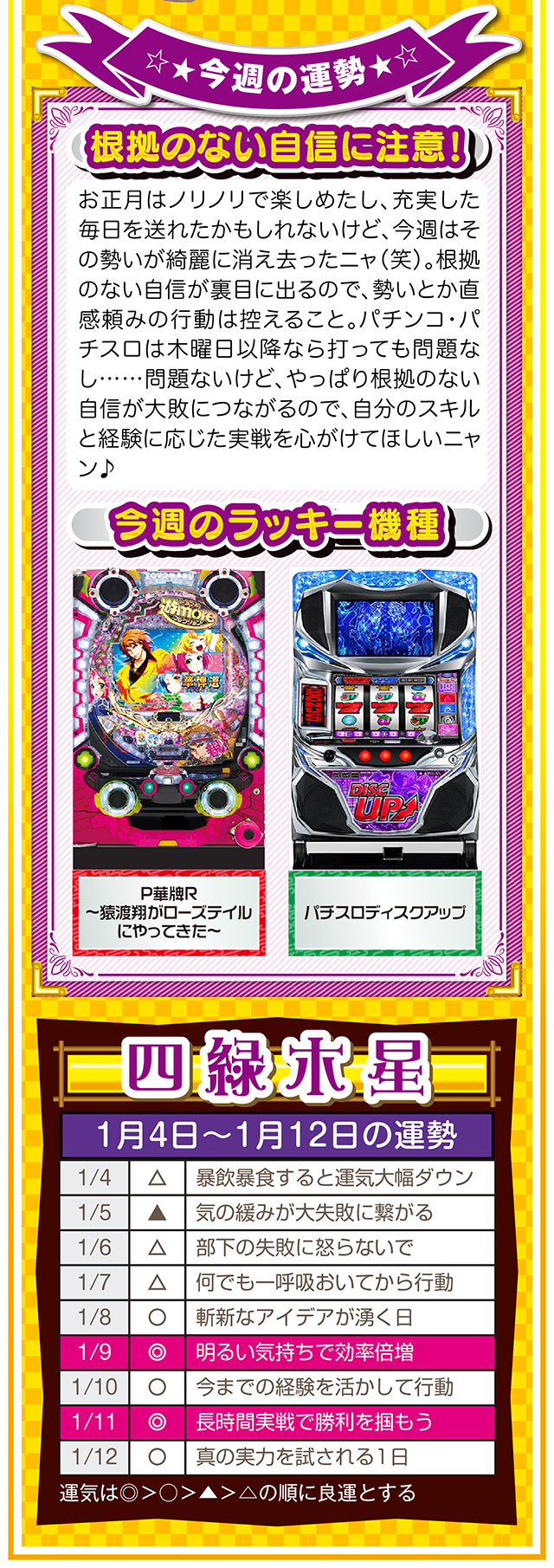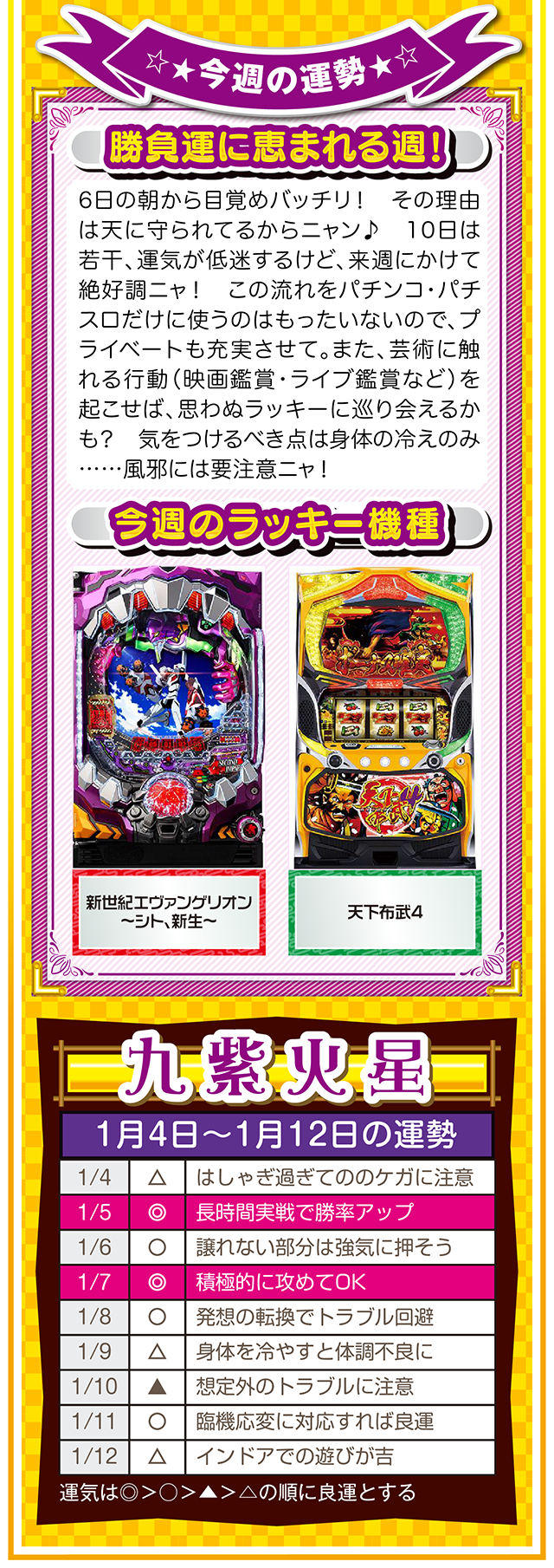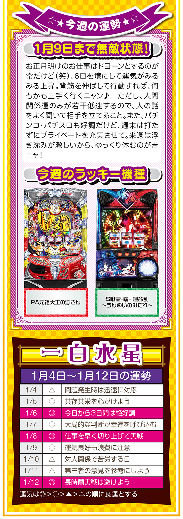 1円でも10円でも100円でも構わないニャ。毎日少しずつお金を貯める習慣が、大きな金運をつかむキッカケになることを覚えておいてほしいニャン……というわけで早速、1月6日から12日の1週間を鑑定ニャ(去年の初詣でおみくじを引いたら「凶」と書かれてて、思わず「こんなの嘘っぱちニャ!」とシャウトしたことを恥じらいつつ、オマケとして4日と5日の運勢も鑑定したニャン♡)!