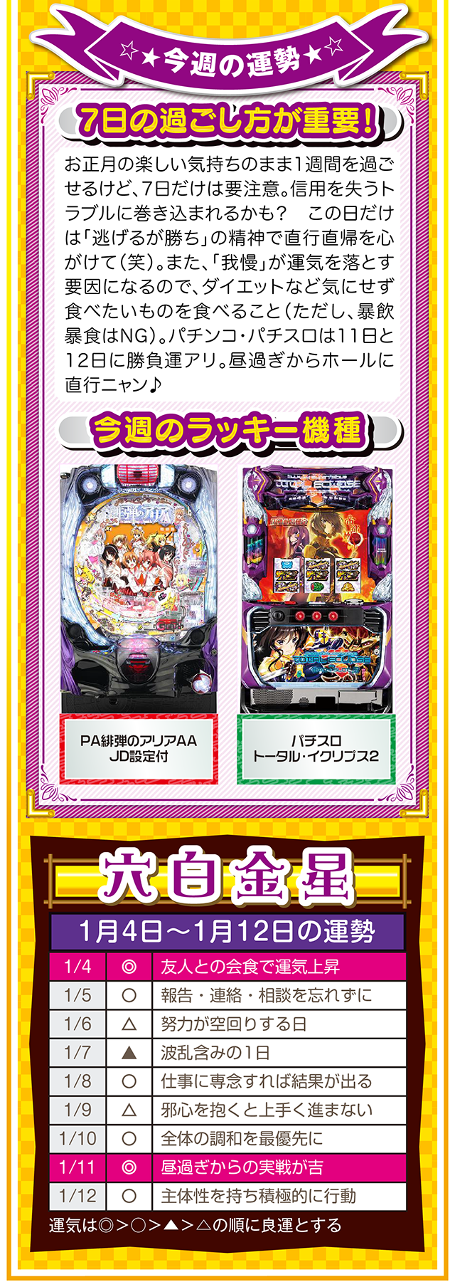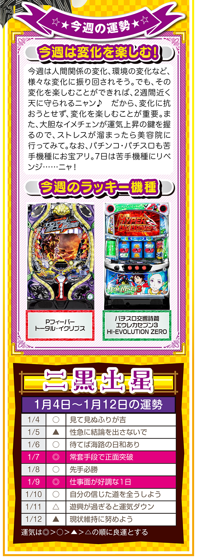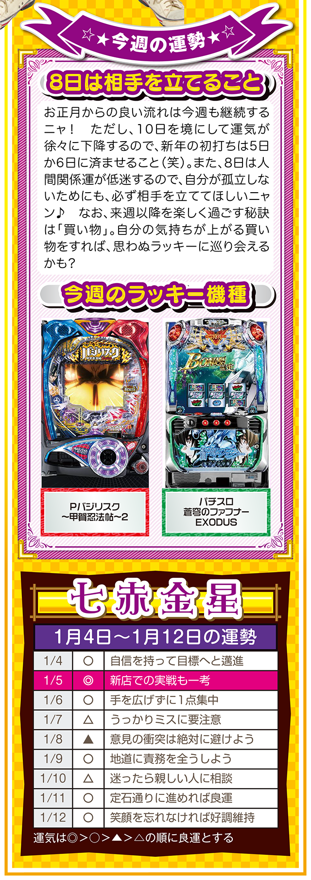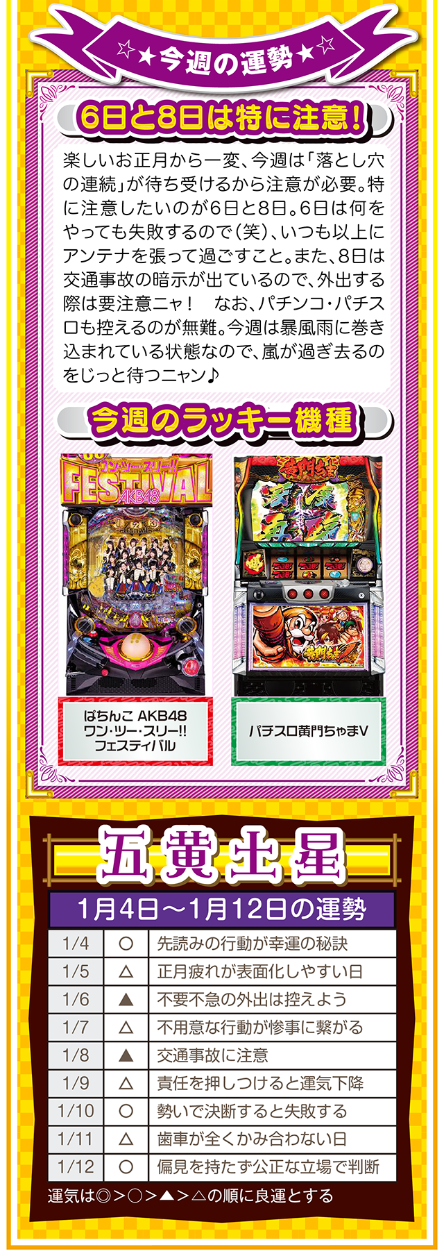 1円でも10円でも100円でも構わないニャ。毎日少しずつお金を貯める習慣が、大きな金運をつかむキッカケになることを覚えておいてほしいニャン……というわけで早速、1月6日から12日の1週間を鑑定ニャ(去年の初詣でおみくじを引いたら「凶」と書かれてて、思わず「こんなの嘘っぱちニャ!」とシャウトしたことを恥じらいつつ、オマケとして4日と5日の運勢も鑑定したニャン♡)!