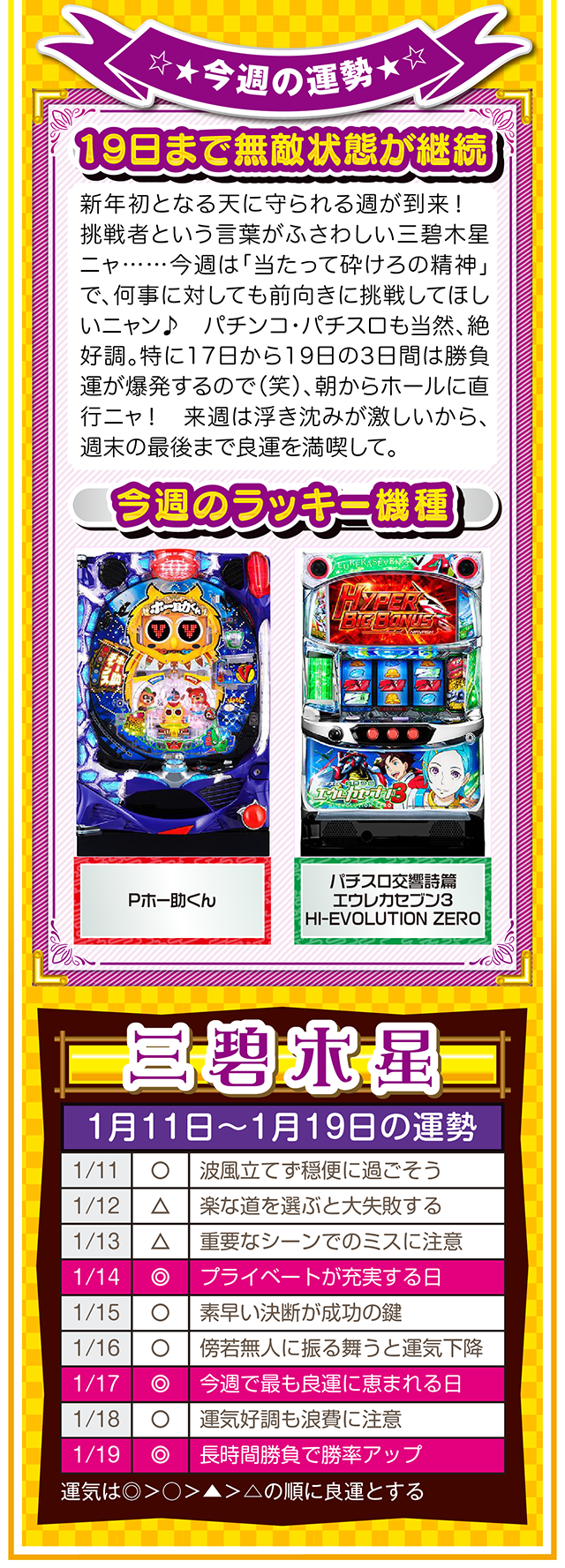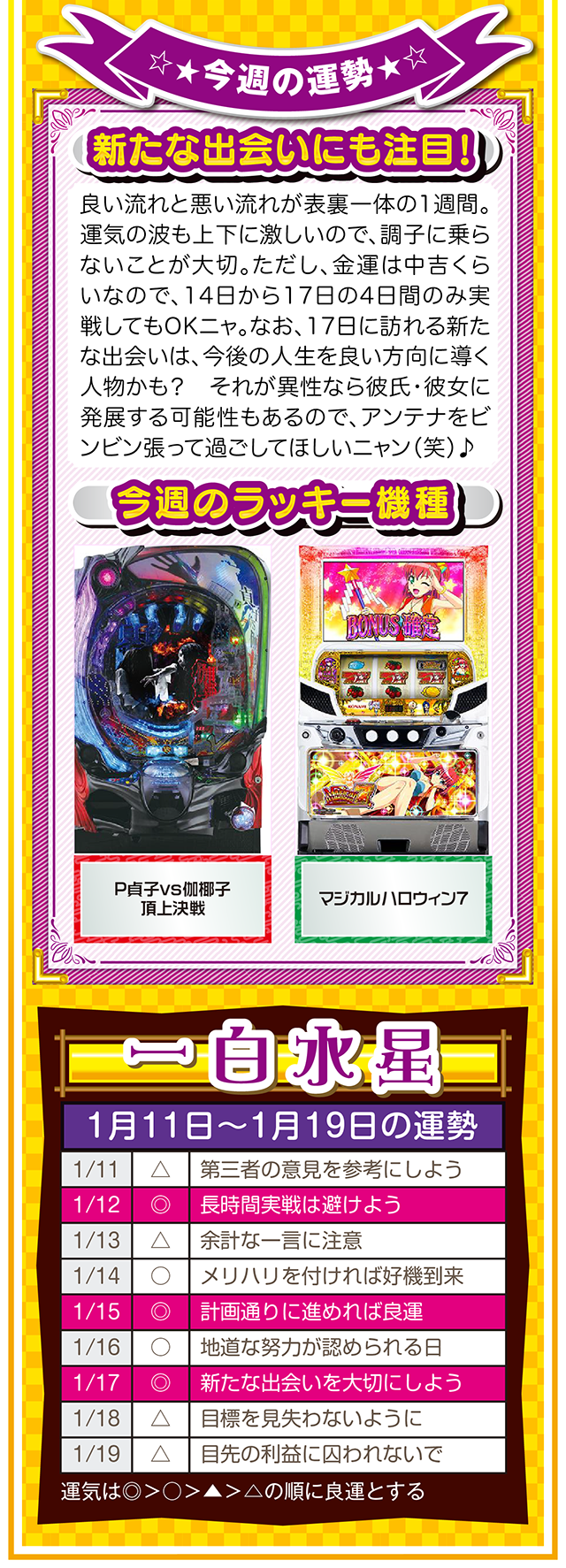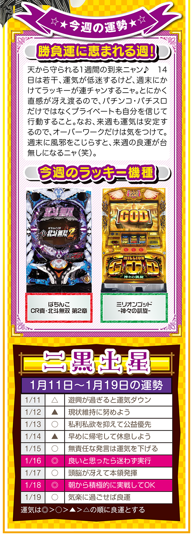 まずは金運を上げる環境を整えるためにも、週に1回、トイレと玄関を綺麗に掃除して厄落としニャ……というわけで早速、1月13日から19日の1週間を鑑定ニャ(初詣のおみくじはズバリ「中吉」で、さらに出会いも「なし」と書かれてて、今年も思わず「こんなの嘘っぱちニャ!」とシャウトしたことを恥じらいつつ、オマケとして11日と12日の運勢も鑑定したニャン♡)!