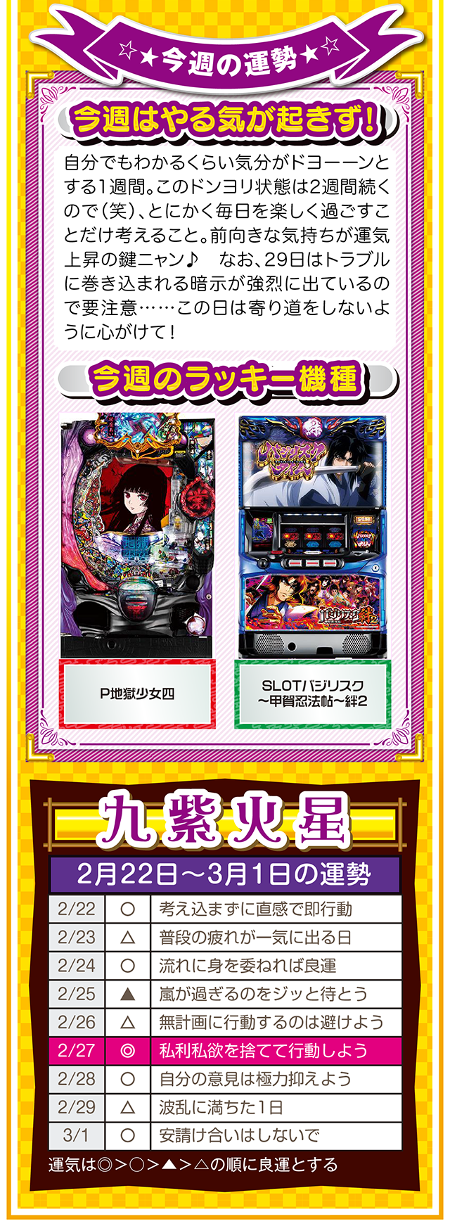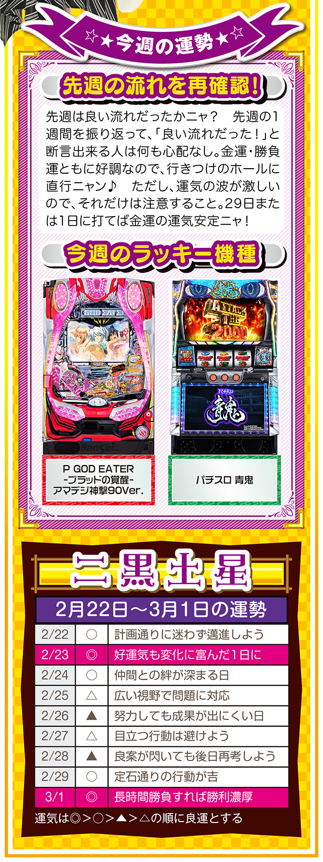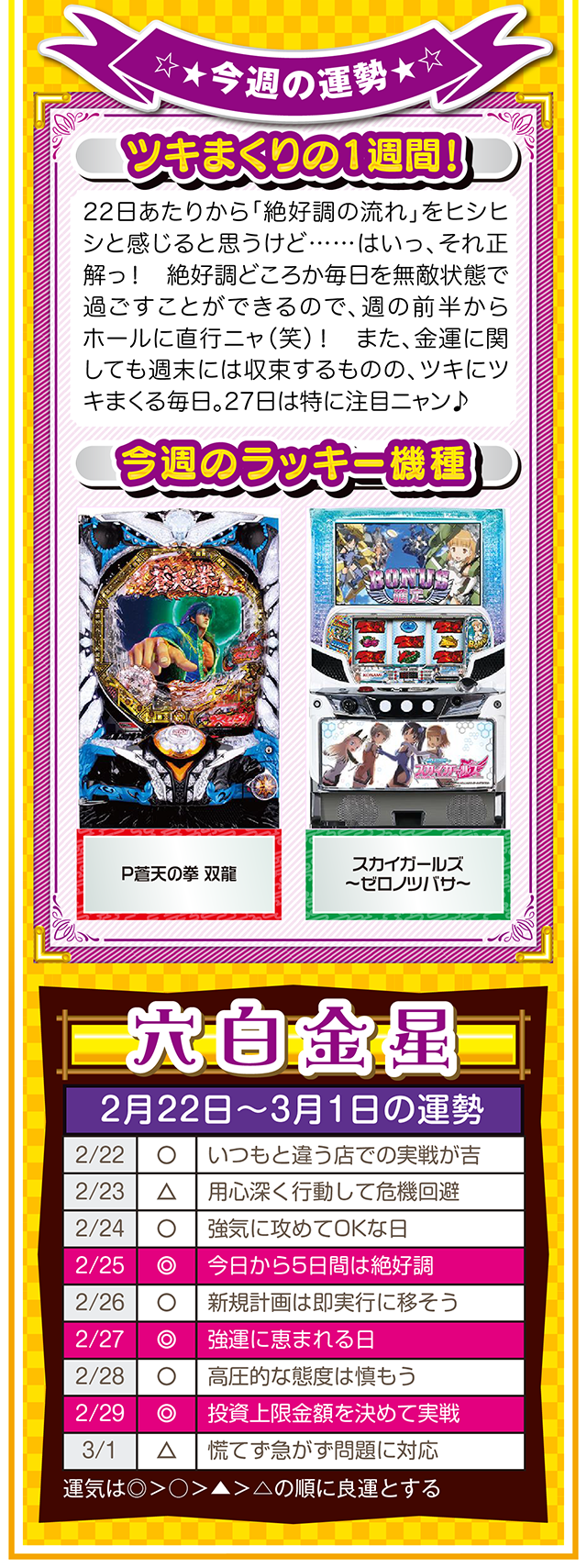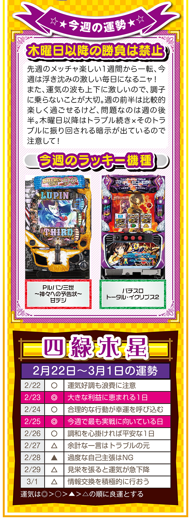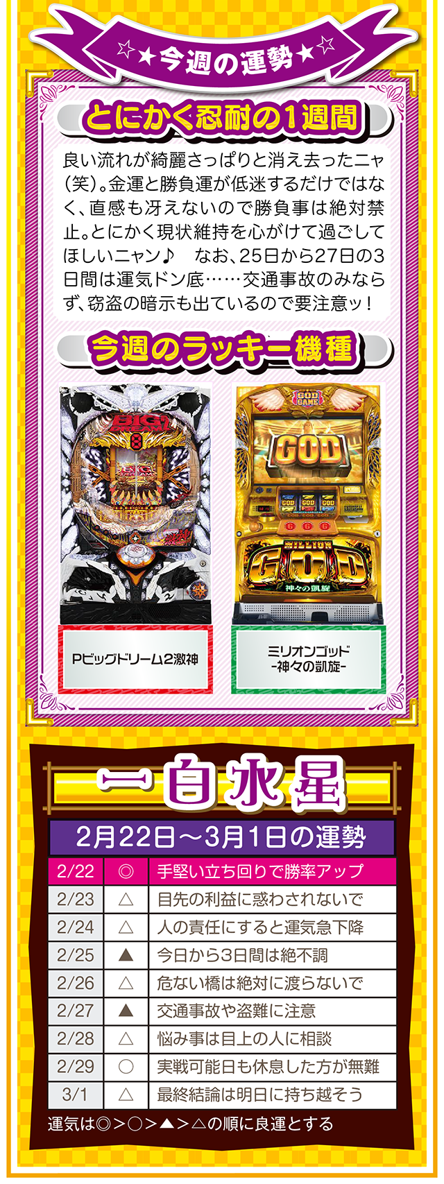 ちょっと値段が張っちゃうけど、「自分への投資」と思えば良い買い物だと思うニャン……というわけで早速、2月24日から3月1日の1週間を鑑定ニャ(白いシルク製のパジャマを購入した翌日、そのパジャマにカレーのシミを飛ばして大慌て……というか、リアルに「バキャアッ!」とシャウトした過去を振り返りつつ、オマケとして22日と23日の運勢も鑑定したニャ♡)!