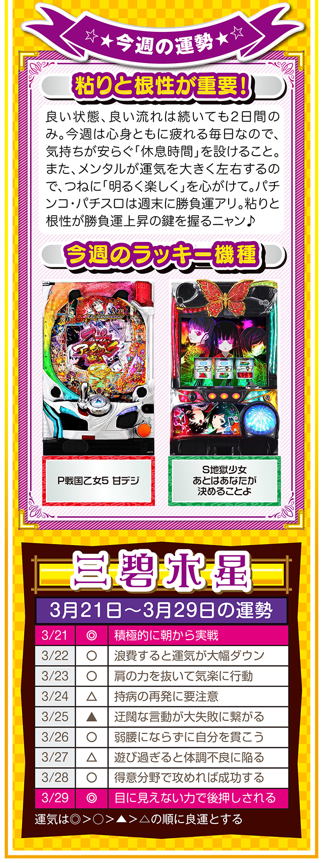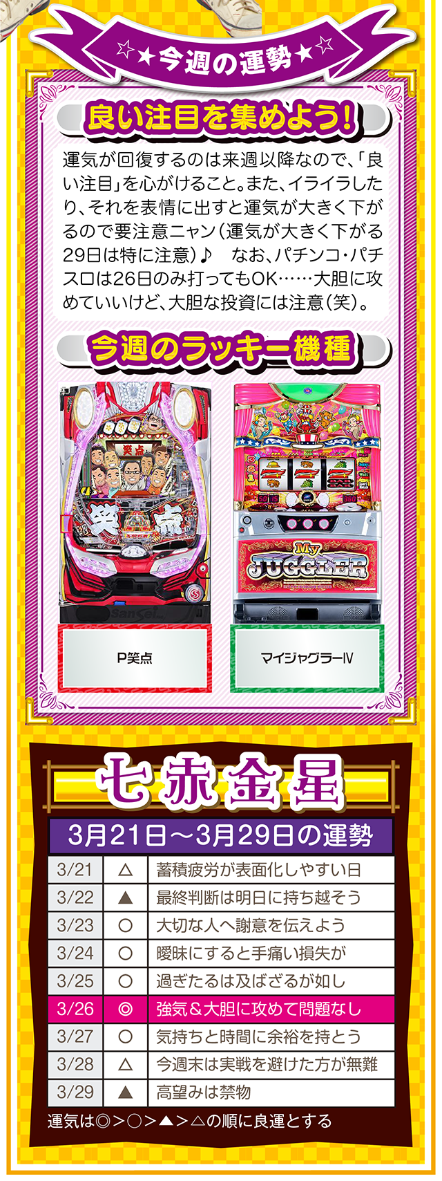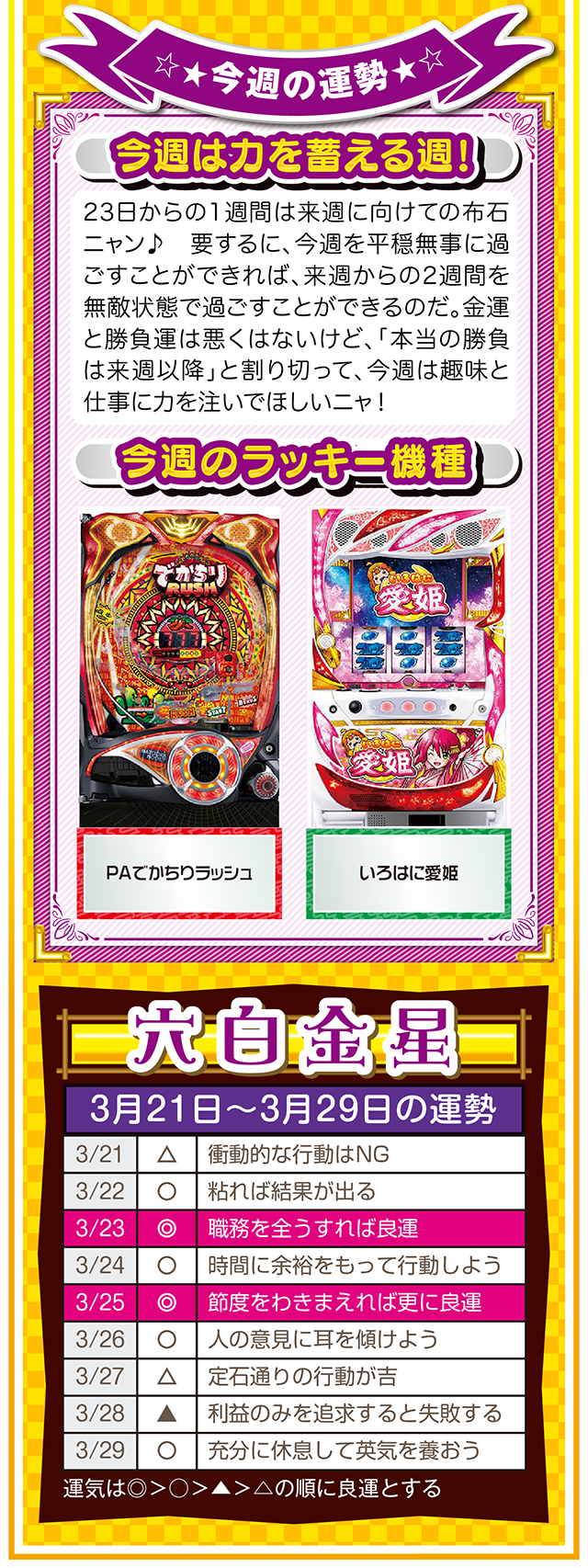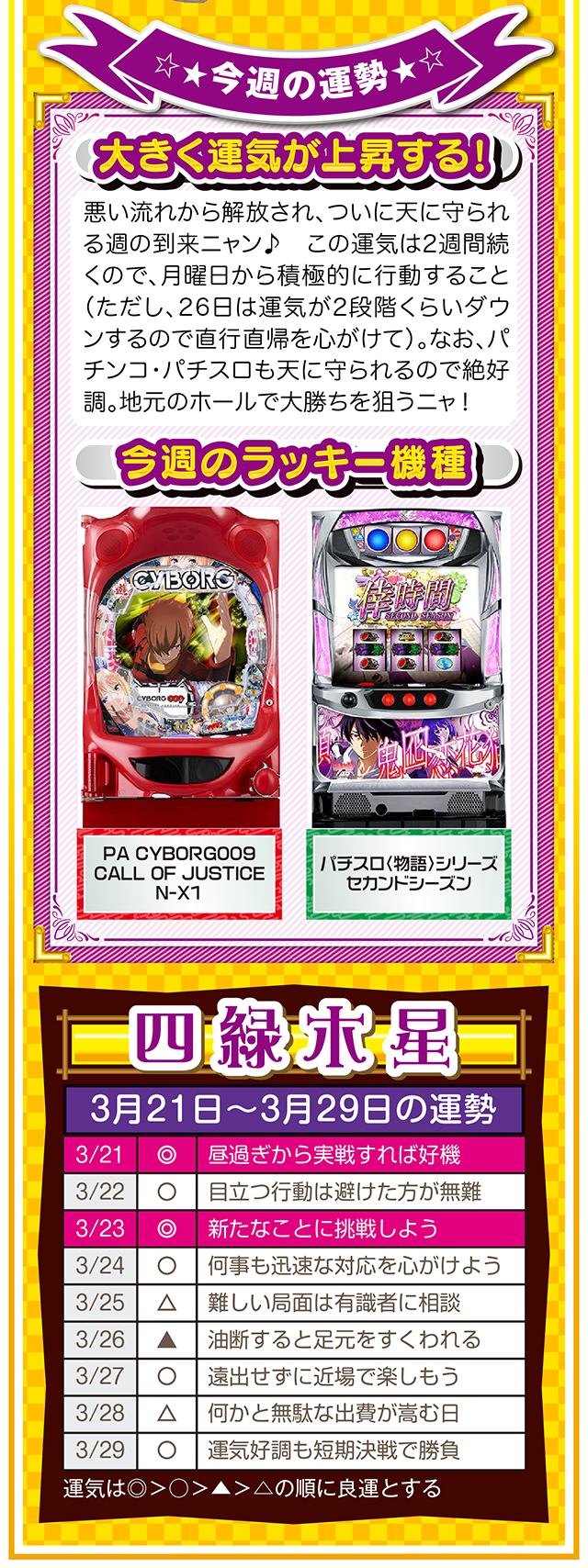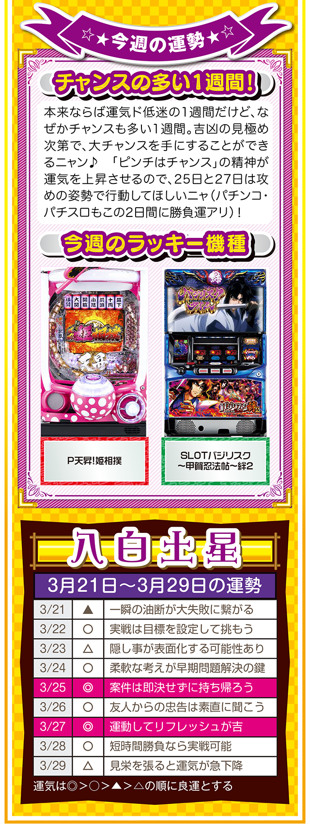 ちなみに、中高年男性特有の「お腹周りの脂肪」に関しては(ドラムロール♪)……九星気学の書籍に1ミリも書かれていないので早速、3月23日から29日の1週間を鑑定ニャ(「風水の源流が九星気学なのに、なぜ風水ばかりがフィーチャーされるニャ?」と若干の嫉妬心を抱きつつ、オマケとして21日と22日の運勢も鑑定したニャン♡)!