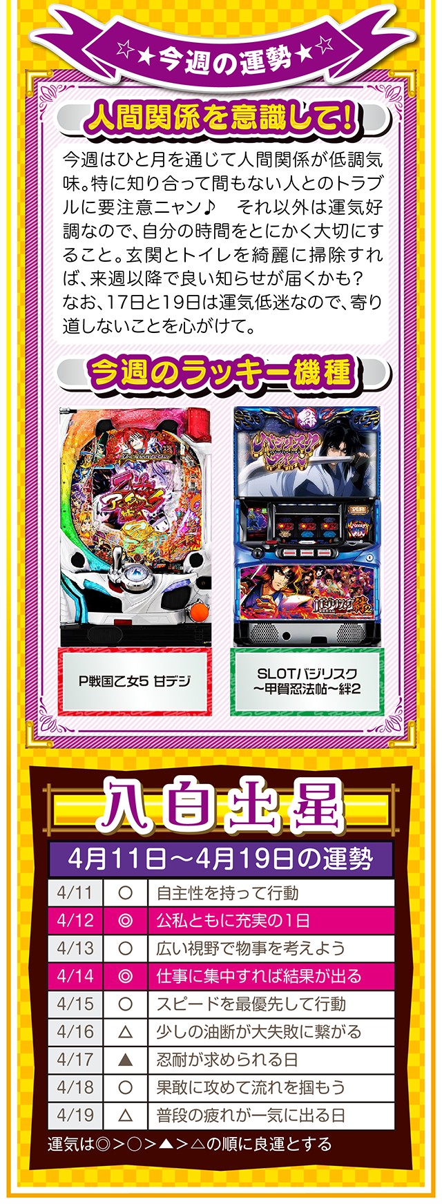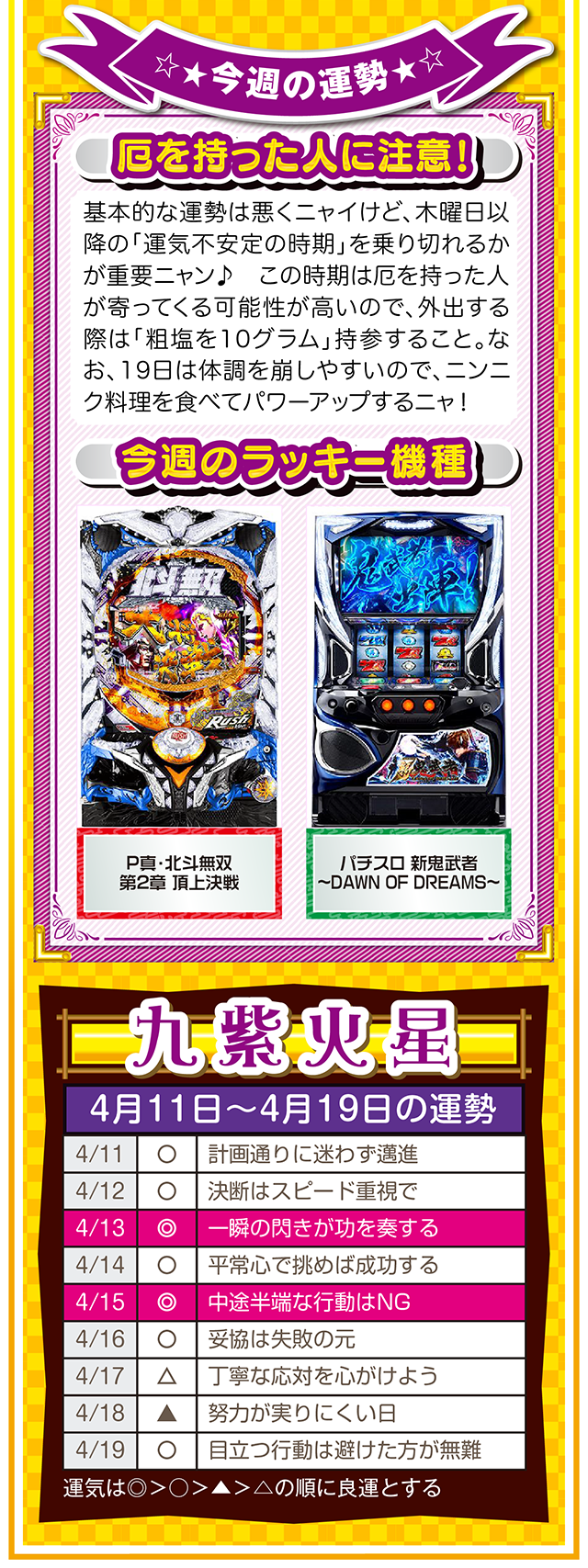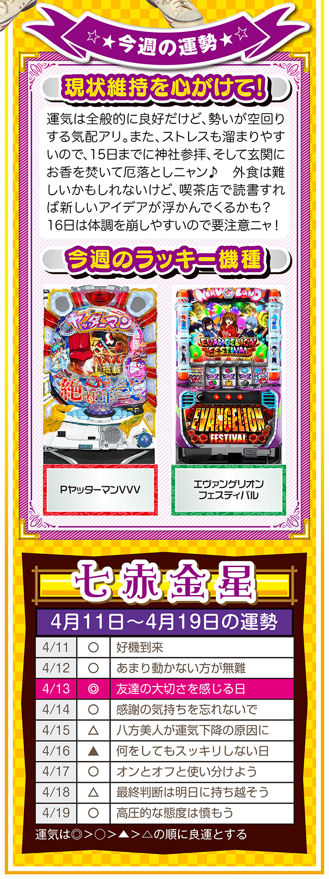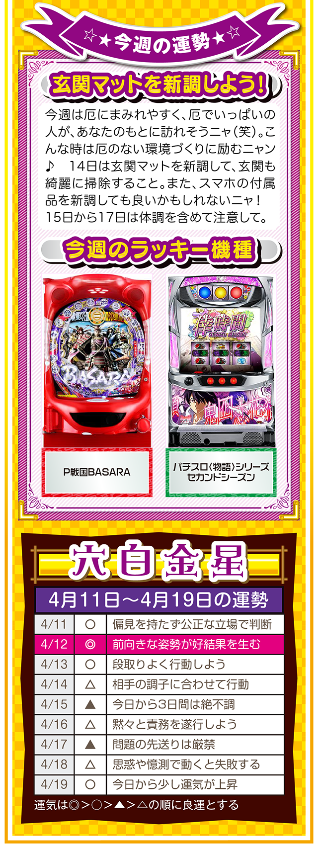 厄が祓(はら)われれば視界がパーーーッと広がって、多くの喜び事が舞い込むニャン……というわけで早速、4月13日か19日の1週間を鑑定ニャ(今週から開運アクションと開運風水をメインに執筆することを告知しつつ、オマケとして11日と12日の運勢も鑑定したニャン♡)!