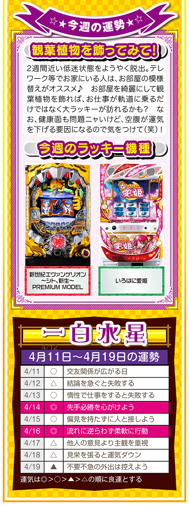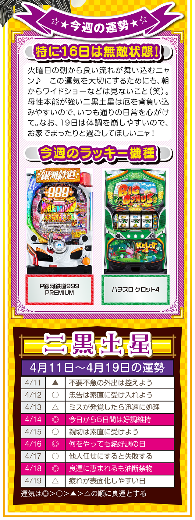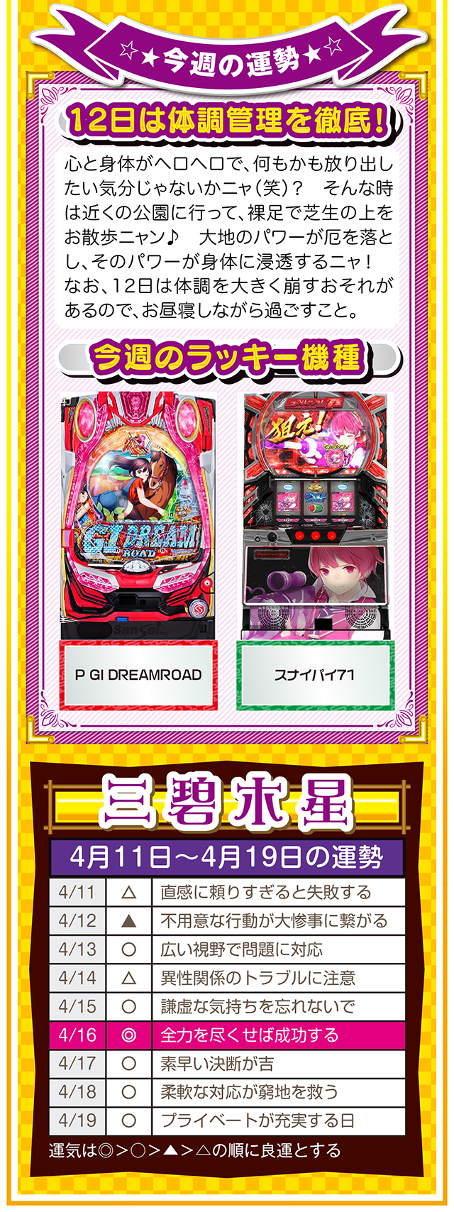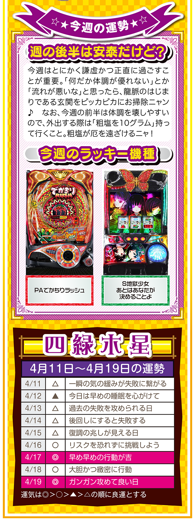 厄が祓(はら)われれば視界がパーーーッと広がって、多くの喜び事が舞い込むニャン……というわけで早速、4月13日か19日の1週間を鑑定ニャ(今週から開運アクションと開運風水をメインに執筆することを告知しつつ、オマケとして11日と12日の運勢も鑑定したニャン♡)!