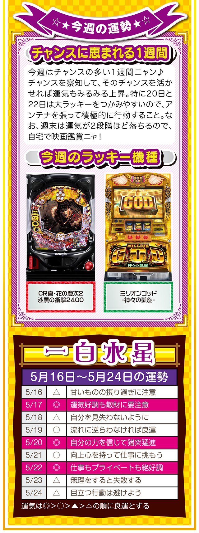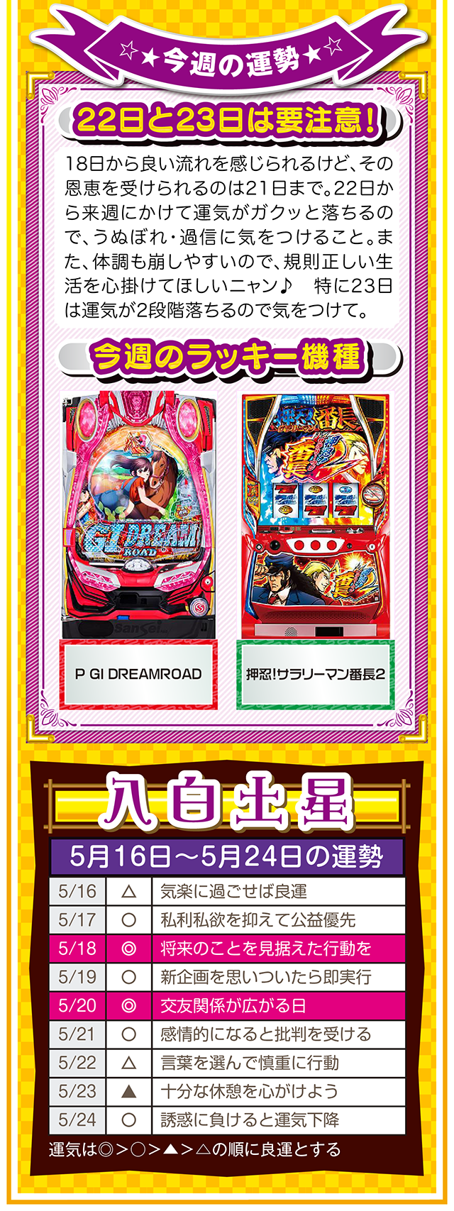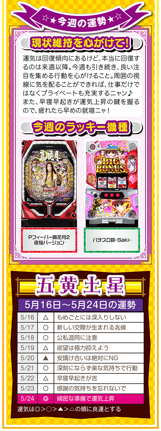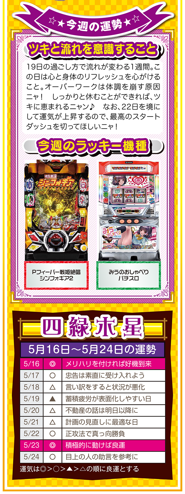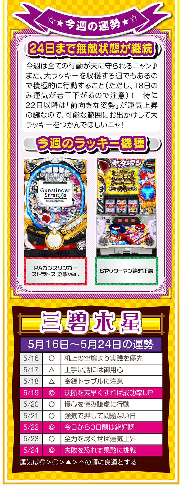 たったこれだけで視界がパーーーッと明るくなって、運気と流れをつかむことができるニャ……というわけで早速、5月18日から24日の1週間を鑑定ニャ(「来週からは金運と勝負運を中心に鑑定できるかも!?」と淡い希望を抱きつつ(笑)、オマケとして16日と17日の運勢も鑑定したニャン♡)!