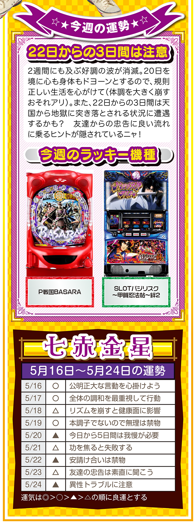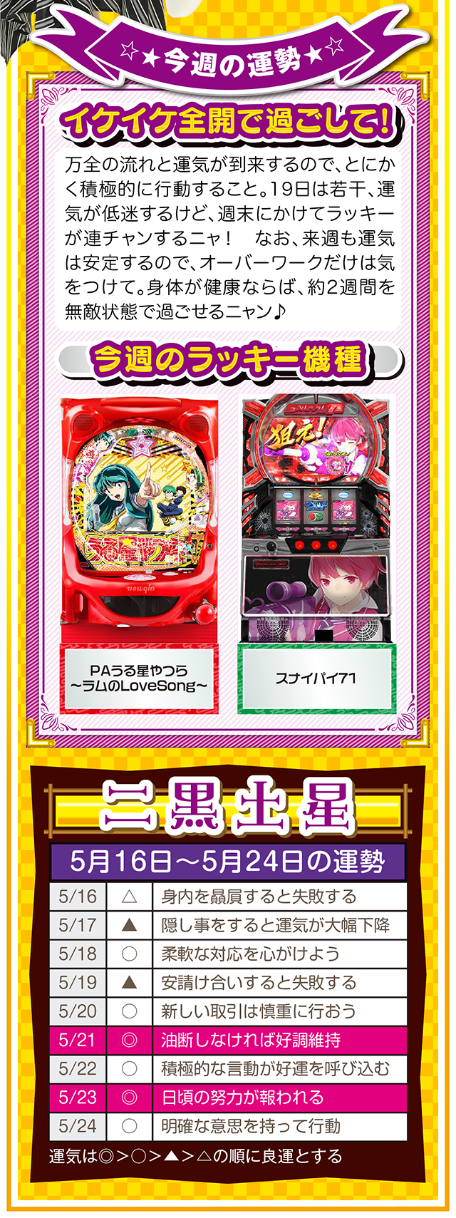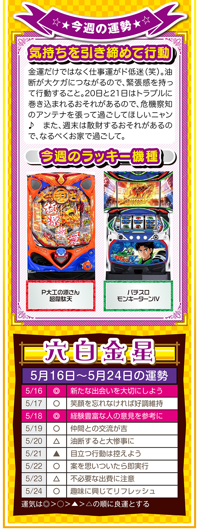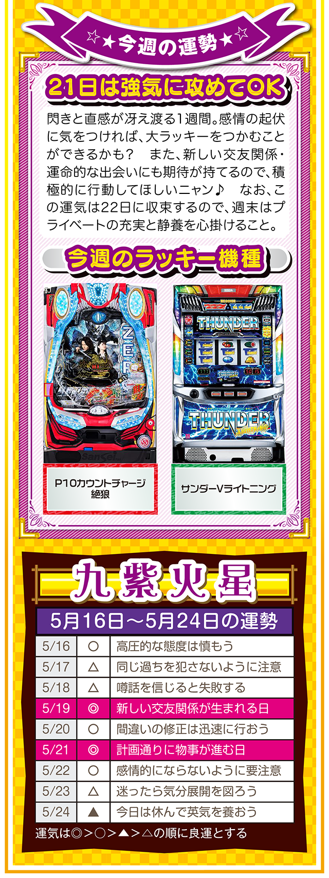 たったこれだけで視界がパーーーッと明るくなって、運気と流れをつかむことができるニャ……というわけで早速、5月18日から24日の1週間を鑑定ニャ(「来週からは金運と勝負運を中心に鑑定できるかも!?」と淡い希望を抱きつつ(笑)、オマケとして16日と17日の運勢も鑑定したニャン♡)!