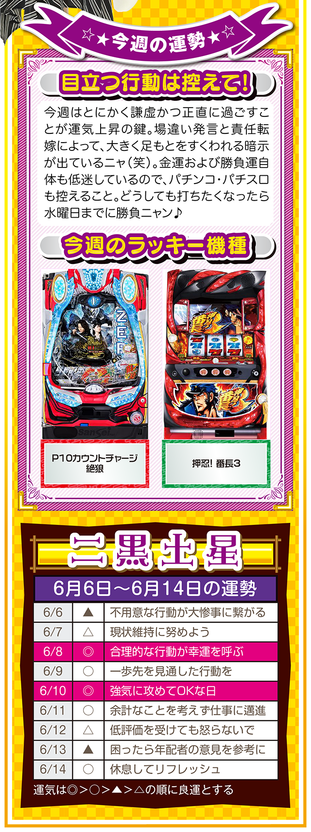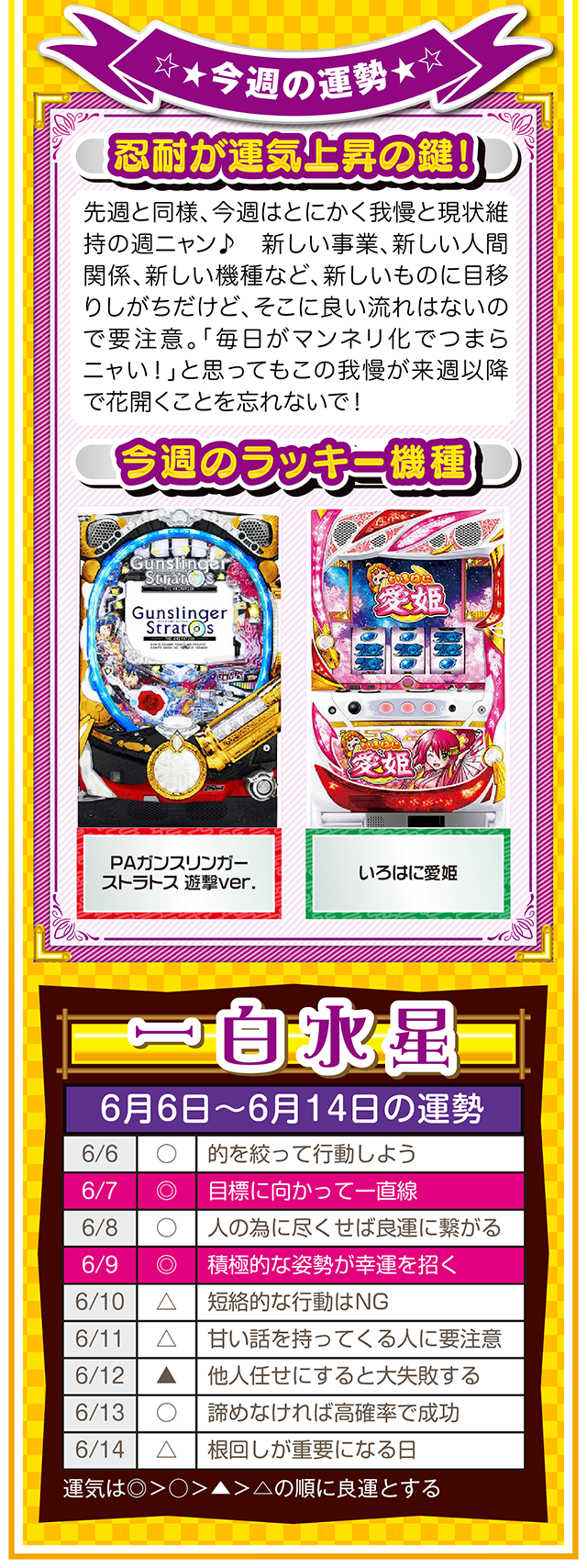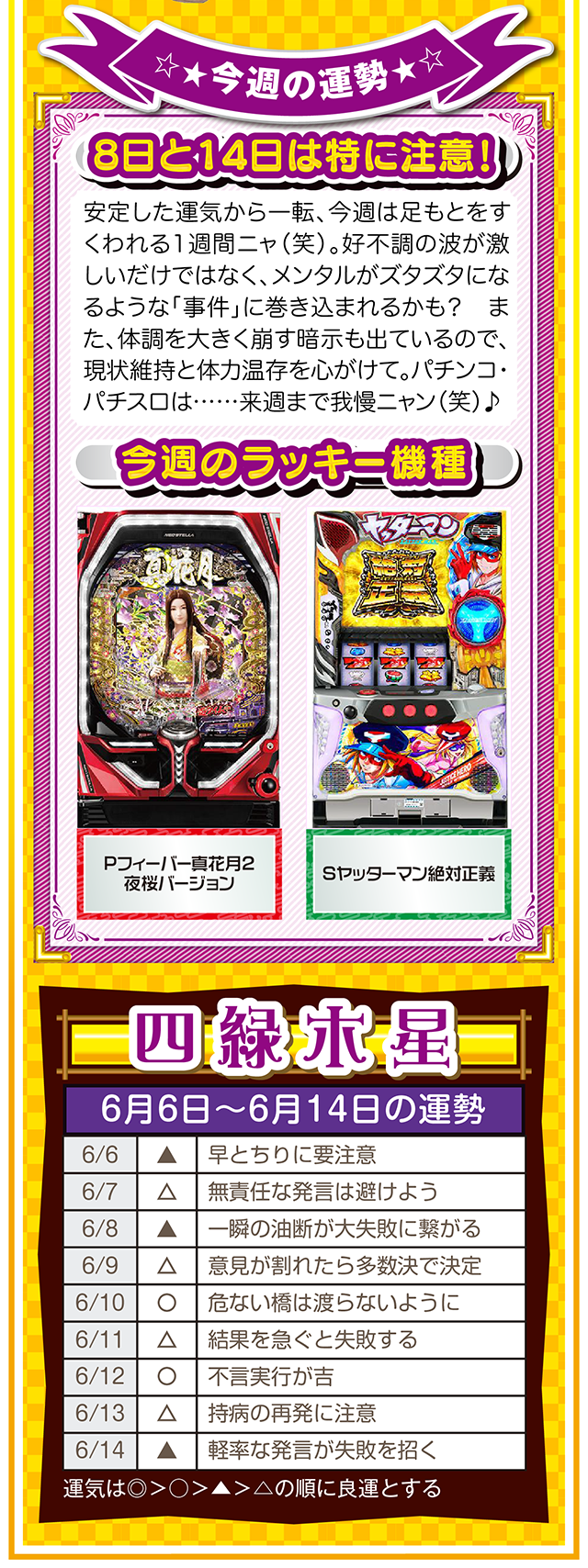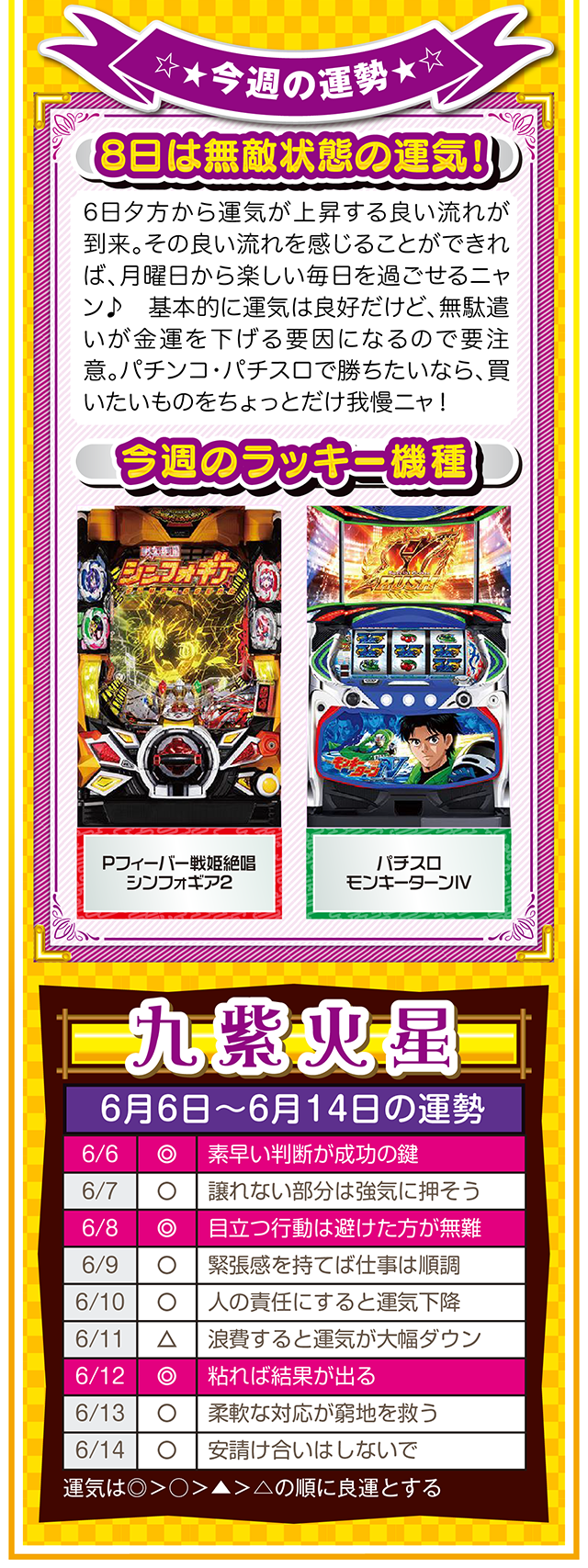 だから、運とかツキという言葉を使う人は、他人から愛される努力をして、もっと真剣に生きてみるニャン……というわけで早速、6月8日から14日の1週間を鑑定ニャ(パチンコ屋さんがいつもの日常に戻るのはもうちょっと先だけど、金運と勝負運中心の鑑定をすることを報告しつつ、オマケとして6日と7日の運勢も鑑定したニャン♡)!