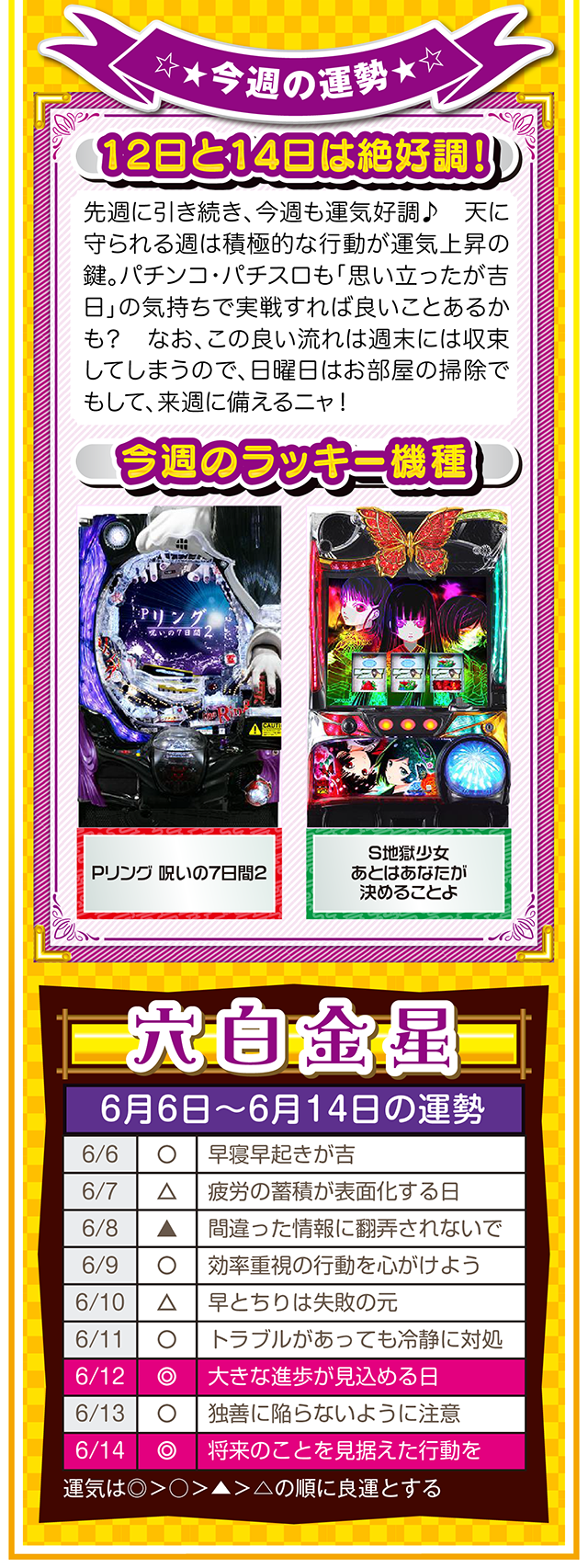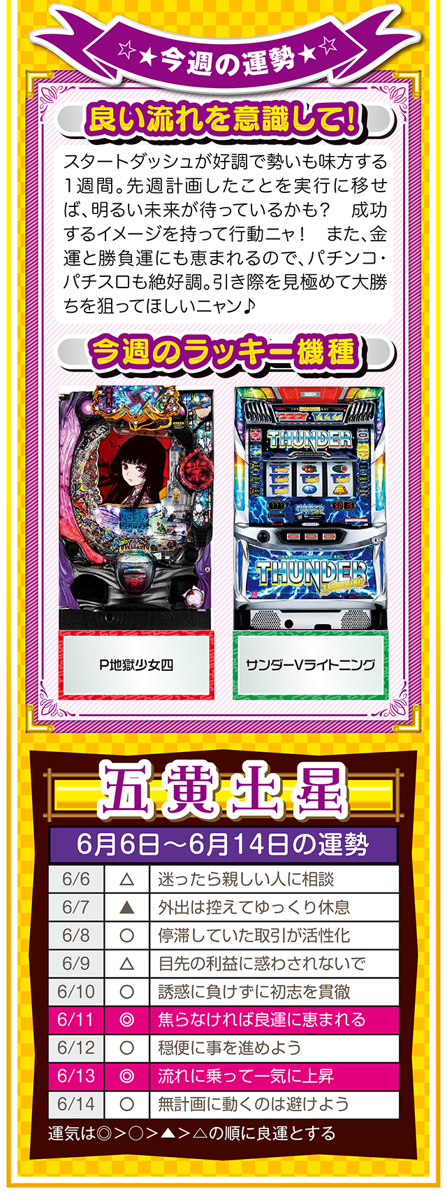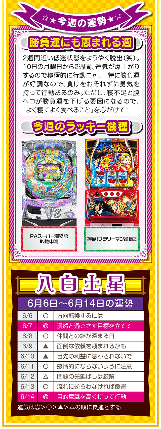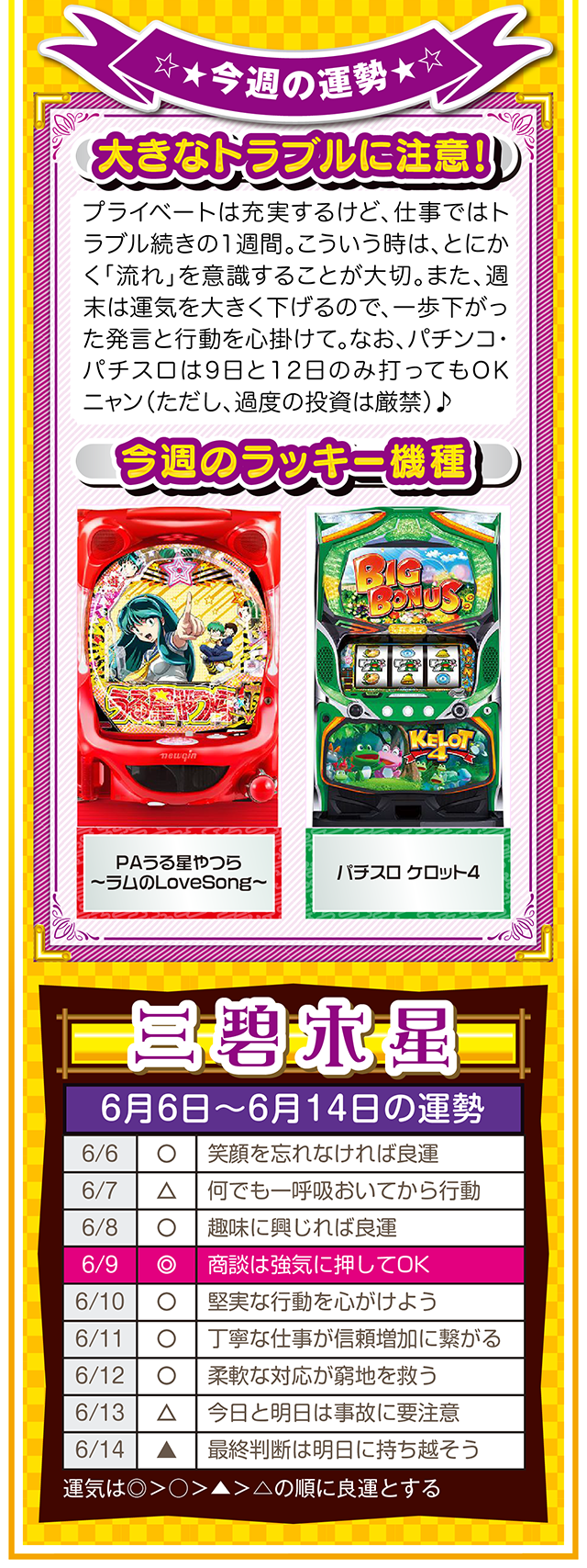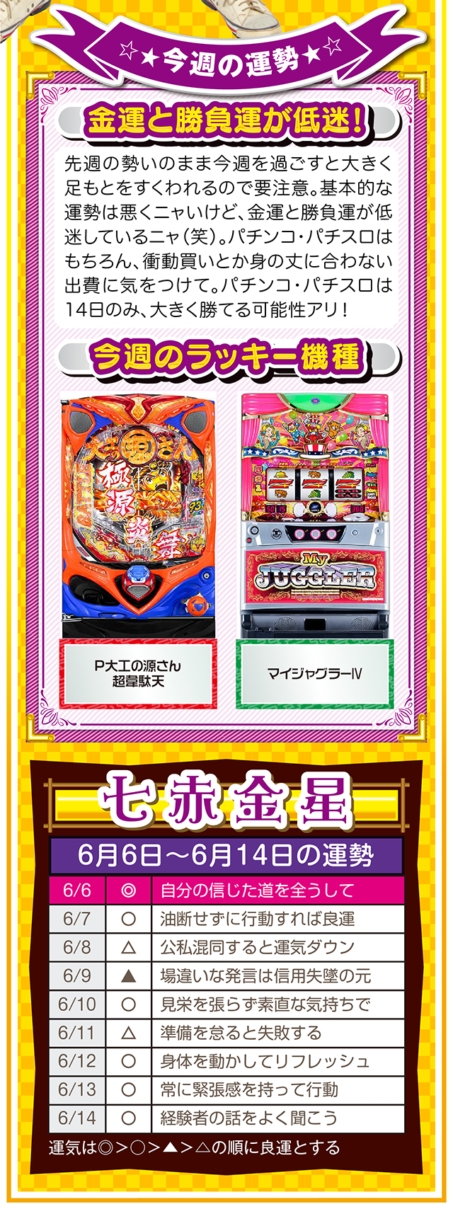 だから、運とかツキという言葉を使う人は、他人から愛される努力をして、もっと真剣に生きてみるニャン……というわけで早速、6月8日から14日の1週間を鑑定ニャ(パチンコ屋さんがいつもの日常に戻るのはもうちょっと先だけど、金運と勝負運中心の鑑定をすることを報告しつつ、オマケとして6日と7日の運勢も鑑定したニャン♡)!