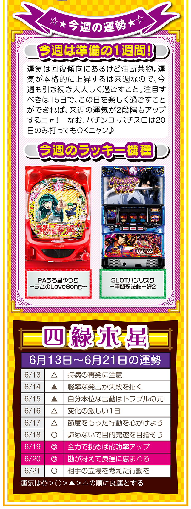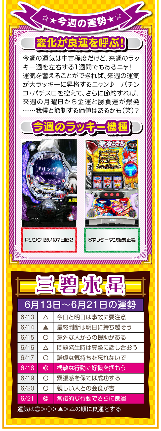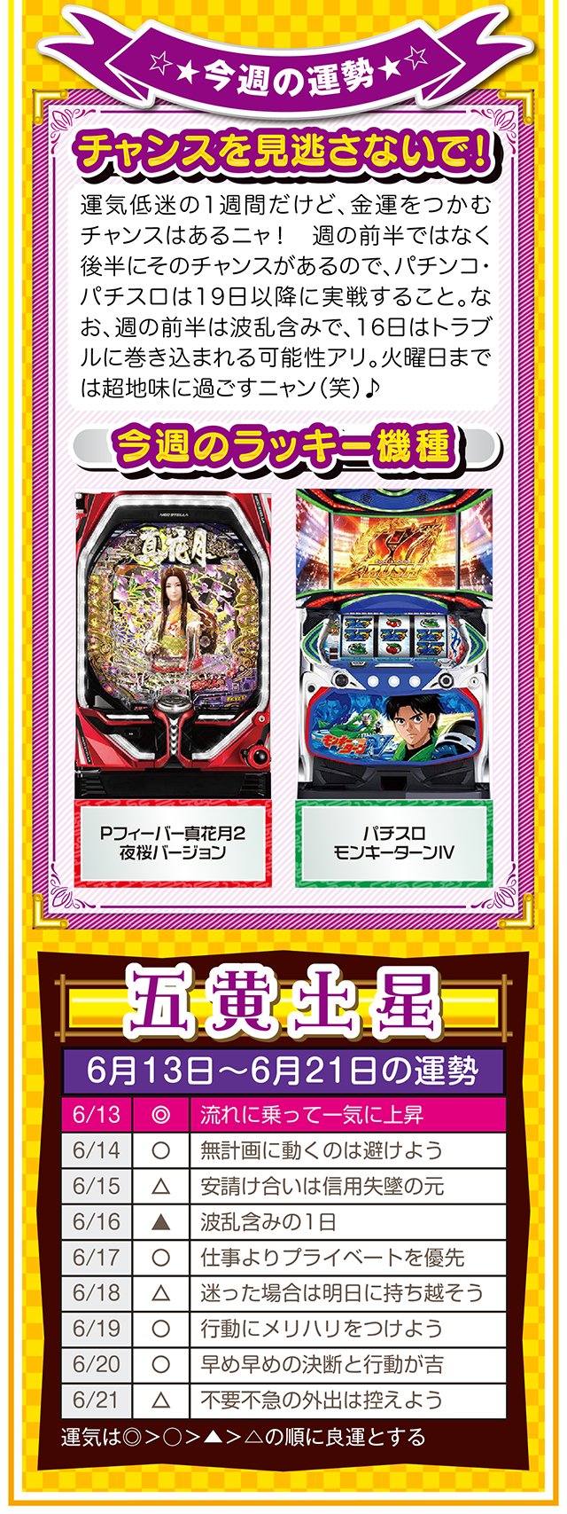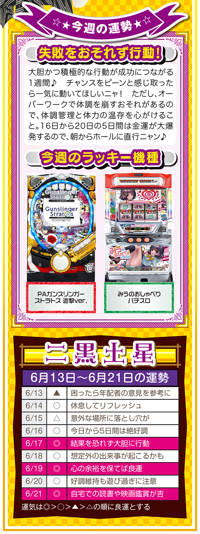 人生は失敗の連続だし、失敗を積み重ねた人にのみ、成功と幸運が訪れるニャン……というわけで早速、6月15日から21日の1週間を鑑定ニャ(「いつになったら婚活パーティは解禁になるんだろ?」とリアルに悩みつつ、オマケとして13日と14日の運勢も鑑定したニャン♡)!