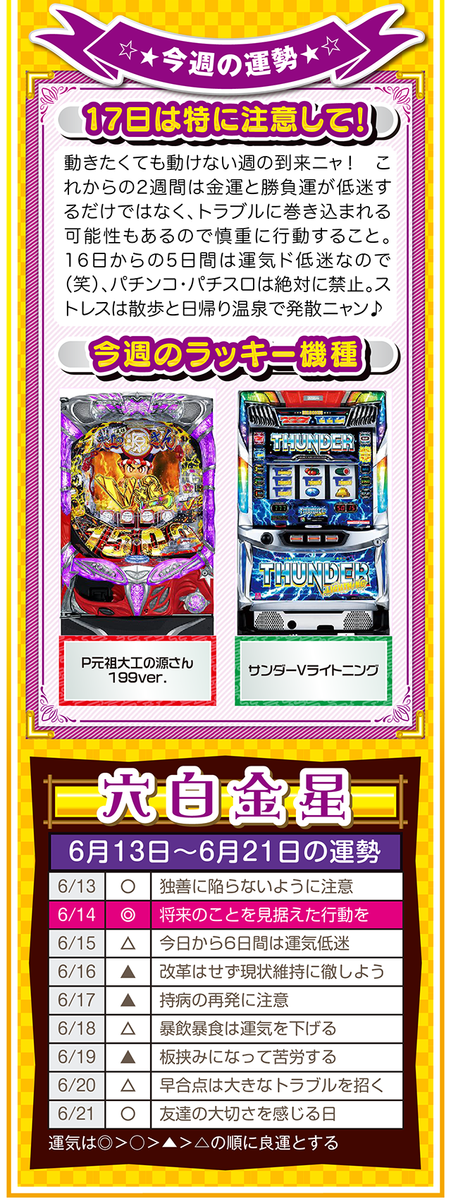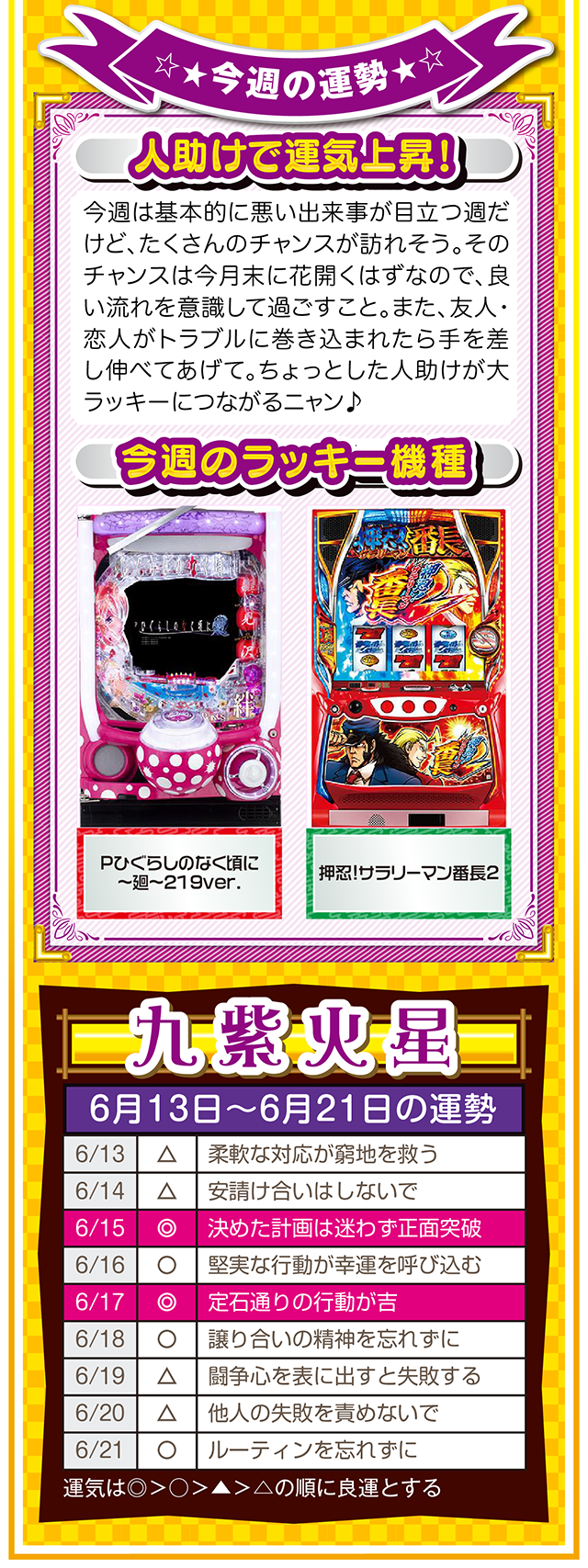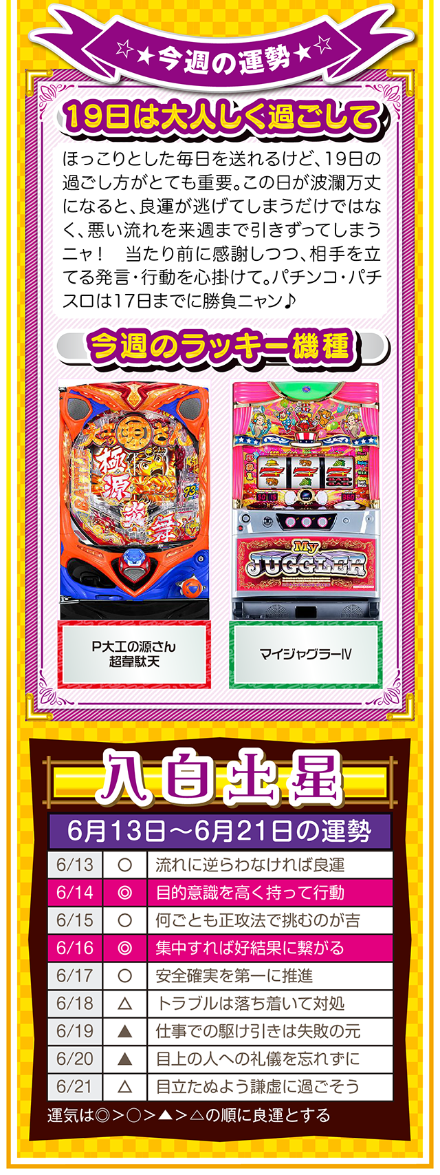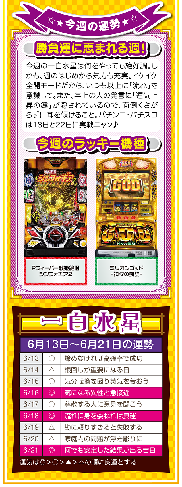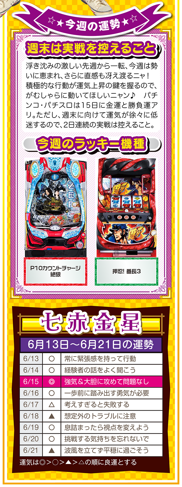 人生は失敗の連続だし、失敗を積み重ねた人にのみ、成功と幸運が訪れるニャン……というわけで早速、6月15日から21日の1週間を鑑定ニャ(「いつになったら婚活パーティは解禁になるんだろ?」とリアルに悩みつつ、オマケとして13日と14日の運勢も鑑定したニャン♡)!