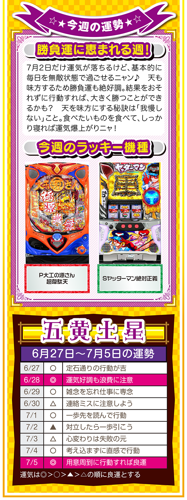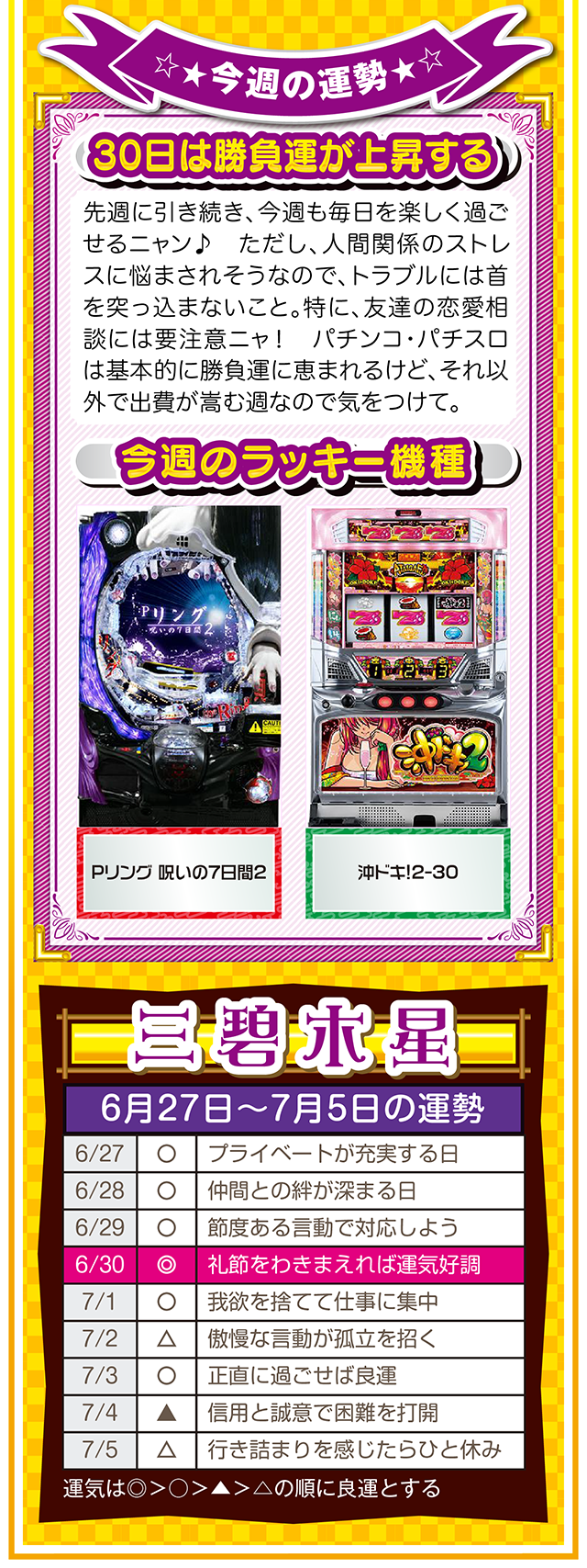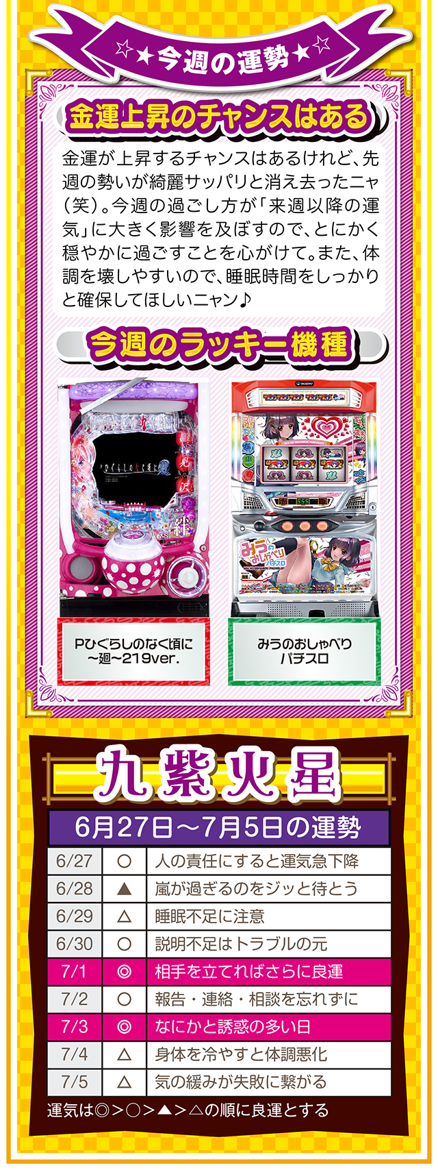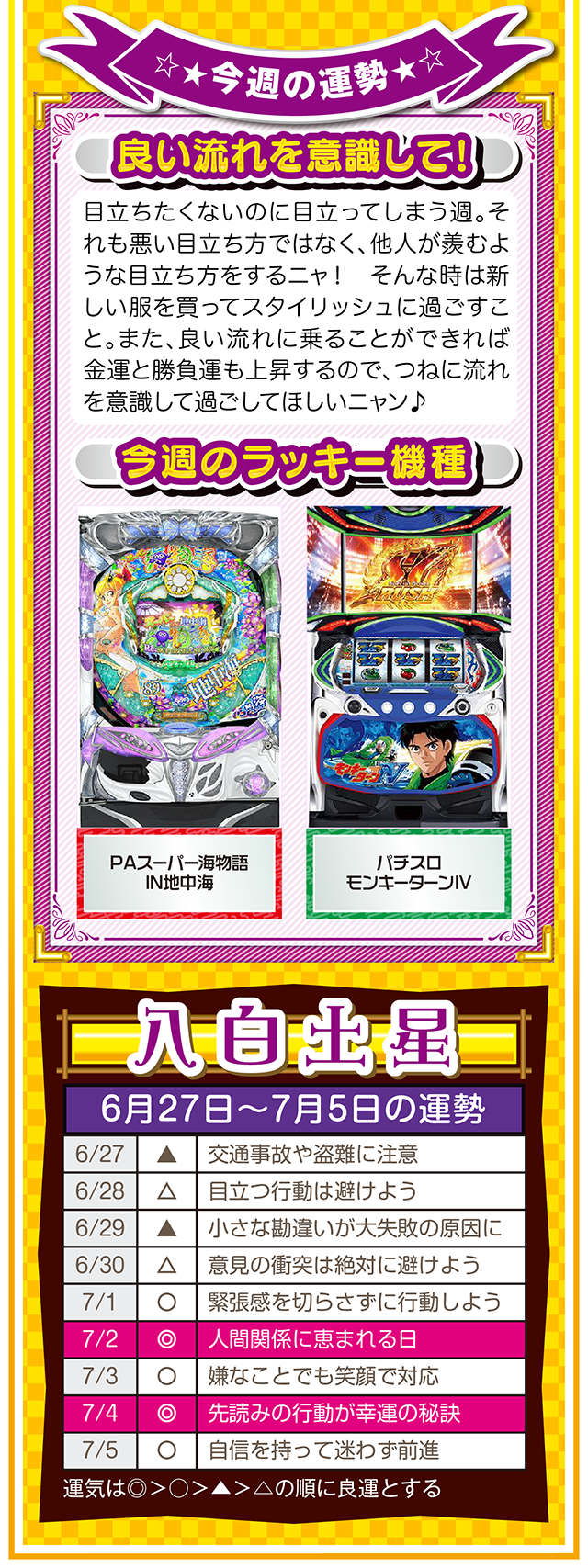 それがない人とは、無理して付き合わず、キッパリと縁を切っちゃっていいと思うニャ(笑)……というわけで早速、6月29日から7月5日の1週間を鑑定ニャ(「縁を切りすぎたから異性との縁がないんだろか?」とリアルに悩みつつ、オマケとして27日と28日の運勢も鑑定したニャン♡)!