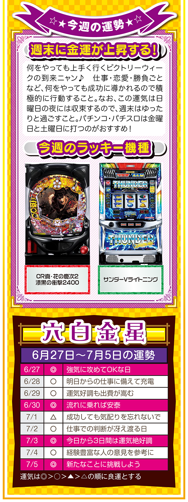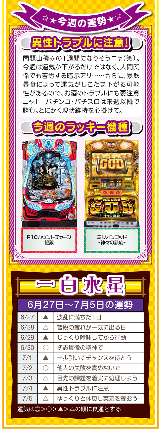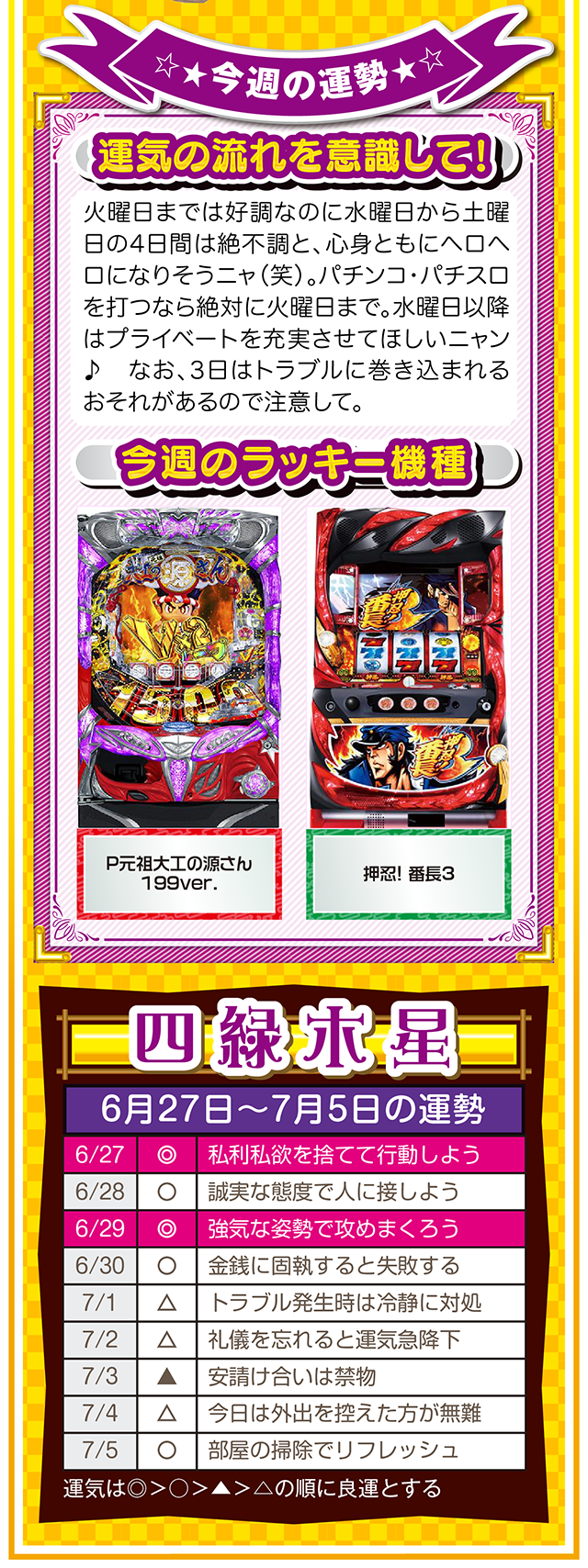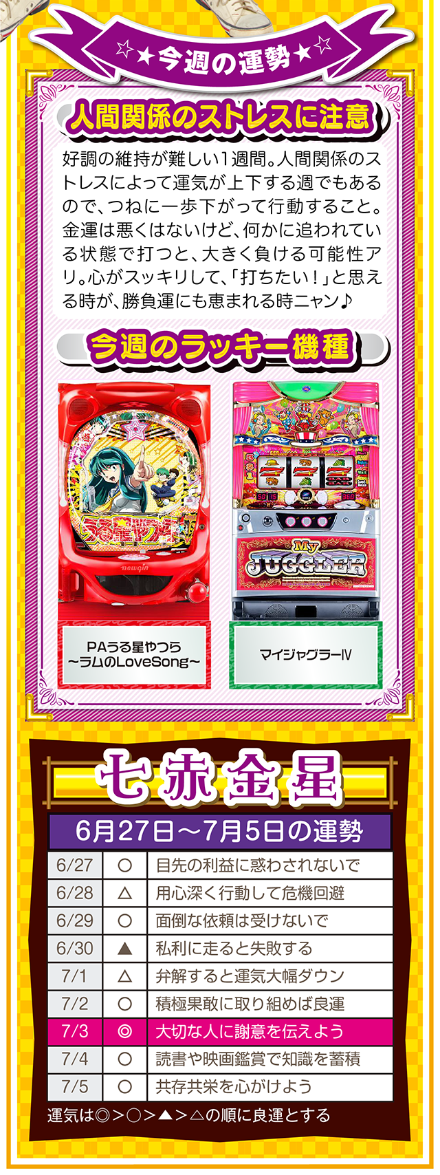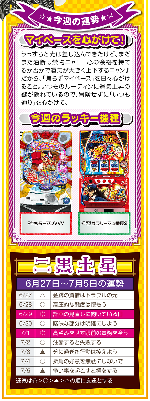 それがない人とは、無理して付き合わず、キッパリと縁を切っちゃっていいと思うニャ(笑)……というわけで早速、6月29日から7月5日の1週間を鑑定ニャ(「縁を切りすぎたから異性との縁がないんだろか?」とリアルに悩みつつ、オマケとして27日と28日の運勢も鑑定したニャン♡)!