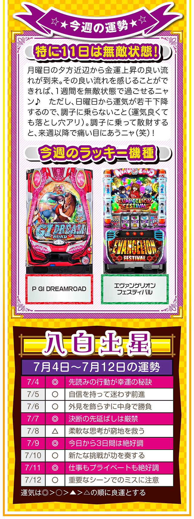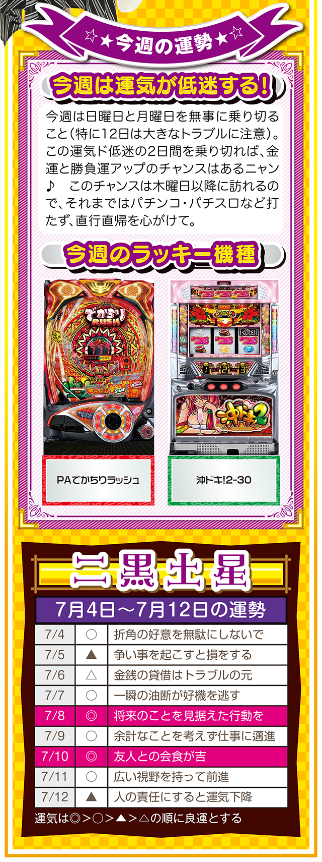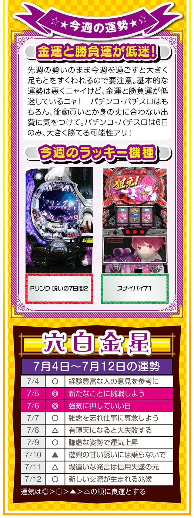 嫌いな人の顔色をうかがったって、何も楽しくないし何も変わらない。合わない人には「合わせない」。時には「嫌ってくれてありがとう」のハートが必要ニャ……というわけで早速、7月6日から7月12日の1週間を鑑定ニャ(「ほんっっっと一白水星と九紫火星って相性悪くね?」とイケメンの多い九紫火星に対して毒を吐きつつ、オマケとして4日と5日の運勢も鑑定したニャン♡)!