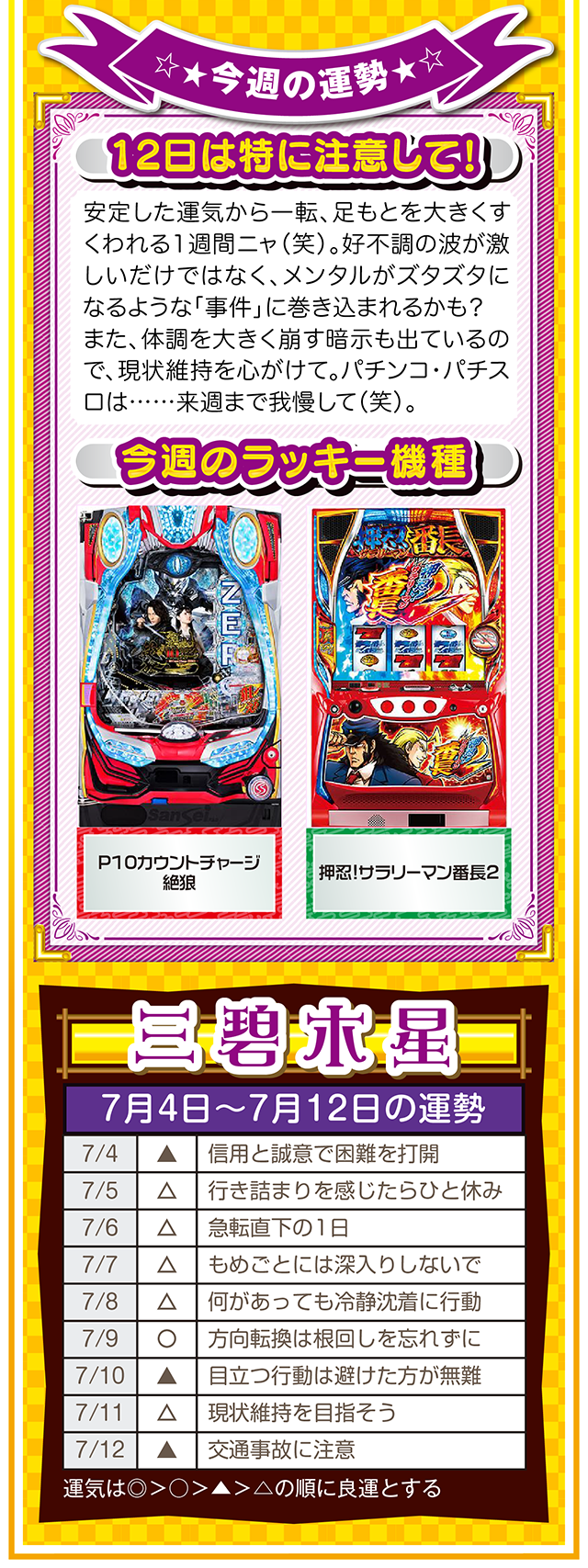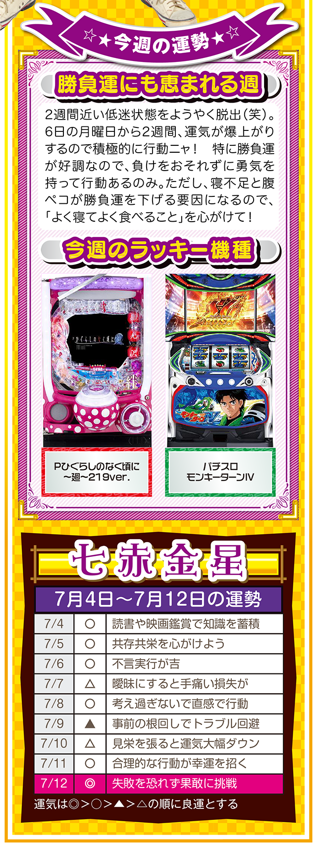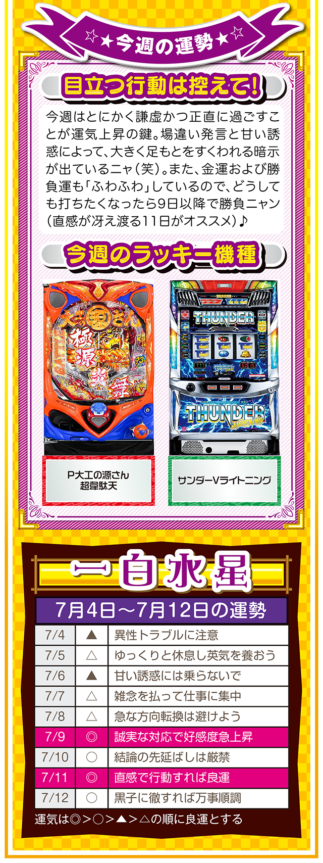 嫌いな人の顔色をうかがったって、何も楽しくないし何も変わらない。合わない人には「合わせない」。時には「嫌ってくれてありがとう」のハートが必要ニャ……というわけで早速、7月6日から7月12日の1週間を鑑定ニャ(「ほんっっっと一白水星と九紫火星って相性悪くね?」とイケメンの多い九紫火星に対して毒を吐きつつ、オマケとして4日と5日の運勢も鑑定したニャン♡)!