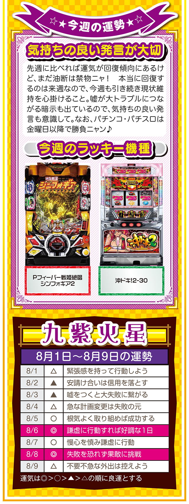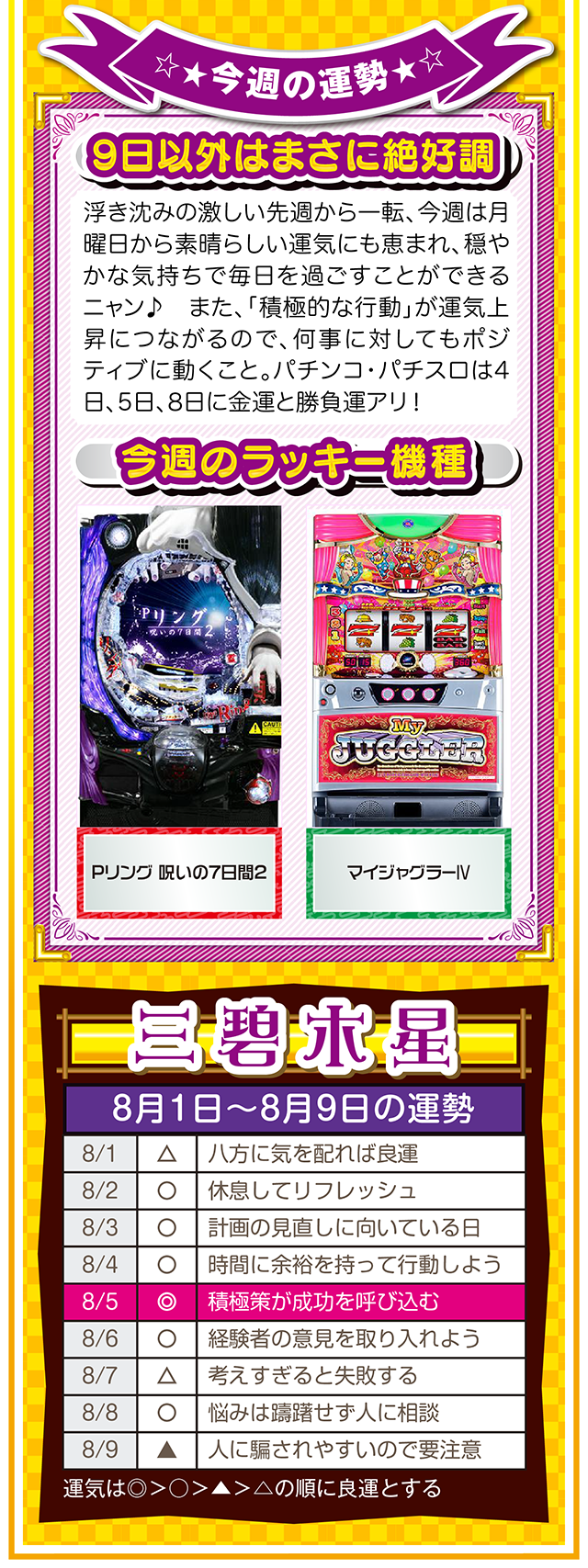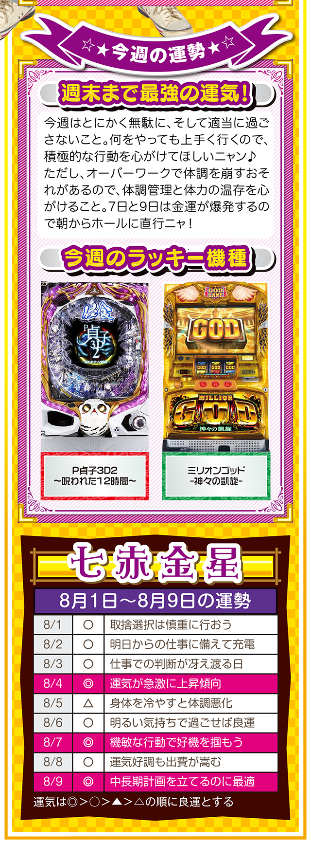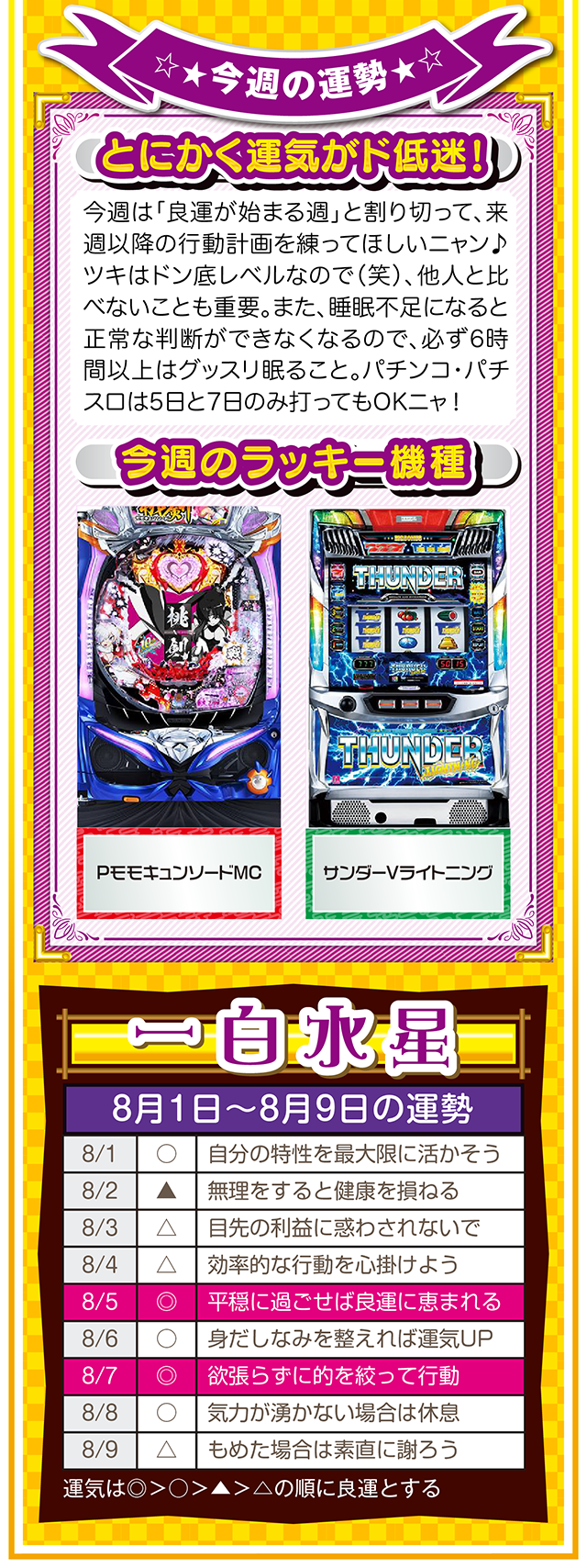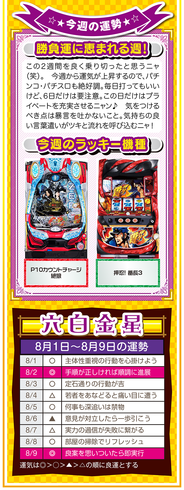 ツキと流れをつかみたいのなら、「喜び」について考えること。喜びを感じて、それを伝えることができれば自然とツキと流れが訪れるニャン……というわけで早速、8月3日から8月9日の1週間を鑑定ニャ(「春のG1全敗して、どう笑顔になれと?」と自問自答を繰り返しつつ、今週もオマケとして1日と2日の運勢も鑑定したニャン♡)!