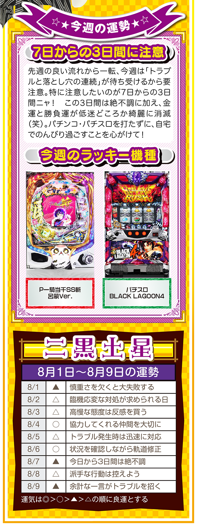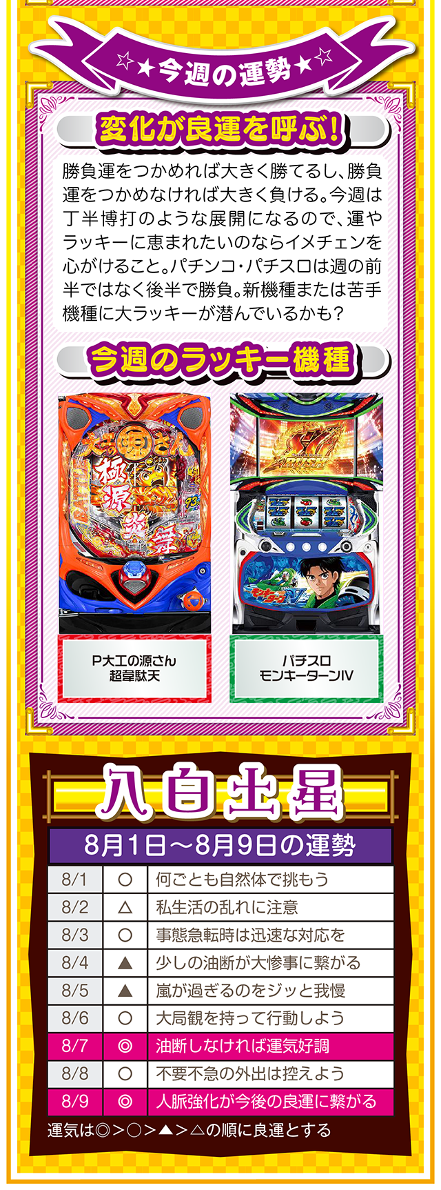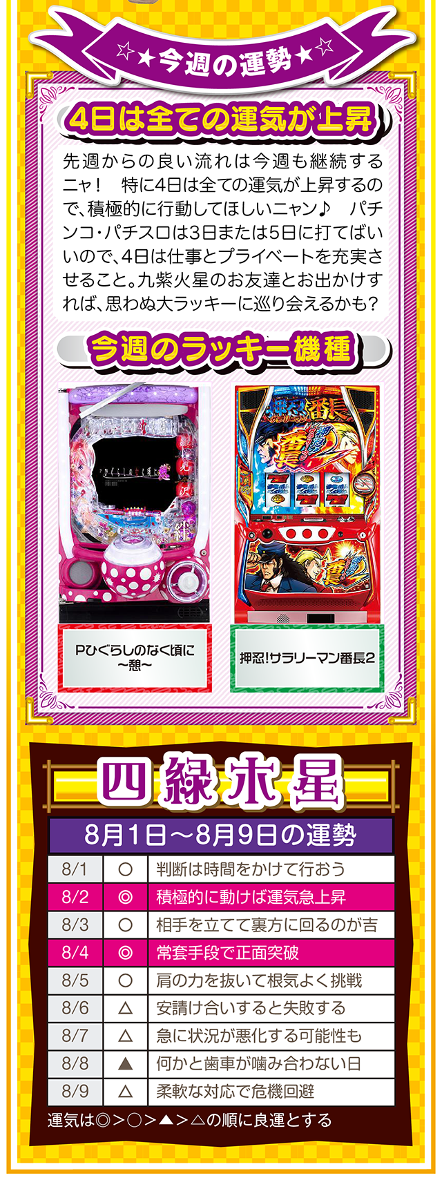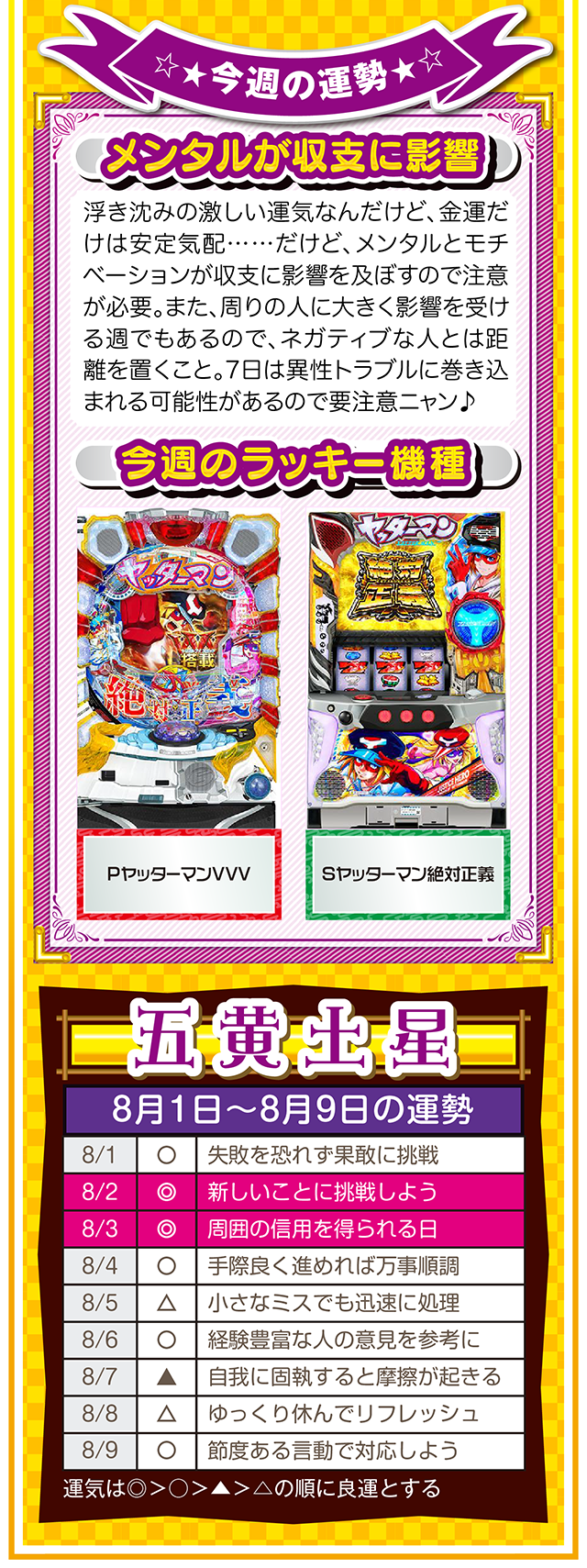 ツキと流れをつかみたいのなら、「喜び」について考えること。喜びを感じて、それを伝えることができれば自然とツキと流れが訪れるニャン……というわけで早速、8月3日から8月9日の1週間を鑑定ニャ(「春のG1全敗して、どう笑顔になれと?」と自問自答を繰り返しつつ、今週もオマケとして1日と2日の運勢も鑑定したニャン♡)!