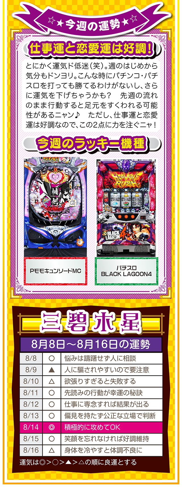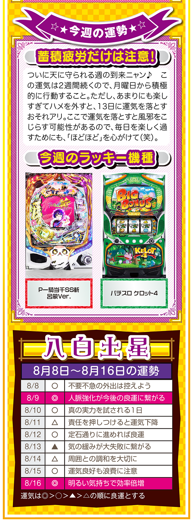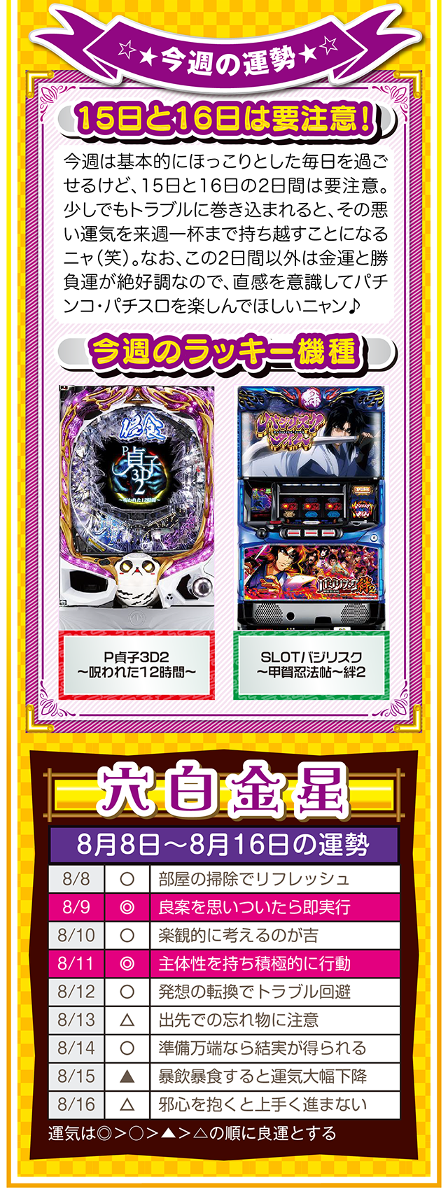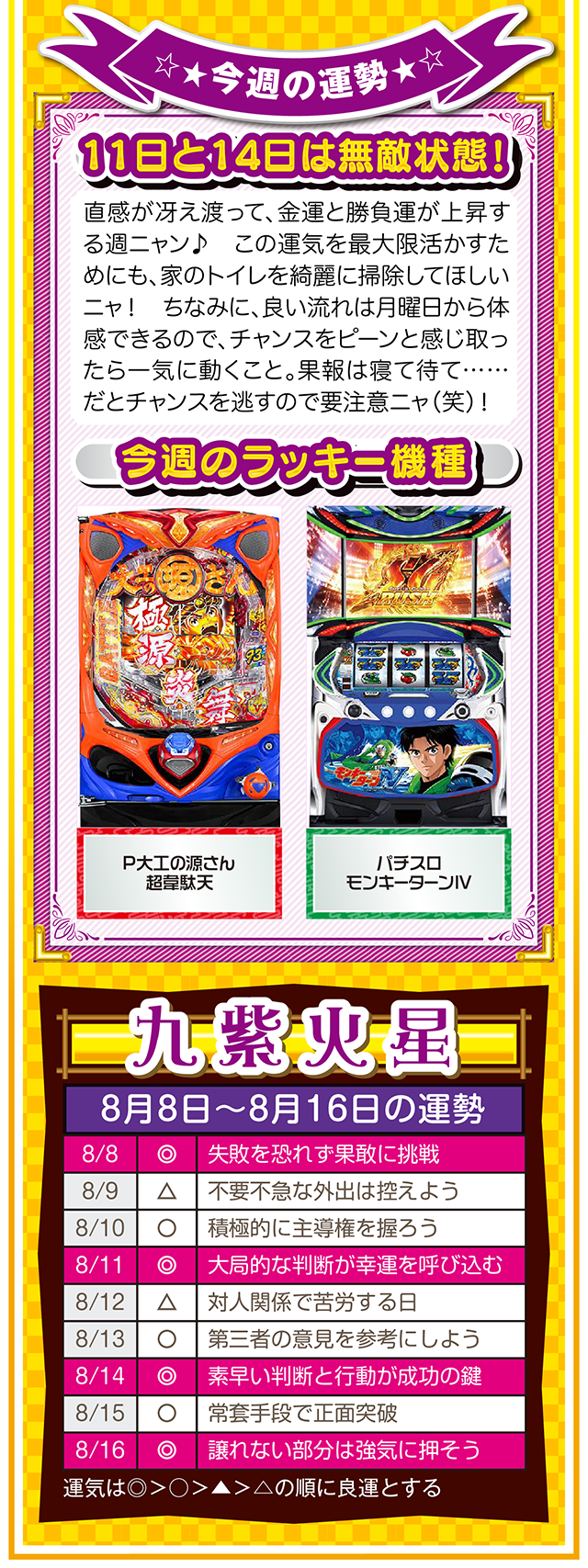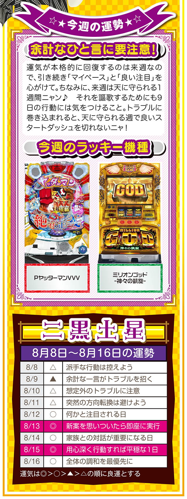 一発逆転を狙いたい気持ちもわかるけど、それを狙うのならリスクも必ず背負うこと。また、偶然運が訪れるタイミングは予測不能ということも覚えておいてほしいニャン……というわけで早速、8月10日から16日の1週間を鑑定ニャ(必然運が大切と言いながら、サマージャンボをキッチリ12000円分購入したフォー・チュンチュンが、今週もオマケとして8日と9日の運勢も鑑定したニャン♡)!