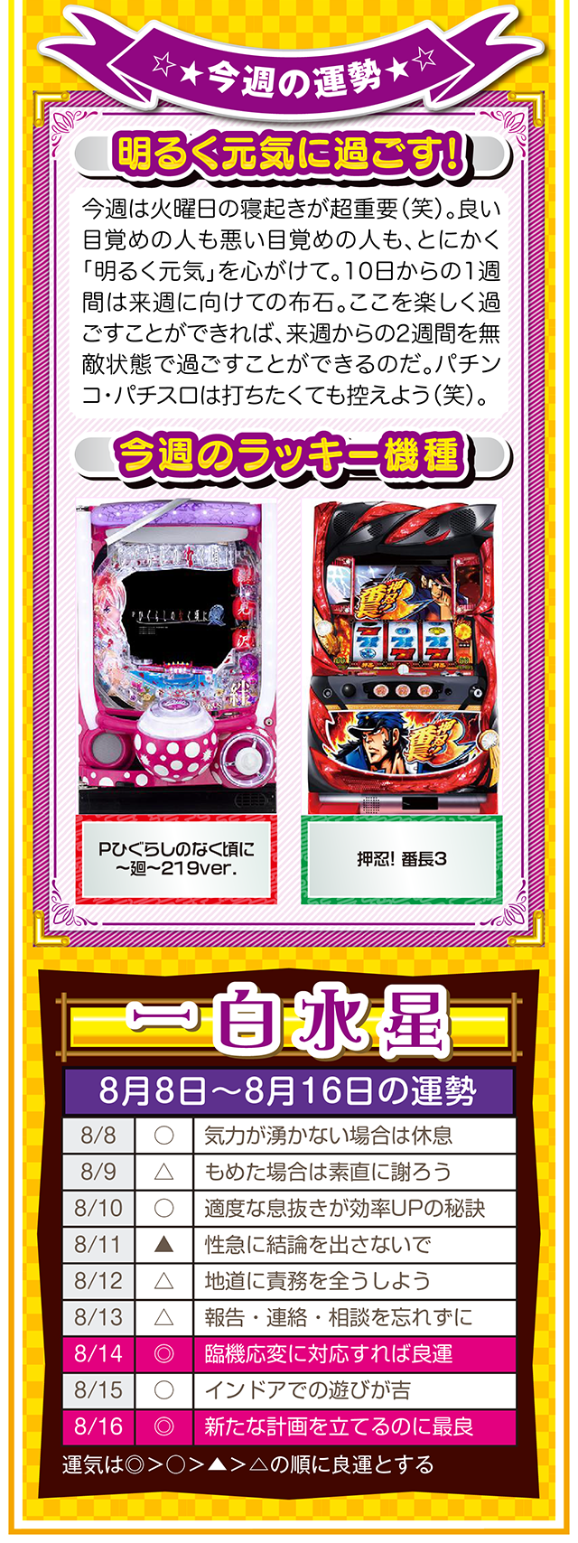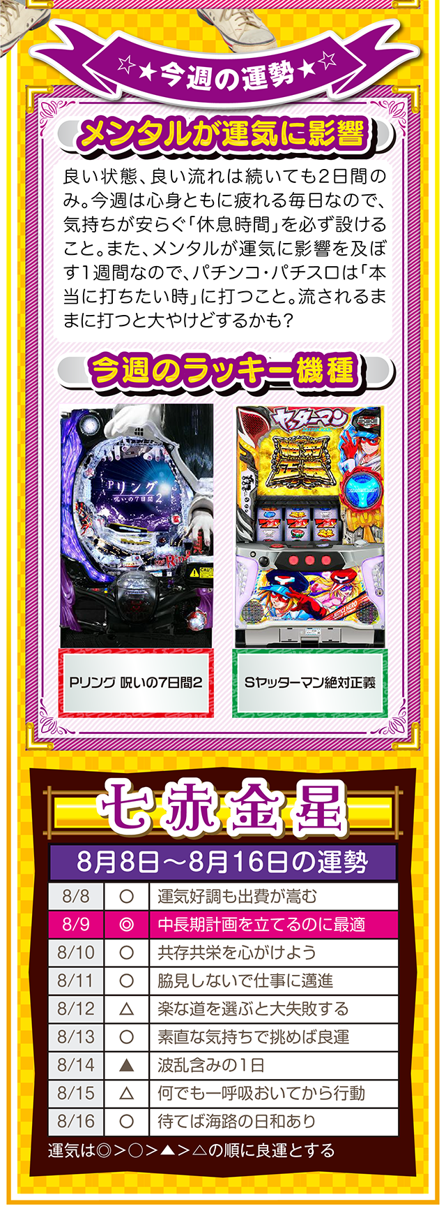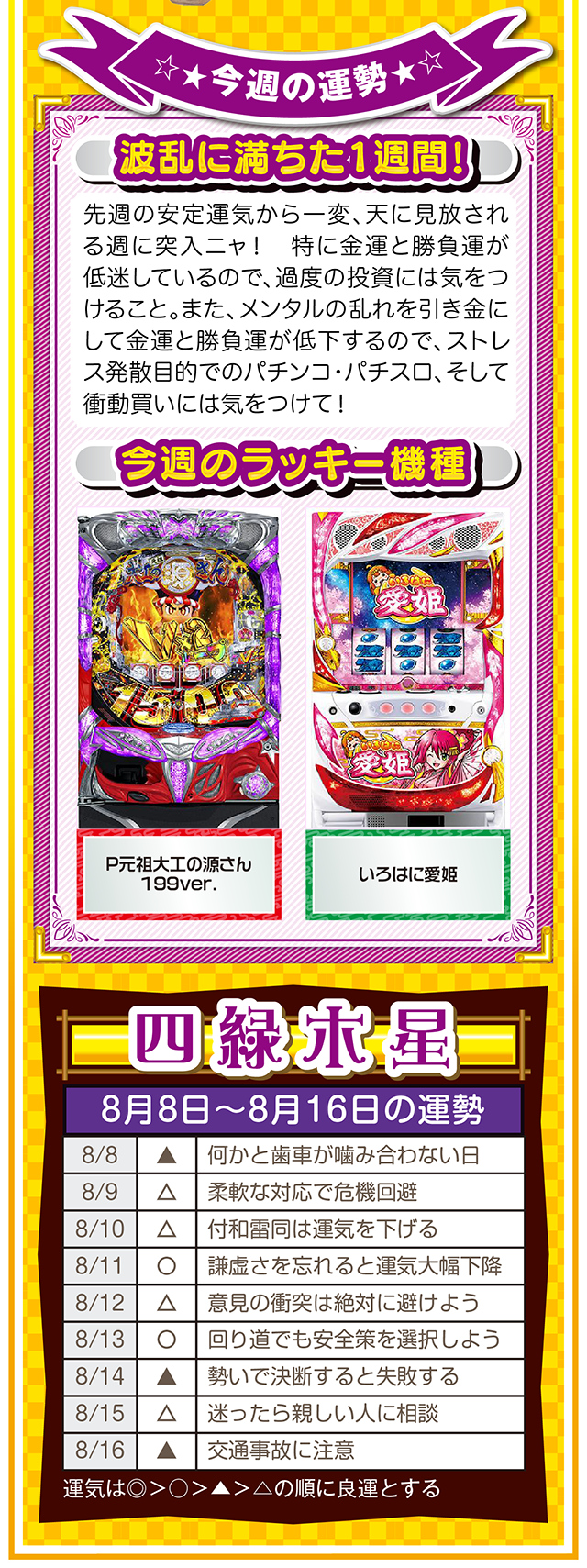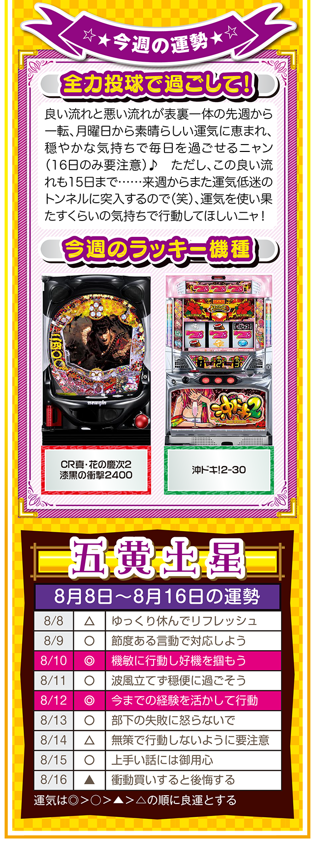 一発逆転を狙いたい気持ちもわかるけど、それを狙うのならリスクも必ず背負うこと。また、偶然運が訪れるタイミングは予測不能ということも覚えておいてほしいニャン……というわけで早速、8月10日から16日の1週間を鑑定ニャ(必然運が大切と言いながら、サマージャンボをキッチリ12000円分購入したフォー・チュンチュンが、今週もオマケとして8日と9日の運勢も鑑定したニャン♡)!