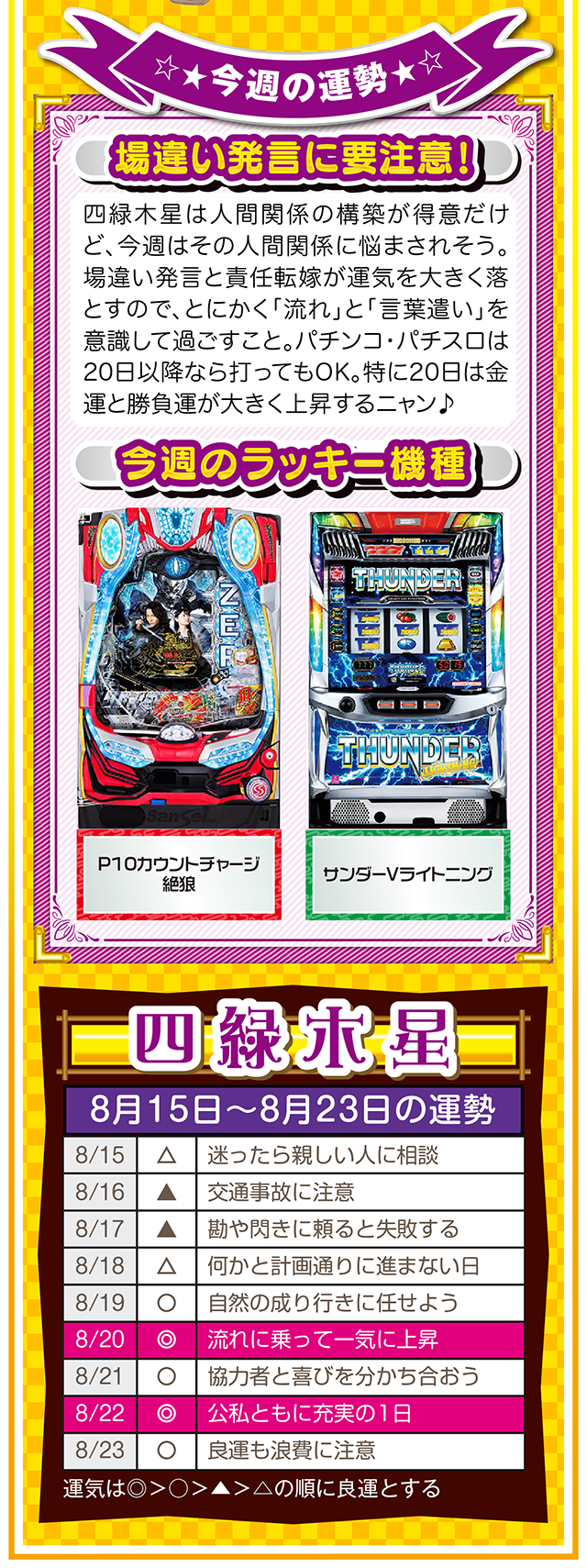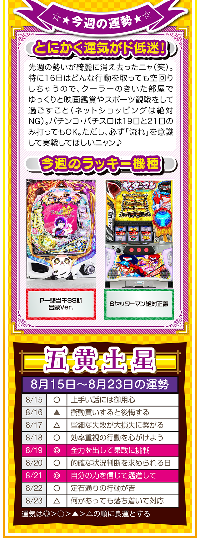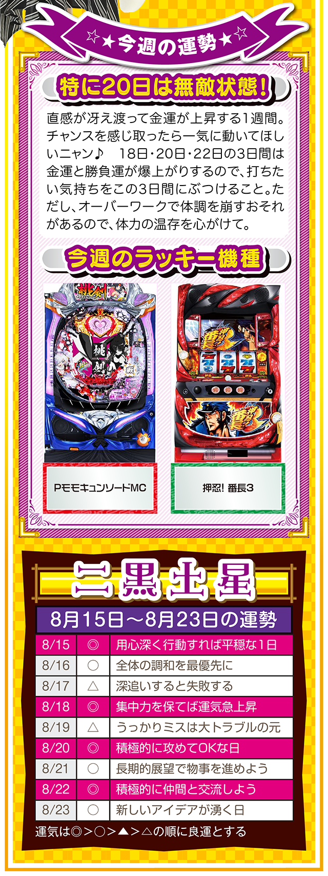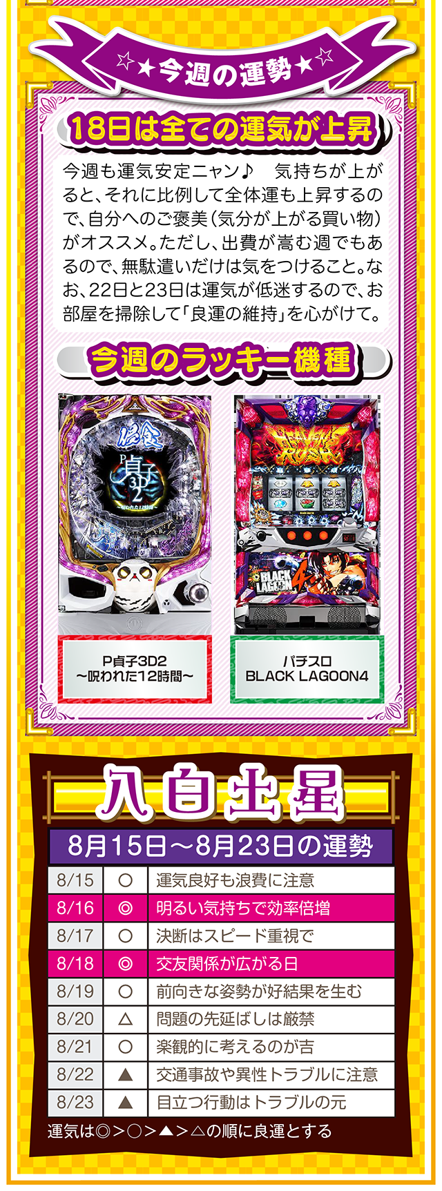 これがツキと流れをつかむ奥義であり、幸せに過ごすための第一歩ニャン……というわけで早速、8月17日から23日の1週間を鑑定ニャ(「男って自分勝手な人間ばかりじゃね?」と過去の男性遍歴を振り返りつつ、今週もオマケとして15日と16日の運勢も鑑定したニャン♡)!