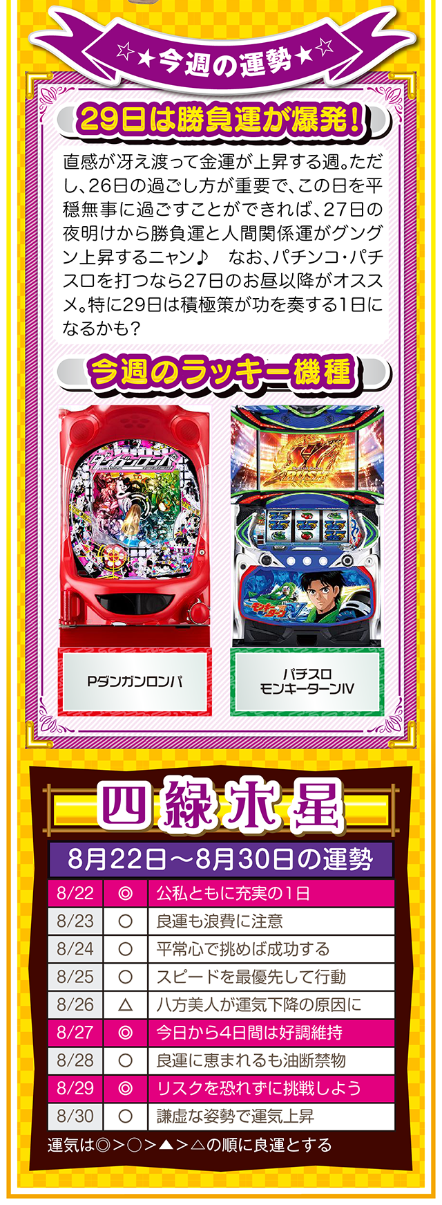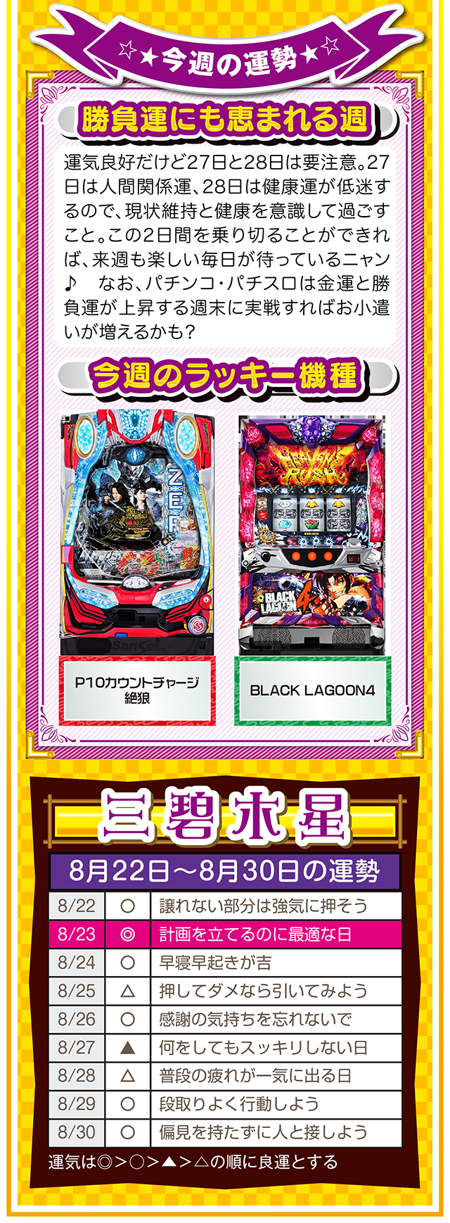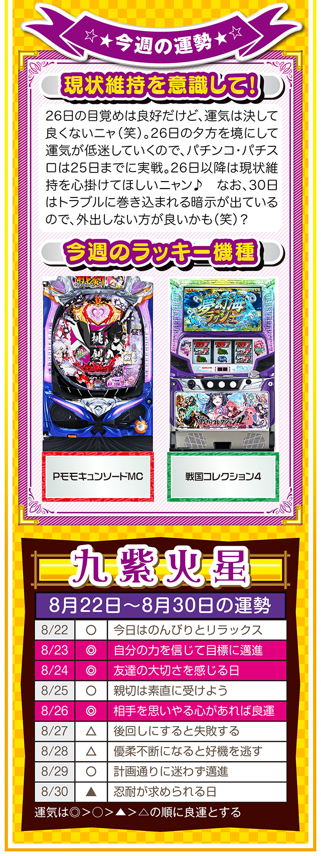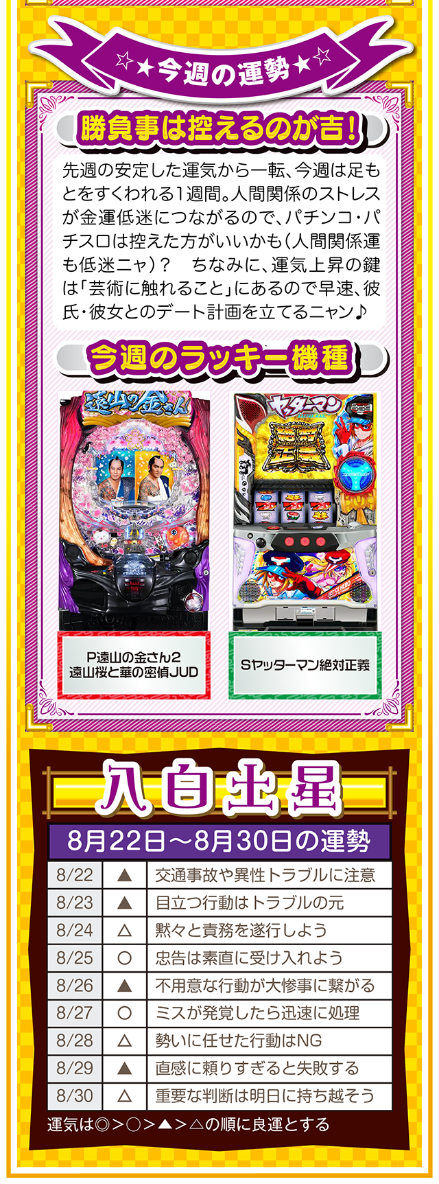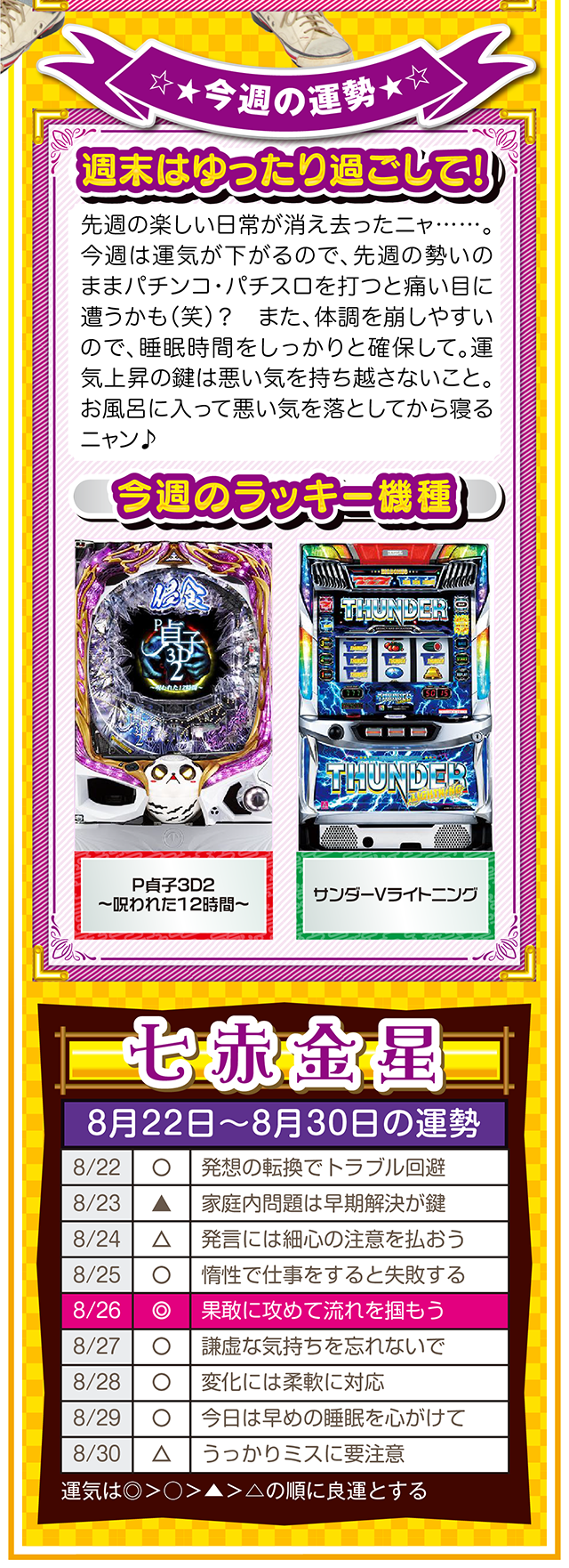 自分の価値観で生きない、自分の好みを押しつけない、自分のためだけに生きない……この3つを意識するだけで世界は大きく変わり、運とかツキにも恵まれるようになる。また、思いやりは言葉ではなく態度で示すことも忘れないでほしいニャン……というわけで早速、8月24日から30日の1週間を鑑定ニャ(男性の価値観だけは絶対に変えたくないフォー・チュンチュンが、今週もオマケとして22日と23日の運勢も鑑定したニャン♡)!